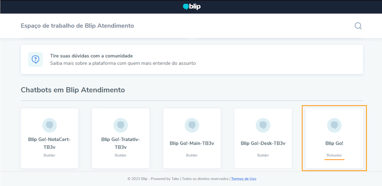 Acceso al portal Blip: https://blipatendimentotrial.blip.ai/applicationSelecciona el builder con la clasificación de Enrutador, igual a la imagen a continuación.