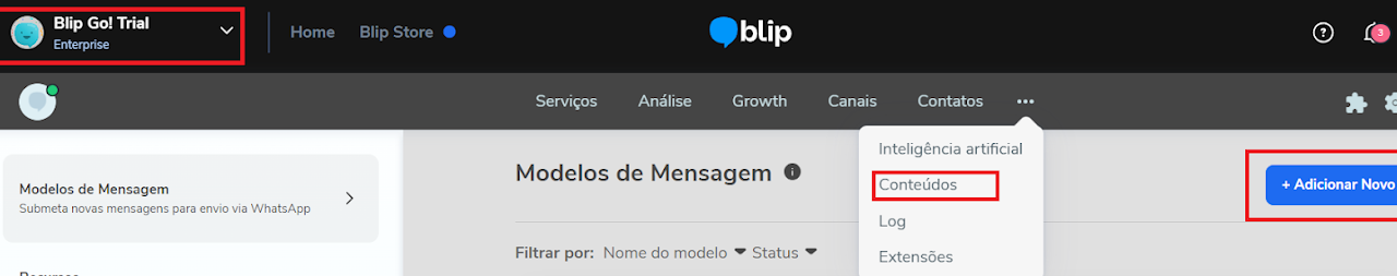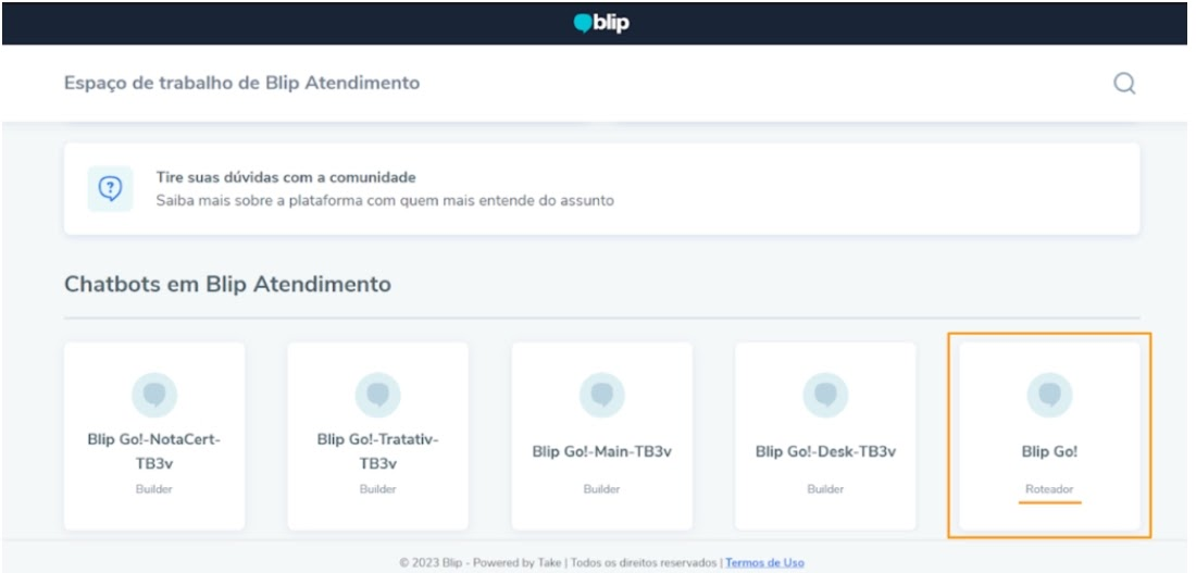 Para crear una plantilla de mensaje activo, accede al Blip Portal mediante el enlace https://blipatendimentotrial.blip.ai/application y selecciona el bot enrutador: