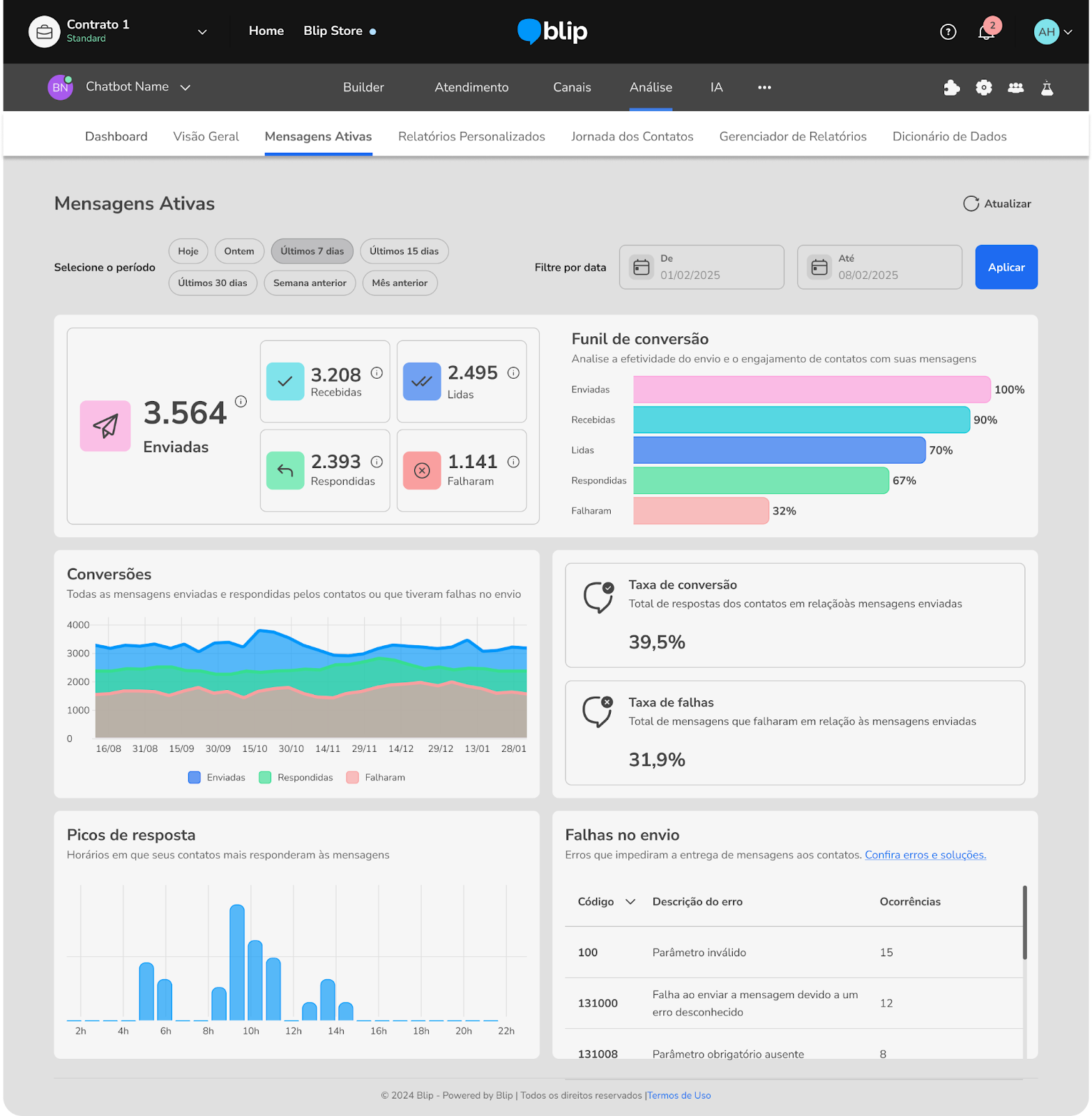 El nuevo informe Mensajes activos, disponible en la pestaña Análisis de Blip, fue creada para ofrecer una vista completa, clara y actualizada del rendimiento de los mensajes enviados activamente por los chatbots.