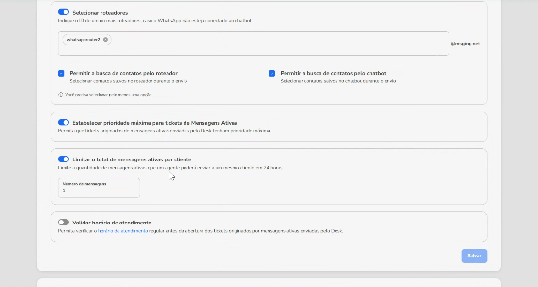 Ahora es posible configurar un límite para el número de mensajes activos que un agente puede enviar al mismo contacto en un intervalo de 24 horas, directamente desde Blip Desk.