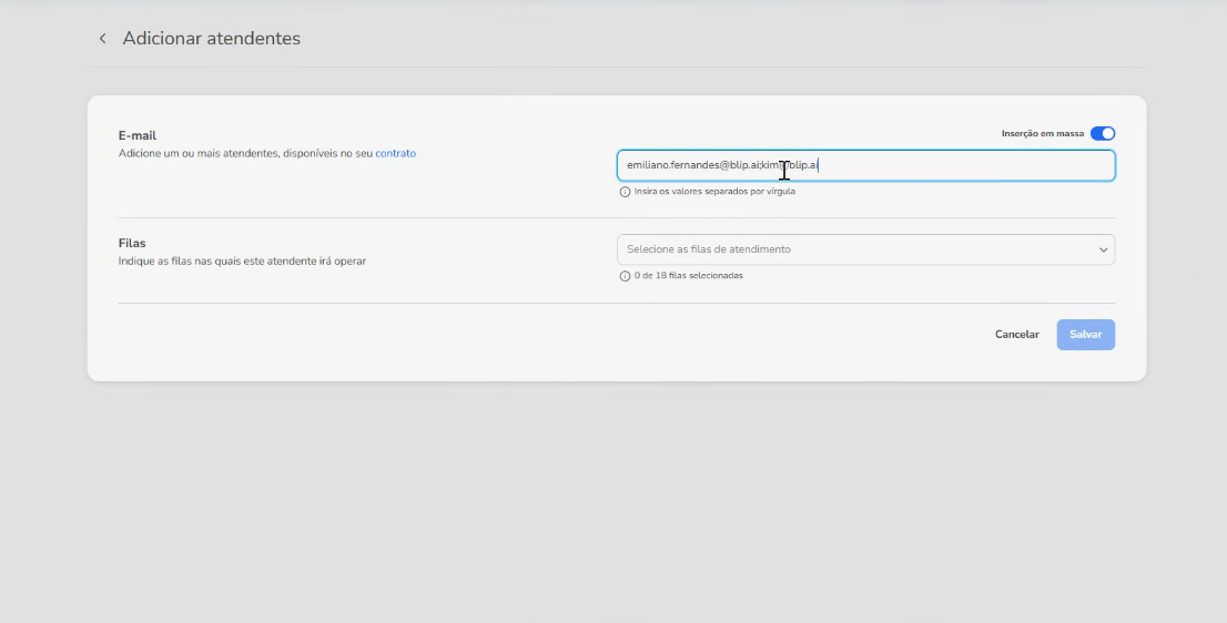 Anteriormente, el Portal Blip no permitía el registro masivo de agentes para las cuentas de los planes STARTUP, LITE, PLUS y SUPER, ya que se realizaba una verificación automática de la cantidad de usuarios contratados, lo que impedía que se validaran múltiples correos electrónicos al mismo tiempo. Esto hacía que el proceso fuera más lento y operativo.