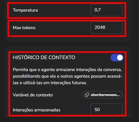 En esta sección, puedes personalizar tu AI Agent para que se adapte a tus necesidades. Elige el modelo de lenguaje (LLM), define la temperatura y la cantidad máxima de tokens, ingresa las instrucciones iniciales del agente, entre otras opciones.