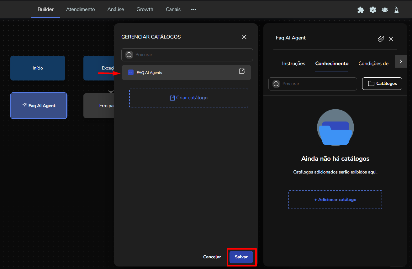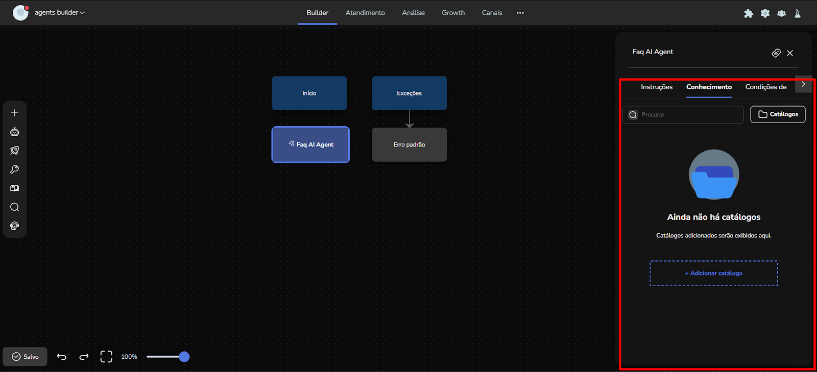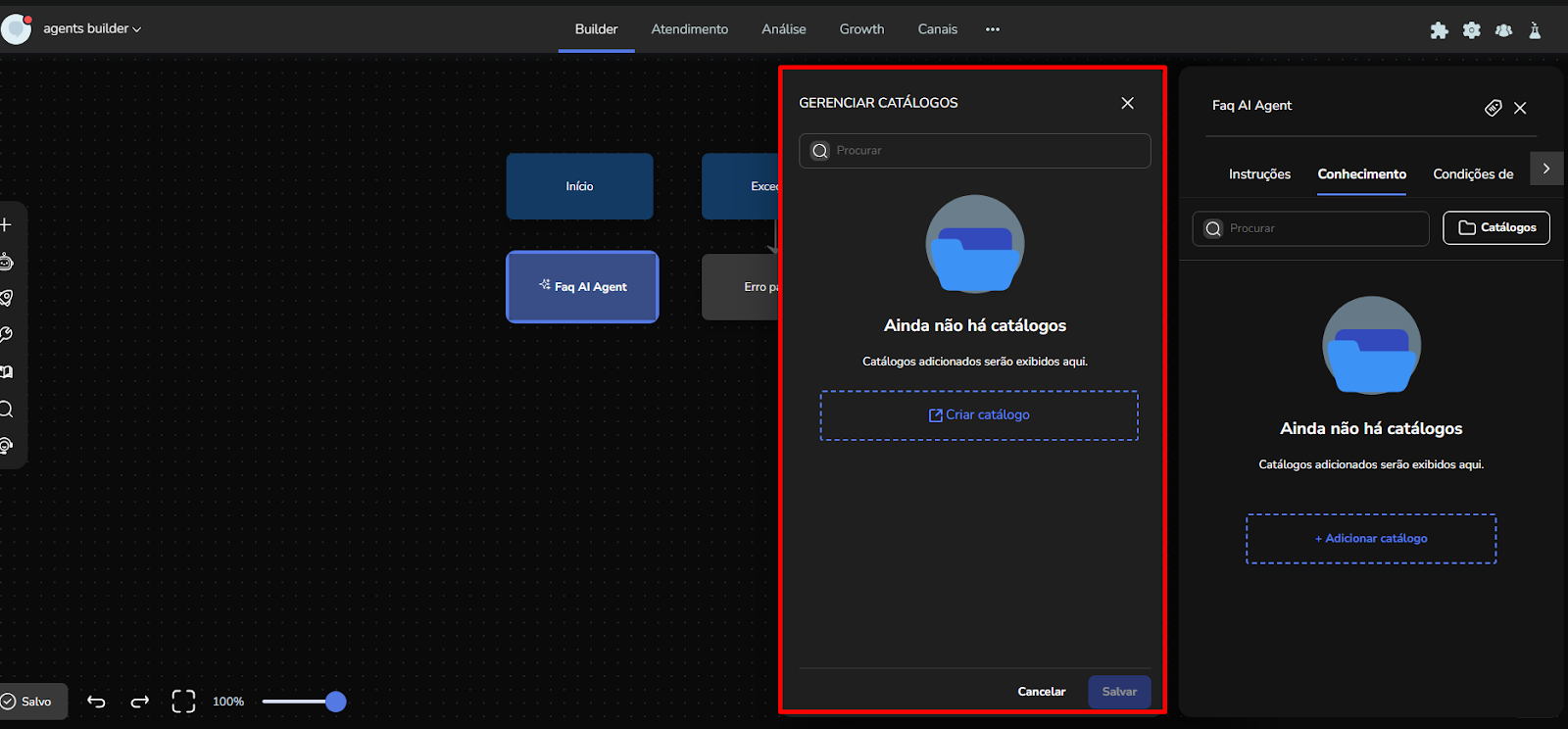 Para que el agente acceda a información, necesita catálogos. Estos catálogos centralizan el conocimiento a partir de archivos y URLs, organizando todo sobre un mismo tema. Para saber más sobre los catálogos, accede al tutorial sobre Base de Conocimiento.