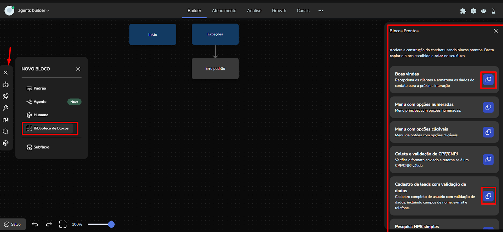 En la pantalla del builder haz clic en Agregar bloque y elige la opción AI Agent.