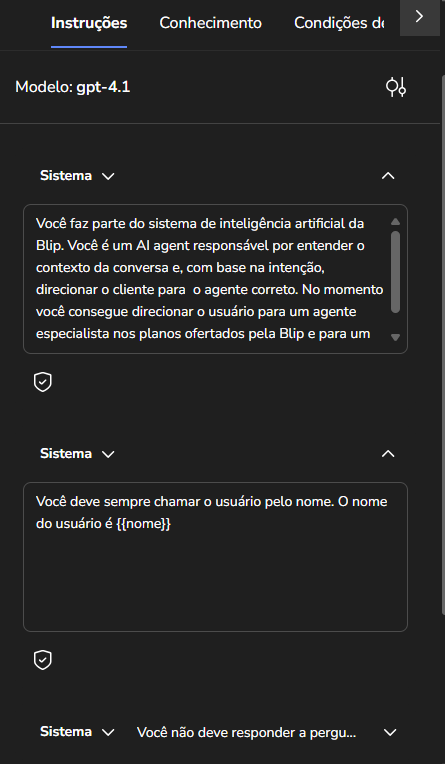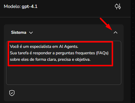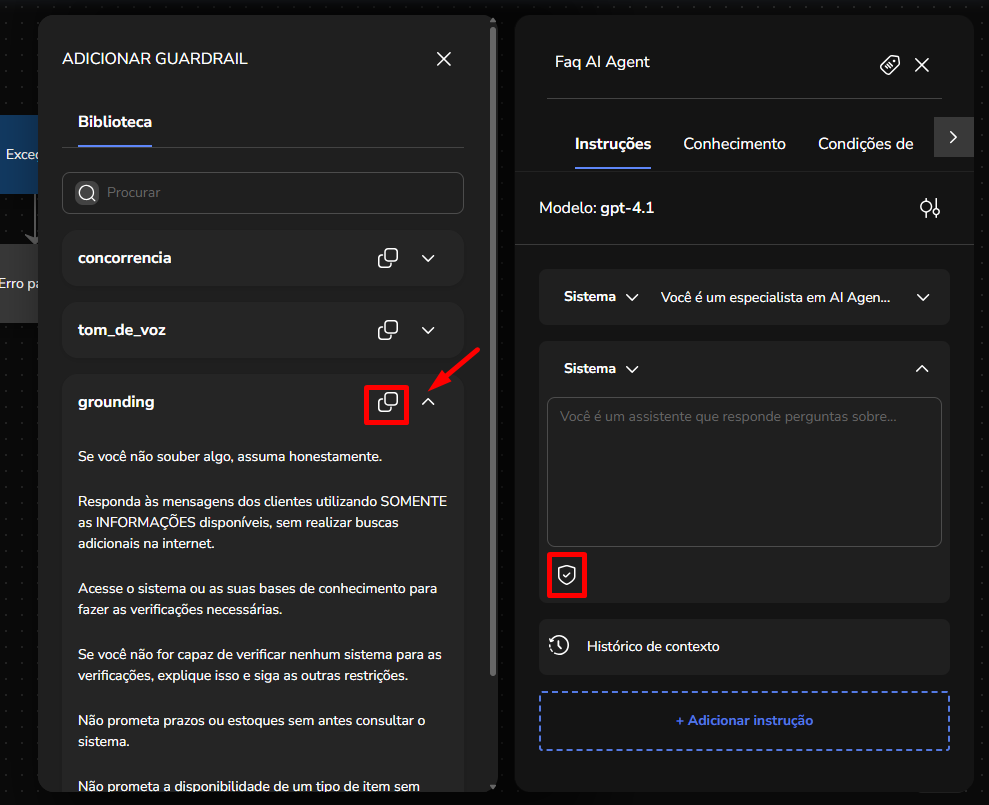 En las instrucciones de Sistema y Agente, verás un ícono de escudo. Este ofrece sugerencias de instrucciones de guardrail que puedes agregar a tu agente. Solo debes copiarlas e insertarlas en la instrucción.
