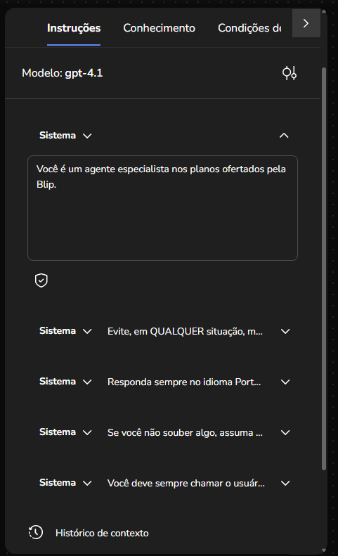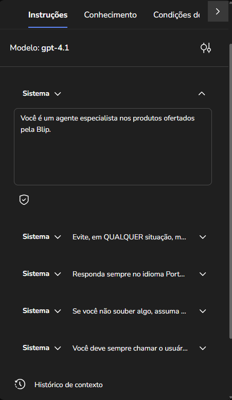 Aún en la pestaña Instrucciones, es posible configurar instrucciones para el AI Agent. Para cada instrucción, es posible seleccionar su nivel, pudiendo elegir entre: Usuario, Agente, Sistema, Tool, Variable. Vamos a revisar cada uno: