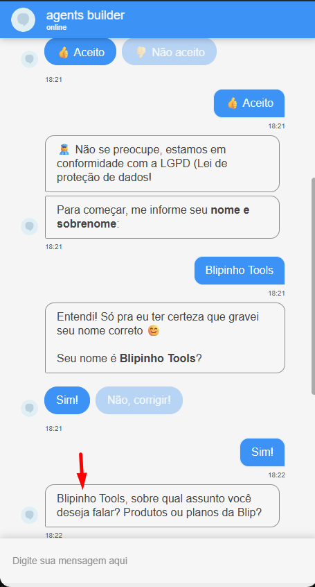 Para comenzar, vamos a agregar los bloques determinísticos que darán la bienvenida y recopilarán el nombre del usuario. Para ello, copiaremos bloques listos de la Biblioteca de bloques y los adaptaremos a nuestro ejemplo.