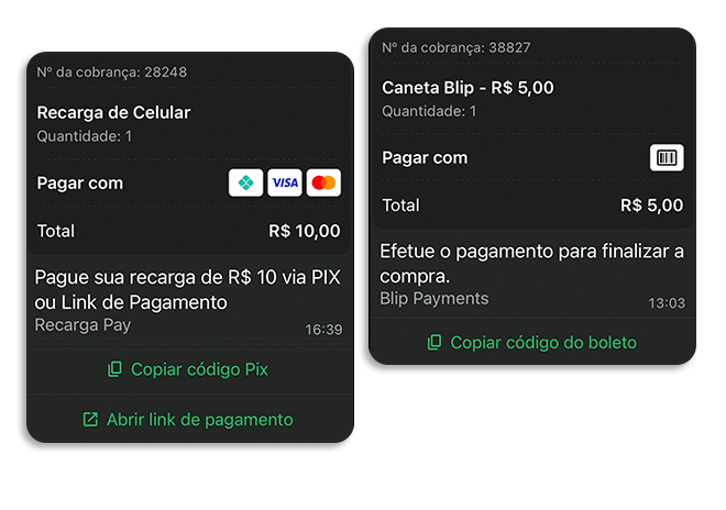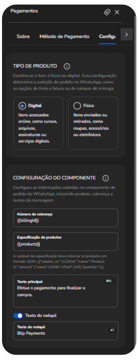 Importante: El bloque de pagos solo organiza y muestra las opciones de pago en la conversación. La generación y el procesamiento del cobro son responsabilidad del adquirente o institución de pago utilizada. Puede usar proveedores propios o integrar soluciones de Blip, mientras que el bloque solo presenta las informaciones dentro de la jornada conversacional.