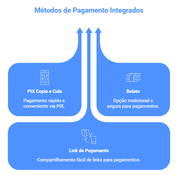 La imagen de arriba demuestra un escenario ilustrativo de aplicación del Bloque de Pagos en un flujo automatizado. Utilizando la opción de Pix Copia y Pega y Link de Pago como métodos de pago.