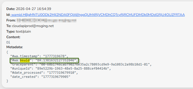 Actualización del canal WhatsApp - Usernames, BSUID y nuevos IDs 30 de abril de 2026 12:47 Actualización Índice: Introducción Cronograma Empresas - Cómo adoptar o reservar un username Contactos - Identificación de BSUID Visión general Dónde encontrar el BSUID - Metadata de los mensajes Propiedades disponibles Premisas Cómo extraer la información del metadata Identificación interna de contactos en Blip Visión general Evolución del campo contact.identity Acciones necesarias y posibles impactos Principales recomendaciones IntroducciónConforme anunciado por Meta recientemente, el modelo de identificación de los contactos en WhatsApp Business está evolucionando. Con el objetivo de la privacidad de los usuarios, Meta está introduciendo Usernames en WhatsApp. Documentación técnica oficial de Meta.La adopción de usernames es opcional tanto para el usuario final como para las empresas. En caso de que el usuario final adopte un username, sin embargo, su número de teléfono ya no será compartido, siendo exhibido apenas el username y otros IDs técnicos relacionados. Las empresas, sin embargo, aunque hayan adoptado el username, continuarán exhibiendo el número de teléfono registrado en su cuenta de WhatsApp.Además de la introducción de usernames en WhatsApp, cada username está asociado a un BSUID (Business-Scoped User ID), un identificador único entre el usuario y una empresa específica que permite el envío de mensajes en WhatsApp incluso cuando el número de teléfono del usuario no está disponible. A diferencia del número de teléfono, que es siempre el mismo número independiente de la empresa con la cual aquel contacto interactúa, el BSUID de un mismo usuario será único y diferente para cada una de las empresas con las que el contacto interactúe (basado en el Business Manager/Business Portfolio de la empresa). Cronograma Junio/2026: la funcionalidad de Usernames será liberada por Meta para pruebas en algunos países Julio/2026: rollout para una segunda muestra de países de prueba definidos por Meta Agosto/2026: expectativa de lanzamiento global en GA por Meta Todos los hitos descritos anteriormente pueden ser alterados previamente con base en las definiciones y directrices de la propia Meta. Empresas - Cómo adoptar o reservar un username Al igual que el usuario, la empresa también podrá adoptar el uso de un username o incluso reservar un username para sus cuentas de WhatsApp. Esta adopción, sin embargo, aún no está disponible. Actualizaremos esta documentación tan pronto como sea posible para reflejar este proceso. Contactos - Identificación de BSUID Visión general Todos los contactos, independientemente de si adoptan un username o no, pasarán a venir con el nuevo identificador creado por Meta para WhatsApp, el BSUID. El número de teléfono del contacto/usuario final solo será informado por Meta en las interacciones B2C si: El contacto no ha adoptado un username El número de teléfono del contacto está registrado en la Lista de Contactos del business (funcionalidad lanzada por Meta en abril/2026 y nativamente habilitada para registrar datos de los contactos que interactúan con el business) Dónde encontrar el BSUID - Metadata de los mensajes El BSUID es puesto a disposición por Blip en el metadata de los mensajes (mensajes, notificaciones y ecos, en casos de activaciones de Coexistencia) y estará presente en el objeto metadata de cada envelope (mensajes, notificaciones o eco) siempre que estas informaciones sean enviadas a Blip por Meta/Whatsapp en los webhooks correspondientes. Para consultar la información del BSUID vía metadata: Acceda al bot deseado en el Portal Acceda al menú superior de Blip Haga clic en el icono de tres puntos (...) Seleccione la opción Log en el menú Localice el objeto metadata dentro del envelope del mensaje Propiedades disponibles Dentro del metadata, los identificadores estarán disponibles a través de las siguientes propiedades: #wa.bsuid: Identificador único del usuario (BSUID) #wa.parentId: Identificador del usuario compartido entre diferentes empresas (cuando sea aplicable) Premisas La propiedad #wa.parentId será incluida solo en los casos en que Meta autorice esta feature para la empresa. Importante: el pedido de activación del Parent ID debe ser realizado por la empresa a Meta a través de un ticket. Todos estos campos dependen de la disponibilidad por parte de Meta/Facebook; por lo tanto, su presencia está condicionada a los datos recibidos por el canal en Blip. Estas informaciones permiten rastrear e interactuar con usuarios de forma consistente, incluso sin acceso directo al número de teléfono. Cómo extraer la información del metadata Para extraer estas informaciones, usted debe definir dos acciones de salida en el bloque Inicio del Studio: 1. Definir variable de metadata Defina una variable con los siguientes parámetros: Nombre de la variable: metadata Valor: {{input.message@metadata}} 2. Ejecutar script Ejecute un script para obtener solo el valor del #wa.bsuid presente en este metadata. Configuración del script:function run(metadata){ metadata= JSON.parse(metadata); return metadata["#wa.bsuid"]; }Se presentará el alcance del script, conforme a la imagen de abajo:¡CONSEJO! Utilice el registro de eventos para enriquecer la captura de datos y hacerlos más presentables a partir de informes personalizados.Identificación interna de contactos en Blip Visión general Con el fin de minimizar el impacto para nuestros clientes, Blip crea una abstracción que analiza los datos recibidos de Meta y realiza el relacionamiento con un contacto existente o crea un nuevo contacto cuando es necesario. Con la evolución del modelo de identificación de WhatsApp, Blip también está evolucionando la forma en que los contactos son identificados en la plataforma. Evolución del campo contact.identity Actualmente, el campo contact.identity (disponible en la biblioteca de variables de Blip) se completa con 