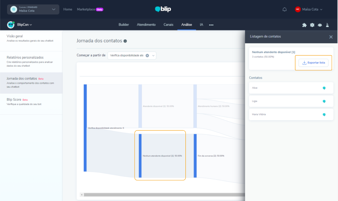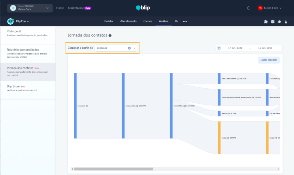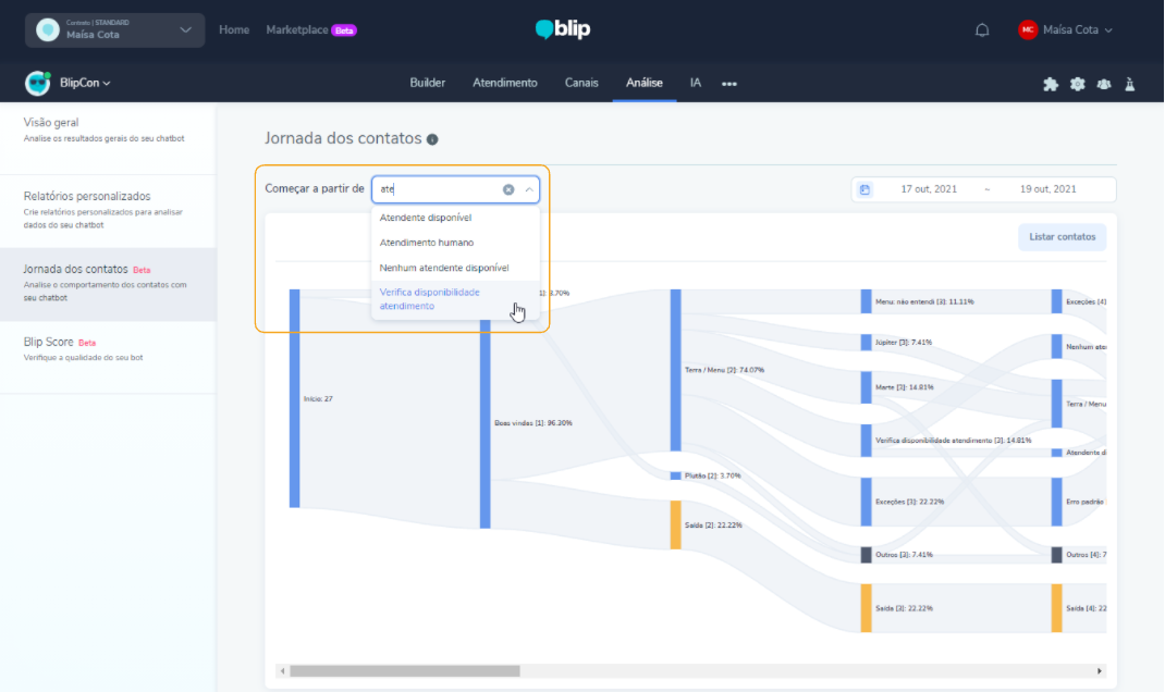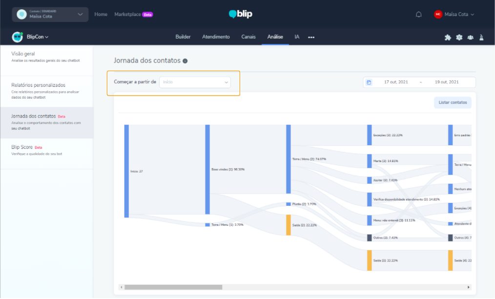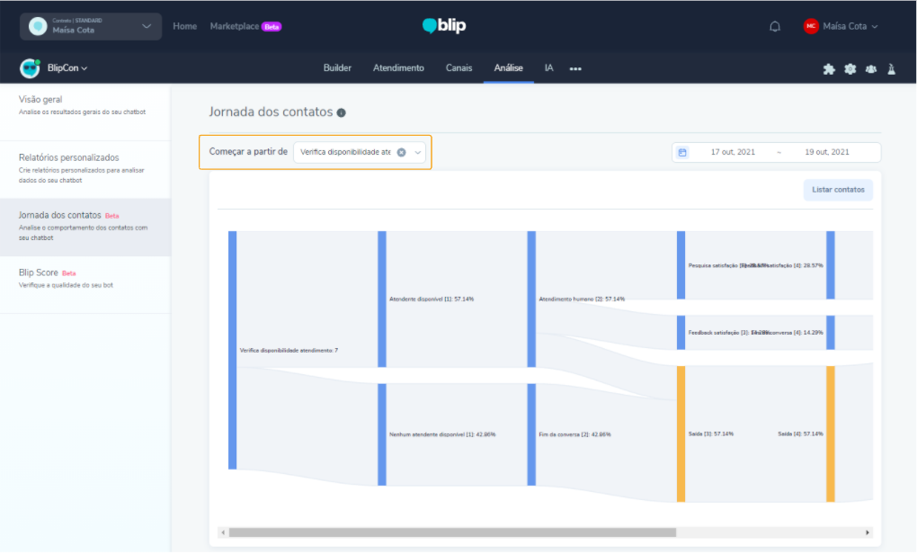 Para acceder al Recorrido de los contactos, haga clic aquí y confirme el inicio de sesión en la plataforma Blip. Seleccione el chatbot, ingrese en Análisis y, a continuación, Recorrido de los contactos, en el menú lateral izquierdo.