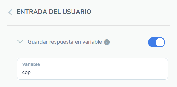- En el texto ingresado por el usuario, haga clic en el texto y habilite la opción: “GUARDAR RESPUESTA EN VARIABLE”, luego escriba un nombre para esta variable. De esta forma, está almacenando la respuesta tecleada por el usuario, para no perder estos datos.