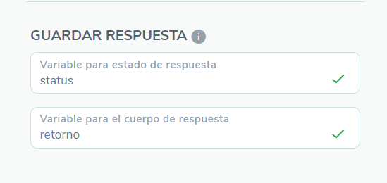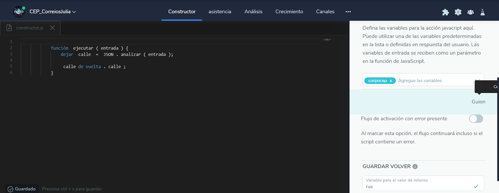 Guarde la variable de respuesta en el campo “ENTRADA VARIABLES”, como en el ejemplo de abajo con: “corpocep”, para que sea devuelta en el chat. Las variables de entrada se reciben como parámetros en la función de JavaScript.