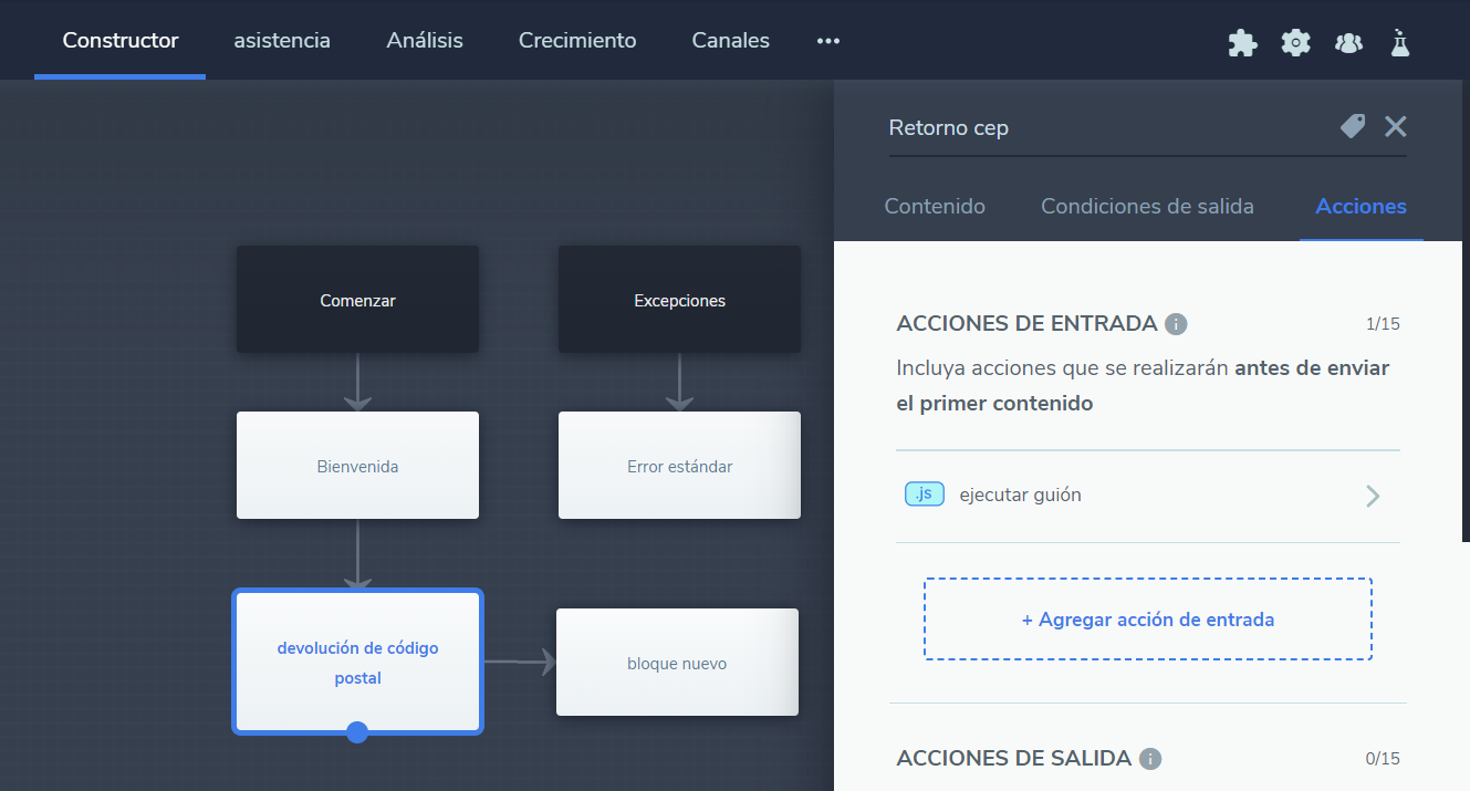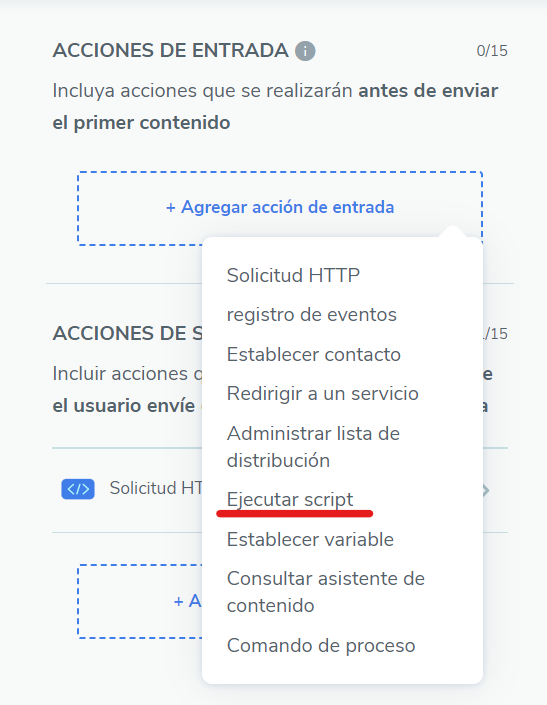 7) Después de eso, en el bloque donde tendremos la respuesta del bot de acuerdo con la respuesta de la solicitud HTTP, haga clic en “ACCIONES” → AGREGAR ACCIÓN DE ENTRADA → EJECUTAR SCRIPT
