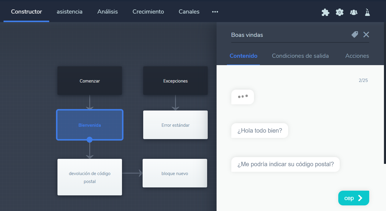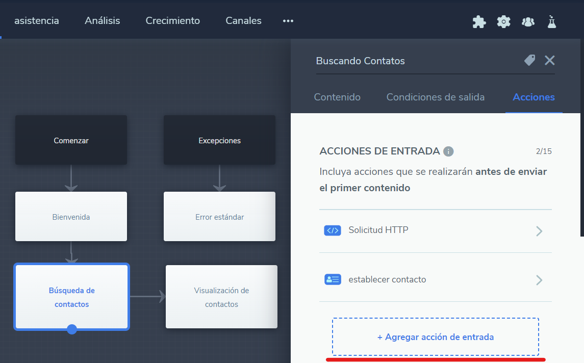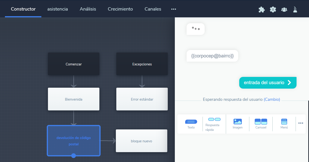 1) El primer paso es CREAR SU FLUJO DE CHATBOT e IDENTIFICAR EN QUÉ BLOQUE EL USUARIO INGRESARÁ LA INFORMACIÓN que se obtendrá de la API.