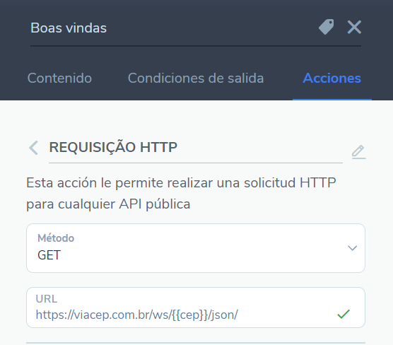 Usaremos los métodos GET y POST como ejemplo para realizar una solicitud HTTP dentro de Blip y para eso necesitamos completar algunos campos indicando lo que queremos en nuestra solicitud.