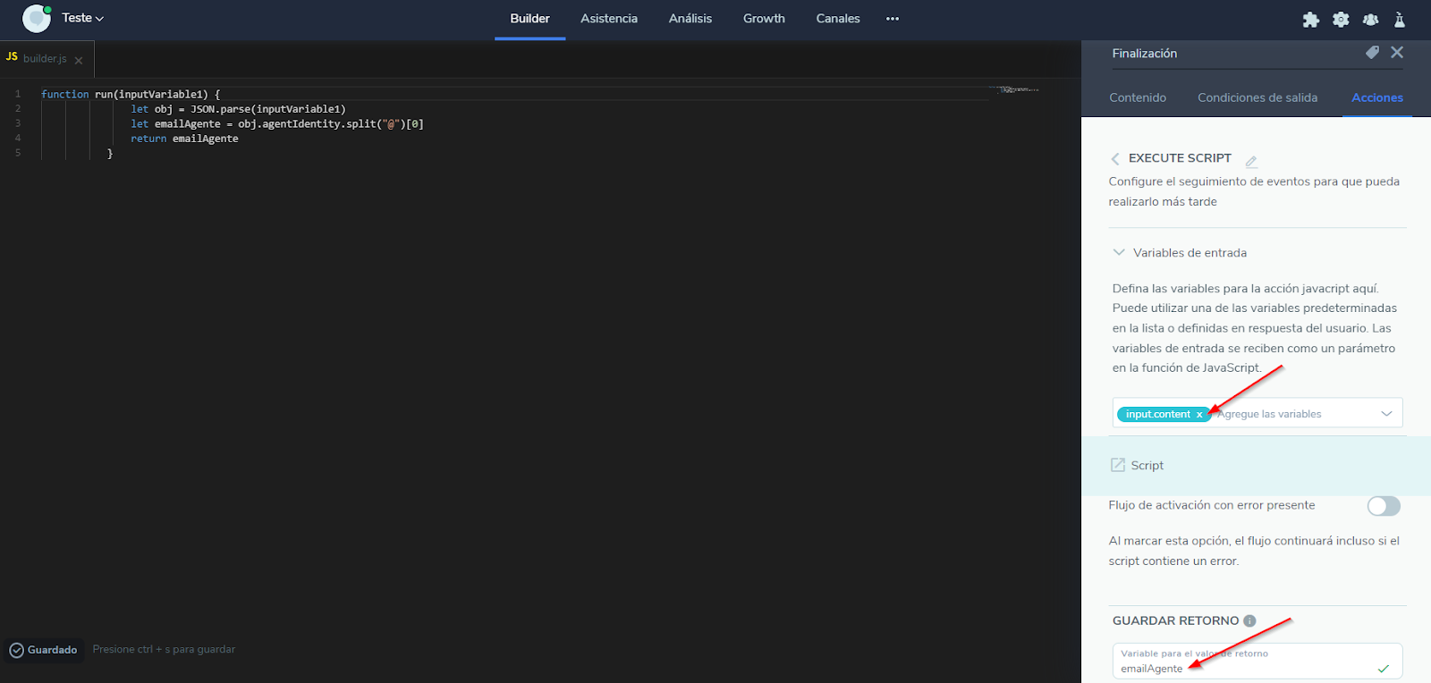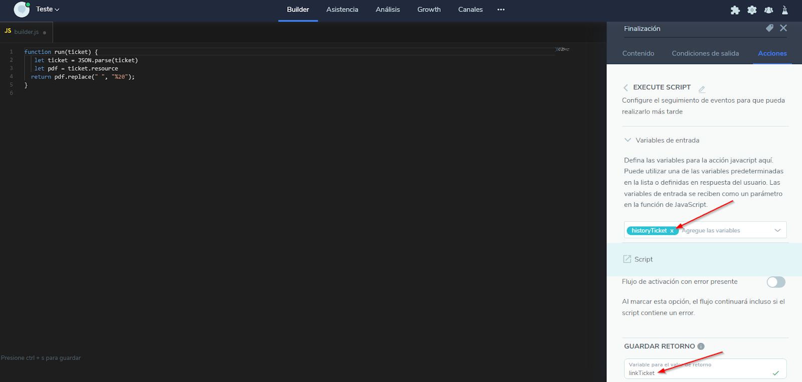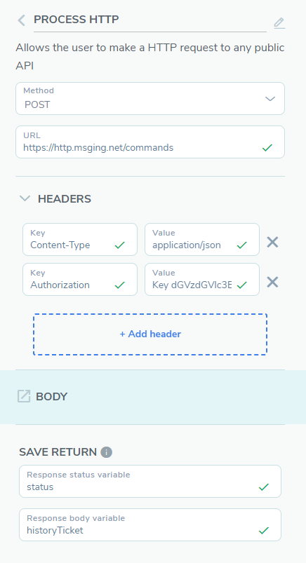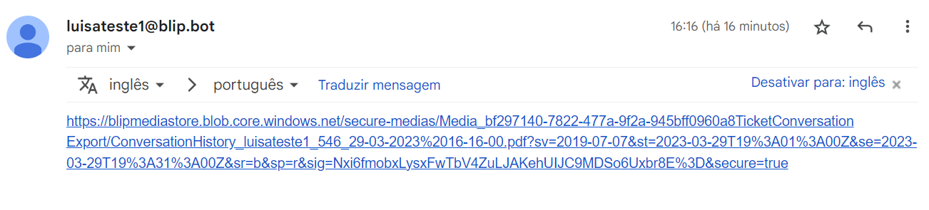 Envio de histórico do ticket para o e-mail do atendente 12 de março de 2024 14:46 Atualizado Ao final de cada atendimento humano, é possível recuperar todo o histórico do atendimento utilizando algumas ações dentro do fluxo e enviar esse histórico para o e-mail do atendente. Para isso, basta seguir os passos abaixo: No bloco obrigatoriamente após o bloco de Atendimento Humano, você deve setar 4 ações de entradas. A primeira ação será a de Executar Script para pegar o e-mail do atendente que realizou o atendimento do ticket, já no formato correto. Na variável de entrada, você irá inserir a variável input.content. Além disso, você deverá salvar o retorno em uma nova variável, emailAgente. No corpo do script, insira o demonstrado abaixo: function run(inputVariable1) {let obj = JSON.parse(inputVariable1)let emailAgente = obj.agentIdentity.split("@")[0]return emailAgente} Agora, para a segunda ação iremos criar uma requisição HTTP. Insira o método, url de comando, os cabeçalhos e as variáveis de retorno, conforme exibido abaixo: Observação: Para saber qual é sua Key de autenticação utilizada na chave Authorization, clique aqui. Observação: Utilize a url com id do contrato para consumir os endpoints informados abaixo, sua performance e funcionamento podem ser impactados caso não esteja com id do contrato, portanto, é fundamental utilizar a url com o id do contrato para utilizar as requisições http! POST https://{{contractid}}.http.msging.net/commands Content-Type: application/jsonAuthorization: Key {YOUR_TOKEN} No corpo da requisição, insira o demonstrado abaixo: { "id": "{{random.guid}}", "to": "postmaster@desk.msging.net", "method": "GET", "uri": "/ticket/{{input.content@id}}/history-file"} Para a terceira ação de Executar Script, na variável de entrada, você irá inserir a variável historyTicket. Além disso, você também deverá salvar o retorno em uma nova variável, linkTicket. No corpo do script, insira o demonstrado abaixo: function run(ticket) { let ticket = JSON.parse(ticket) let pdf = ticket.resource return pdf.replace(" ", "%20");} Na quarta ação de requisição HTTP, configure desta forma: Novamente, para saber qual é sua Key de autenticação utilizada na chave Authorization, clique aqui. POST https://http.msging.net/messagesContent-Type: application/jsonAuthorization: Key {YOUR_TOKEN} No corpo da requisição: { "id": "{{random.guid}}", "to": "{{emailAgente}}@mailgun.gw.msging.net", "type": "text/plain", "content": "{{historyTicket@resource}}"} Observação: A variável “emailAgente” utilizada na requisição será a mesma que salvou como retorno na execução do script. Retorno do e-mail: Abra todo o conteúdo do e-mail em uma guia para visualizar o histórico: Informação complementar Os links das mídias no Blip expiram em 15 minutos, sendo assim, faça o download do histórico em seu computador caso queira visitá-lo novamente. Para mais informações, acesse a discussão sobre o assunto em nossa comunidade ou os vídeos no nosso canal. 😃 Artigos relacionados Como salvar dados do atendimento humano Histórico de atendimento Como salvar o histórico de atendimento humano via Integração do Blip com Google Drive Envio de Mensagens Ativas do WhatsApp no Blip Desk Histórico de Atendimento para atendentes, no Blip Desk