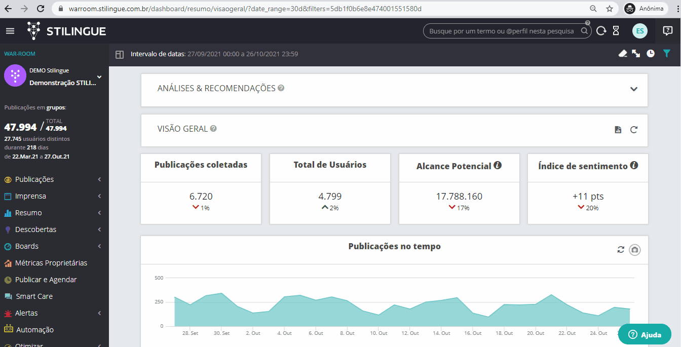 O que é a STILINGUE? 21 de janeiro de 2026 14:53 Atualizado Índice: Introdução IA STILINGUE IntroduçãoUsuários conectados. Entender como público e potenciais clientes se manifestam nos meios digitais é um dos papéis fundamentais da inteligência de mercado. Empresas de todos os ramos estão, cada vez mais, interessadas em se conectar com seus seguidores, saber o que falam de sua marca, se antecipar diante de possíveis crises, otimizar o atendimento em redes sociais e muito mais. A STILINGUE foi desenvolvida para coletar e organizar publicações na rede, para que a partir da tecnologia utilizada, sejam gerados insights. Isso permite o entendimento de comunidades e trazer a voz do cliente para o mundo.Você terá contato com uma plataforma construída visando entregar soluções estratégicas para o seu negócio. Com a STILINGUE, você faz pesquisas rápidas, personalizadas, extrai dados de sentimentos dos usuários, além de outros serviços para melhorar o social listening da sua empresa. E essas são só algumas das possibilidades que ajudam a impulsionar as ações da sua marca. IA STILINGUEA STILINGUE criou a primeira Inteligência Artificial (IA) para o português do Brasil, é pioneira nesse movimento e atua na assertividade e excelência dos insights gerados.Também entregamos IA com foco em espanhol e inglês! O conteúdo publicado na internet, e coletado por aqui, passa por um processo de entendimento das palavras, das imagens e do contexto, levando em conta expressões únicas da nossa língua. A IA está presente em várias áreas do nosso sistema - a exemplo dos Grupos Sugeridos, uma funcionalidade que oferece automaticamente sugestões de descritores e páginas relacionadas a marcas que você deseja monitorar: Acompanhe os conteúdos que irão te auxiliar no início da sua caminhada junto à STILINGUE. E para conhecer alguns cases de sucesso, análises utilizando a plataforma e novidades sobre nossos produtos, acesse o nosso blog. Para mais informações, acesse a discussão sobre o assunto em nossa comunidade ou os vídeos no nosso canal. 😃 Artigos relacionados Mensagens Ativas - Códigos de erro Pontuação Digital - Métricas Proprietárias FAQs Enviando dados para análise através de Webhooks Como agendar campanhas de mensagens ativas no WhatsApp