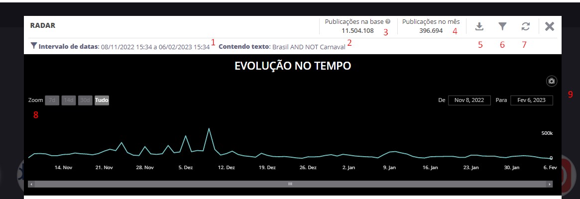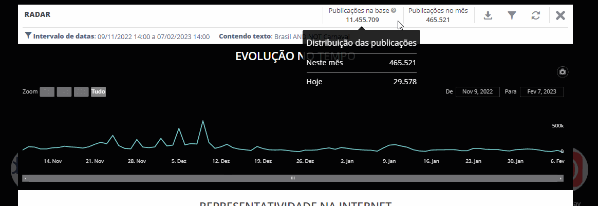 Evolução das publicações - Radar 21 de janeiro de 2026 13:32 Atualizado Índice: Introdução Ícones IntroduçãoPesquise por publicações sobre qualquer assunto utilizando o radar, que traz possibilidades de busca rápida e te ajudam em insights.A STILINGUE possui um tipo de pesquisa capaz de entregar milhares de publicações, de forma instantânea, de portais, redes sociais e outros canais disponíveis. Caso queira saber como acessar esses dados, leia o guia e tenha em mãos informações valiosas para estar sempre atualizado sobre o que se discute na internet. ÍconesEntenda o que os ícones dessa área apresentam: 1. Intervalo de datasAo selecionar a data no filtro avançado, o período em que a pesquisa foi feita é exibido. Caso não seja escolhido período, o intervalo de datas de 90 dias é considerado, ou seja, publicações que tenham sido feitas nos últimos 90 dias. Você também pode selecionar resultados anteriores pelo filtro, podendo escolher visualizar publicações feitas desde janeiro de 2018. 2. Contendo textoOs termos inseridos no campo inicial (ou nos Filtros Avançados) serão apresentados aqui. 3. Publicações na baseA base da STILINGUE utilizada no Radar é composta por buscas anteriores, feitas desde 2018. Portanto, os resultados trazidos nas buscas passam a alimentar a base do Radar e são exibidas quando existe relação entre o que foi pesquisado e o assunto da publicação. Aqui são mostradas quantas publicações existem nessa base (somente sobre o termo pesquisado), divididas entre mês e foram coletadas hoje: 4. Publicações no mêsAs publicações coletadas no mês atual são mostradas aqui. O filtro considera apenas os dias do mês, por exemplo: se eu pesquisar no dia 05/02, serão mostradas as publicações desde o dia 01/02 até o dia 05/02. Da mesma forma, se a pesquisa for feita no dia 30/04, será apresentado o resultado desde o dia 01/04. 5. Exportar relatório Exporte os gráficos dessa área. São consideradas as 20 primeiras publicações que aparecem na área para a exportação. Essa exportação é feita apenas no formato de imagem (PDF). 6. Filtros instantâneos Para acessar filtros mais completos e trazer resultados focados para a sua busca, clique no ícone. Caso queira saber mais sobre como melhorar a sua busca usando filtros, leia também o guia sobre Filtros Avançados. 7. Retornar ao Zoom inicial A opção de Zoom amplia os resultados do gráfico (item 8). Ao clicar aqui, o Zoom é retornado para a apresentação inicial. Evolução no último mêsA linha do gráfico mostra a evolução do termo no último mês. Ao passar a seta em cima da linha, é possível visualizar o número de publicações referente a cada mês. 8. ZoomAo clicar em um dos blocos (7 dias, 14 dias e 30 dias), o Zoom do gráfico de linhas é alterado e a visualização passa a ser referente aos dias selecionados. Nesse formato, o número total não será alterado, essa ferramenta apenas facilita a visualização conforme os dias escolhidos. Observação: quando o intervalo de data filtrado for dos "últimos 30 dias" ou for de uma data antiga que contenha um intervalo de 30 dias, o Zoom de "Tudo" e "30 dias" terão o mesmo comportamento, retornando o mesmo resultado. 9. DataO período analisado na busca possui o padrão de 90 dias. Ao alterar a visualização do período do filtro no Zoom (item 8), a data mostra o período analisado. Para mais informações, acesse a discussão sobre o assunto em nossa comunidade ou os vídeos no nosso canal. 😃 Artigos relacionados Filtros Avançados - Radar Envio de Mensagens Ativas do WhatsApp no Blip Desk Acesso - Radar Relatório de gráficos - Radar Visão geral do Blip Desk
