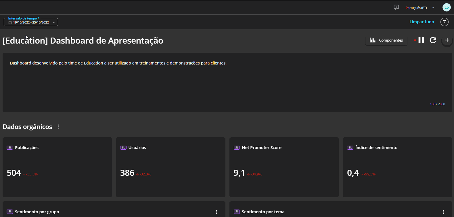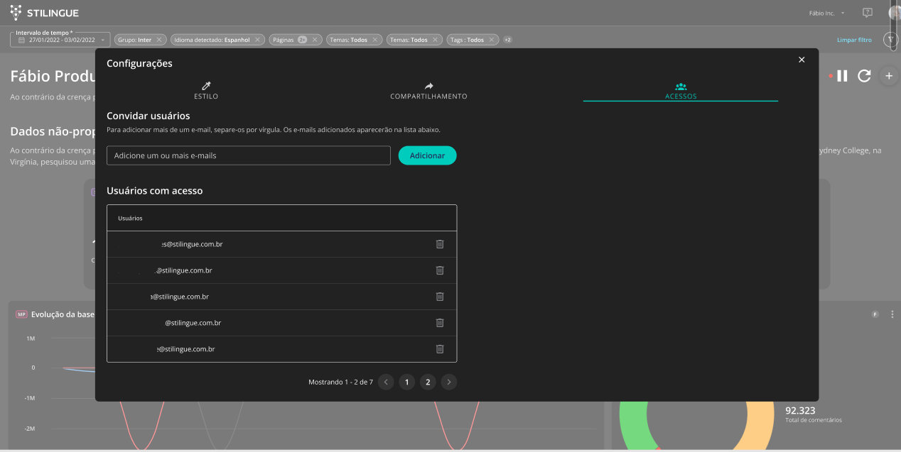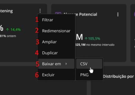 Configuração - STILINGUE Studio 8 de janeiro de 2026 18:44 Atualizado Índice: Primeiros passos Título Estilo Adicionar componente Filtros globais Editar componente Período Compartilhar Usuários com acesso Aprenda as ações necessárias para criar e configurar um dashboard personalizado e melhorar suas análises com o STILINGUE Studio O STILINGUE Studio é um serviço desenvolvido visando trazer soluções personalizadas para visualização de dados em tempo real. Você consegue criar dashboards com filtros exclusivos e elementos gráficos relevantes para o seu negócio. Primeiros passos1. TítuloÉ necessário atribuir um nome ao dashboard. A recomendação é que essa ação seja a primeira a ser realizada no ambiente. Digite o nome escolhido no canto superior esquerdo e confirme em seguida: É possível editar títulos e adicionar uma descrição que permite incluir informações personalizadas, otimizando a usabilidade do Studio de acordo com cada objetivo. 2. Estilo Por se tratar de um ambiente personalizado, dentro do STILINGUE Studio é possível escolher a apresentação do dashboard, alterar o plano de fundo, a cor do cabeçalho e inserir uma imagem no cabeçalho. A inserção de imagens é feita via URL e deve ser realizada em um diretório de imagens público para garantir que as imagens fiquem visíveis no dashboard. Acesse essa área por meio do ícone indicado na imagem, no canto superior direito: 3. Adicionar Componente Você consegue adicionar diversas opções de gráficos, números e imagens de forma simultânea nessa área. Os componentes serão posicionados na ordem em que forem inseridos. Você pode alterar a ordenação posteriormente. Entre as opções, estão:3.1 Dados não proprietáriosFornece métricas e gráficos de Listening.3.2 Dados proprietáriosApresenta métricas e gráficos da área de Métricas Proprietárias e STILINGUE Smart Care. 3.3 Anotações de dashboardEncontre elementos editáveis como caixas de texto, caixas de imagem e divisor de sessão para organizar o seu dashboard. É importante ressaltar que para inserir a imagem via URL, é necessário fazer o upload em um diretório público de imagens (conforme explicado no item 2). Clique em “Adicionar componente” no ícone de “+” no canto superior direito ou ao centro da página e escolha os elementos que farão parte do STILINGUE Studio: 4. Filtros GlobaisAqui você poderá personalizar os filtros do seu dashboard. Ao clicar no botão de Filtros Globais você verá uma tela com todas as opções de filtros e será possível escolher quais serão utilizados, conforme a sua necessidade. 5. Editar ComponenteAo clicar nas três bolinhas, você irá identificar as seguintes opções: 5.1 FiltrarO filtro é semelhante ao Filtro de Publicações encontrado no Listening e outras áreas da plataforma, permitindo que você personalize as métricas de acordo com parâmetros do filtro (que poderão ser utilizados apenas para esse gráfico em questão). É importante destacar que cada gráfico pode trazer filtros específicos, dependendo da sua categoria. 5.2 Redimensionar Escolha a altura e a largura específicas para que a visualização do conjunto de gráficos esteja segundo a lógica desejada. 5.1 Ampliar É possível visualizar apenas esse gráfico expandido na tela. 5.4 Duplicar Ao clicar nessa opção, você cria uma cópia do componente, duplicando seus elementos.5.5 Baixar em Você consegue baixar o componente nos formatos CSV e PNG.5.6 ExcluirÉ possível excluir o componente adicionado anteriormente. Por último, o título componente também pode ser editado, assim como o título do dashboard. 6. Período Escolha o período a ser analisado no dashboard. Clique na data ao lado do ícone do gráfico e selecione o período desejado. Ao fazer essa ação, a data selecionada será aplicada para todos os elementos e gráficos do dashboard. Observe que o filtro pode ser alterado a qualquer momento. Observação: o filtro do período também fica disponível para usuários que acessarem o STILINGUE Studio pelo link de compartilhamento, que será explicado no item 7. 7. Compartilhar Outra opção relevante que o STILINGUE Studio oferece é o compartilhamento do dashboard. Você pode torná-lo visível para outros usuários se preferir:Clique novamente em “Configurações”, no canto superior direito, e localize a aba “Compartilhamento”. Ao ativar a opção “Publicado”, qualquer pessoa com o link e token de acesso pode acessar o dashboard. Para essa opção não é necessário que as pessoas tenham login na STILINGUE, apenas com o link já será possível visualizar os gráficos. Além de tornar o dashboard um ambiente de fácil acesso, você pode clicar na opção “Gerar Novo Código de Acesso”, que possibilita um novo código que inutiliza o anterior, garantindo maior controle de acesso ao dashboard, quando necessário. Usuários com acessoAinda sobre o compartilhamento: embora qualquer pessoa possa visualizar o dashboard depois que ele passa a ser publicado, a edição do dashboard não é feita por qualquer pessoa. A opção de definir usuários com acesso permite que usuários cadastrados por você consigam excluir/incluir elementos e utilizar os filtros dentro do STILINGUE Studio. Os usuários ficam disponíveis na mesma área de Configuração e apenas o usuário Master ou Administrador pode adicionar, ou remover usuários. Para mais informações, acesse a discussão sobre o assunto em nossa comunidade ou os vídeos no nosso canal. 😃 Artigos relacionados Tratamento de dados de Mar Aberto - Youtube Lançamento Tags por fila Remover e Restaurar - Edição Múltipla Envio de Mensagens Ativas do WhatsApp no Blip Desk Histórico de atendimento