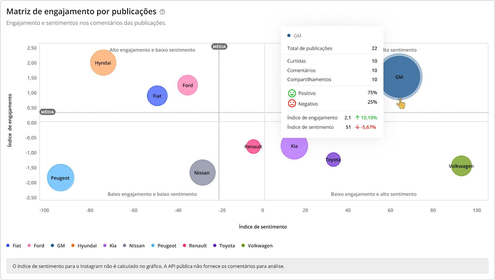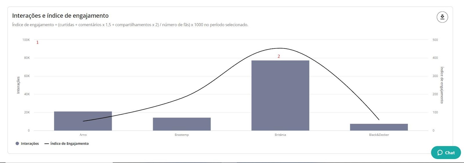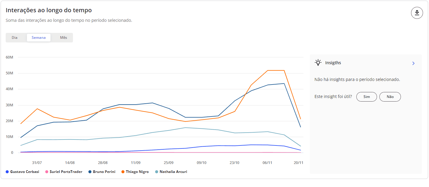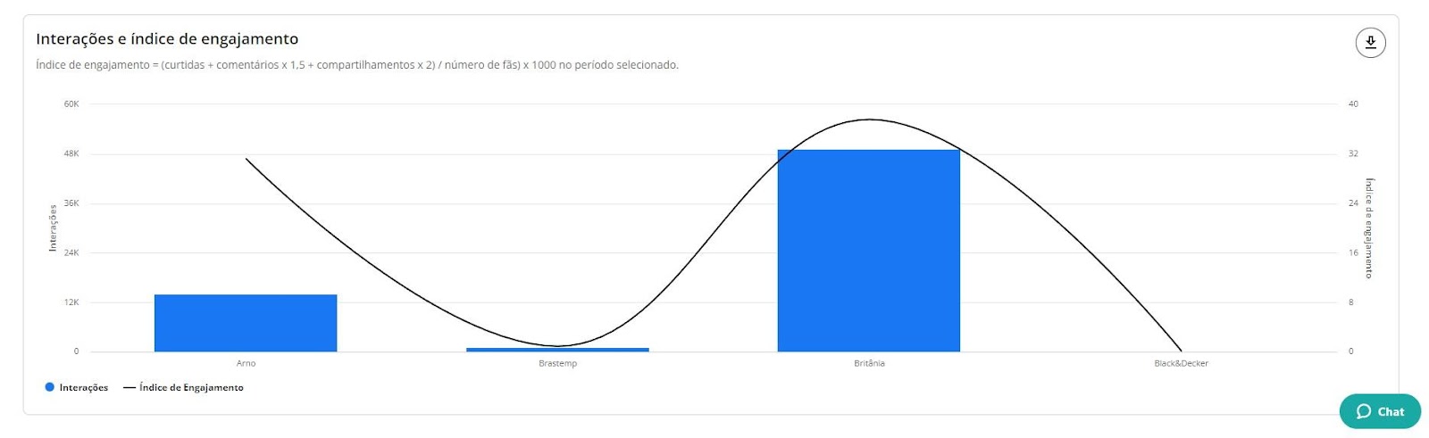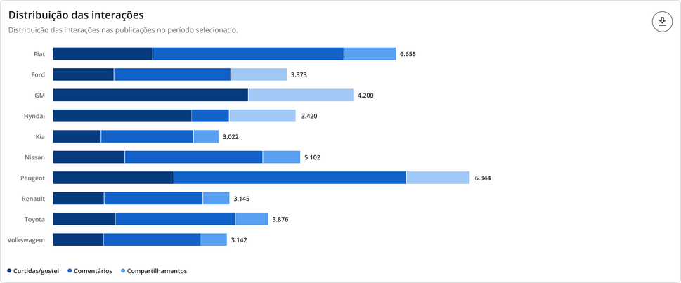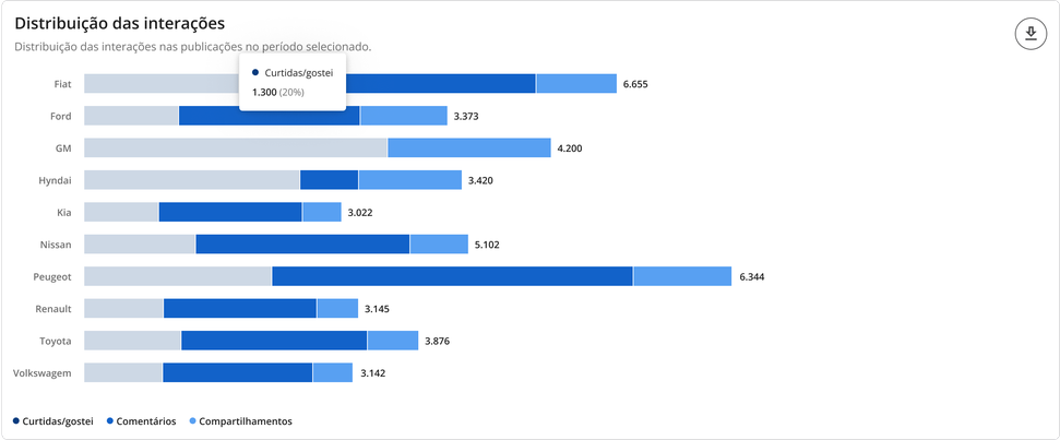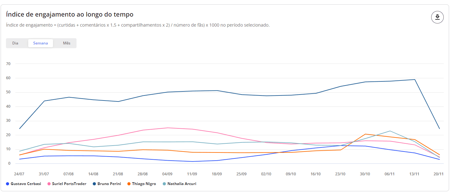 Interações - Benchmarks STILINGUE 6 de janeiro de 2026 19:23 Atualizado Índice: Introdução Interações Todas Por rede social IntroduçãoSaiba quais interações possuem mais repercussão nas redes sociais de outras marcas comparadas por vocêA STILINGUE está sempre buscando evoluir estratégias e criar oportunidades importantes para os clientes. Um exemplo disso é a possibilidade que o Benchmarks traz para a geração de insights. O foco dessa área é comparar dados entre grupos (da sua escolha) das seguintes redes sociais: Facebook, Twitter, Instagram e YouTube. Essas ações são feitas na mesma tela, sem a necessidade de consultar vários módulos ao mesmo tempo. Com o Benchmarks, você consegue visualizar informações sobre as interações publicadas, acessar o número de seguidores de diferentes marcas e ainda comparar a quantidade de publicações entre elas. InteraçõesAo selecionar “todas” como rede social, você visualiza a comparação entre todas as redes sociais de uma vez. Se preferir visualizar gráficos específicos por rede, escolha as demais redes pela opção: Vamos analisar primeiros os gráficos selecionados em “Todas”: TodasAqui é possível obter insights a partir das interações feitas pelos fãs nas páginas das marcas selecionadas. Acompanhe as interações apresentadas nessa área referentes a cada rede social: Rede social Tipo de interações Facebook Reações Comentários Compartilhamento Instagram Curtidas/Gostei Comentários Twitter Curtidas/Gostei Comentários Compartilhamento YouTube Curtidas/Gostei Comentários 1. Interações por rede socialApresenta a soma das interações das publicações por rede social. As interações relacionadas são: curtidas/gostei, reações, comentários e compartilhamentos. Importante: as interações serão atualizadas até 30 dias a partir da data de publicação. Portanto, pode ser que as linhas apresentem uma queda depois do 31º dia. 1.1 Soma das interaçõesQuantidade de interações somadas das redes sociais.1.2 Cores das redes sociaisDivisão das redes sociais no gráfico pela cor. 2. Média de interações por publicaçãoAqui é possível visualizar a média das interações por publicação, ou seja: como as pessoas estão interagindo com as publicações. O gráfico calcula a soma do total de interações (curtidas/gostei, comentários e compartilhamento), de acordo com cada rede social, dividido pelo total de publicações do período selecionado no filtro por grupo e agrupado por rede social. Para calcular a média de interação nas publicações por rede social, é necessário somar o número total de interações em cada uma das redes e dividir pelo total de publicações. Caso queira calcular a média de interações em todas as redes sociais, é necessário somar a média por rede social e dividir pelo número total de redes.Quando precisar ocultar ou exibir algum dado no gráfico, basta clicar na legenda. No caso de grupo ou marca, ao clicar na legenda todos os dados serão ocultados. 3. Interações ao longo do tempoTotal de interações feitas nas publicações de todas as páginas das redes sociais disponíveis, segundo o período selecionado. Importante: as interações serão atualizadas até 30 dias a partir da data de publicação. Portanto, pode ser que as linhas apresentem uma queda depois do 31º dia. 3.1 Soma das interaçõesQuantidade de interações somadas das redes sociais. 3.2 Interações por diaQuantidade de interações registradas por dia, levando em consideração as páginas dos grupos. Após o período selecionado, é possível visualizar os dados de forma agrupada por semana ou mês. 4. Índice de engajamento ao longo do tempo Visualização do engajamento da base de fãs a partir das redes sociais. Importante: as interações serão atualizadas até 30 dias a partir da data de publicação. Portanto, pode ser que as linhas apresentem uma queda depois do 31º dia. 4.1 Índice de engajamentoO cálculo do índice de engajamento leva em consideração a seguinte fórmula por rede social: Facebook e Twitter((Curtidas + comentários * 1,5 + compartilhamento * 2) / Número de fãs da página) * 1.000Instagram((Curtidas + comentários *1,5 + ) / Número de fãs) * 1.000YouTube((Curtidas + comentários * 1,5) / Número de views) * 10004.2 Cores dos gruposDivisão dos grupos no gráfico. Após o período selecionado, é possível visualizar os dados de forma agrupada por semana ou mês. 5. Interações e índice de engajamentoCálculo relacionado com o engajamento nas páginas e o número de fãs que ela possui. 5.1 Soma das interações Quantidade de interações somadas das redes sociais.5.2 Índice de engajamento O cálculo do índice de engajamento leva em consideração a seguinte fórmula por rede social: Facebook e Twitter((Curtidas + comentários * 1,5 + compartilhamento * 2) / Número de fãs da página) * 1.000Instagram((Curtidas + comentários *1,5 + ) / Número de fãs) * 1.000YouTube((Curtidas + comentários * 1,5) / Número de views) * 1000 6- Matriz de engajamento por publicaçõesCom esse gráfico, é possível analisar o índice de engajamento, de sentimento nos comentários das publicações e a variação em relação ao mesmo período anterior. Além disso, também é possível visualizar outras métricas, como o total de publicações, número de curtidas, comentários, compartilhamentos e os sentimentos dos comentários (positivo e negativo): Atenção! Esse gráfico estará disponível para visualização em "Todas as redes" e "Por rede social", com exceção do Instagram, pois a API da rede não disponibiliza os dados. Por rede socialAo selecionar as redes sociais abaixo (separadamente), você consegue observar as seguintes informações: Facebook Twitter YouTube 1. Distribuição das interaçõesO gráfico exibe a quantidade de interações por tipo (curtidas/gostei, comentários e compartilhamentos), o percentual que cada interação represent