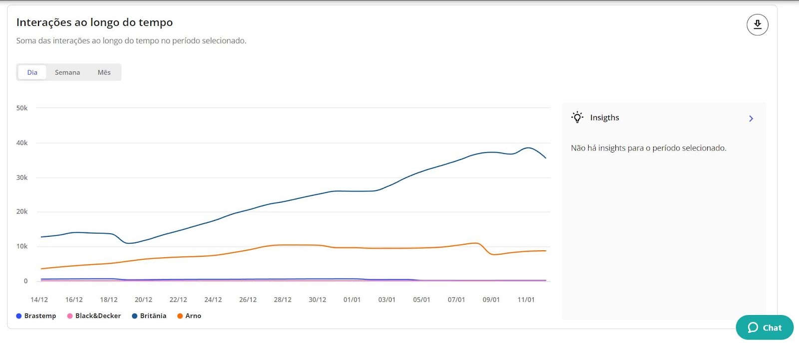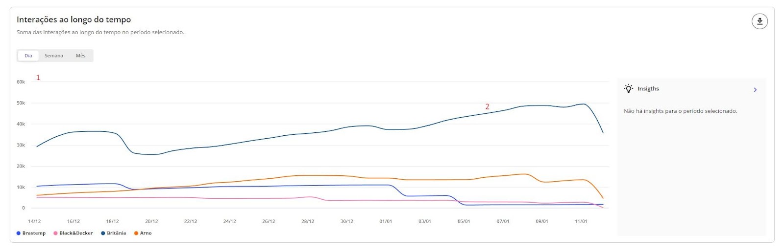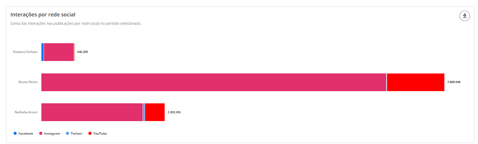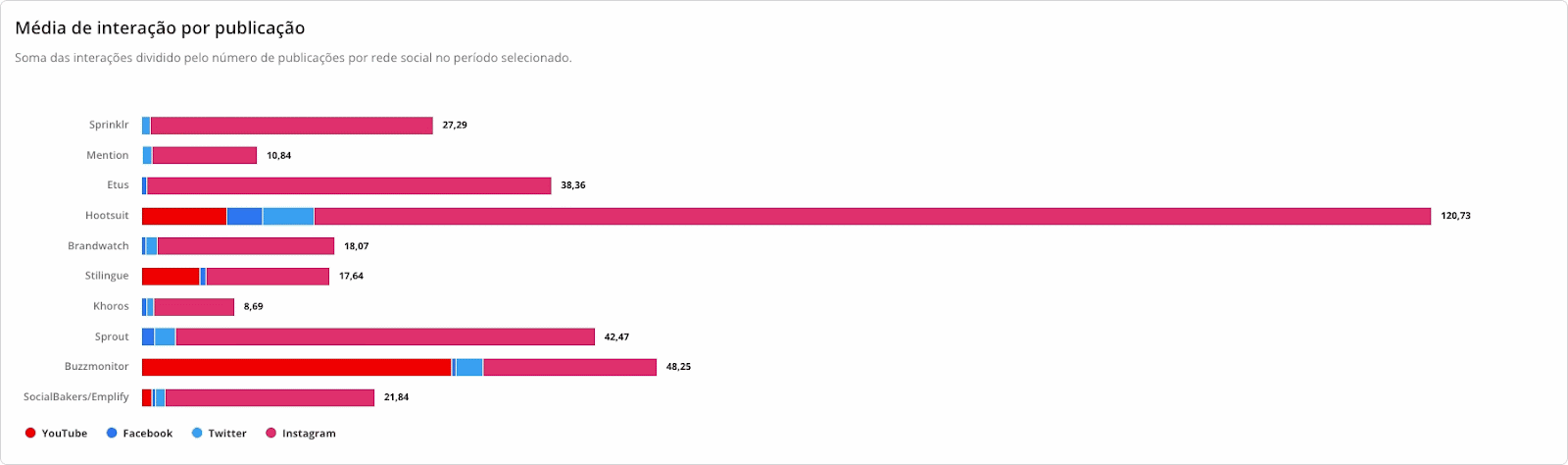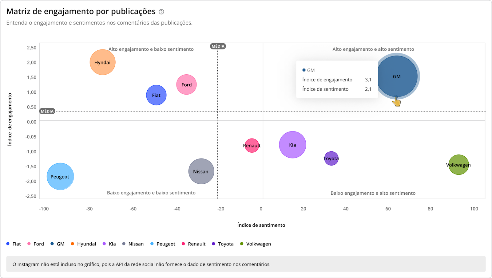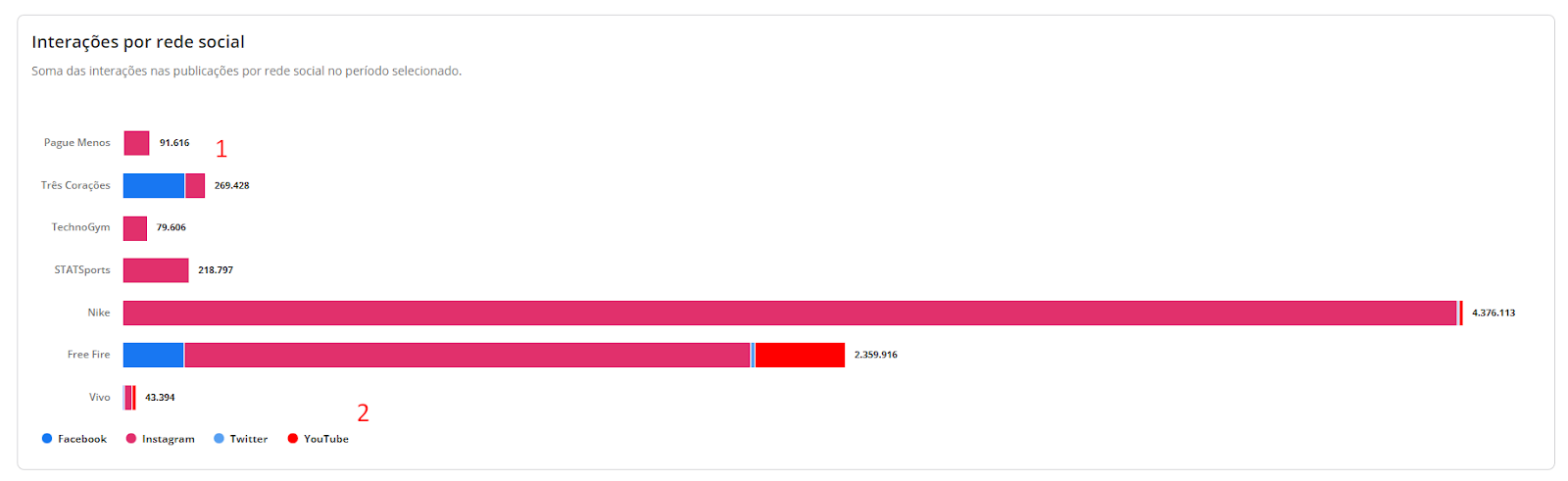 Interações - Benchmarks STILINGUE 6 de janeiro de 2026 19:23 Atualizado Índice: Introdução Interações Todas Por rede social IntroduçãoSaiba quais interações possuem mais repercussão nas redes sociais de outras marcas comparadas por vocêA STILINGUE está sempre buscando evoluir estratégias e criar oportunidades importantes para os clientes. Um exemplo disso é a possibilidade que o Benchmarks traz para a geração de insights. O foco dessa área é comparar dados entre grupos (da sua escolha) das seguintes redes sociais: Facebook, Twitter, Instagram e YouTube. Essas ações são feitas na mesma tela, sem a necessidade de consultar vários módulos ao mesmo tempo. Com o Benchmarks, você consegue visualizar informações sobre as interações publicadas, acessar o número de seguidores de diferentes marcas e ainda comparar a quantidade de publicações entre elas. InteraçõesAo selecionar “todas” como rede social, você visualiza a comparação entre todas as redes sociais de uma vez. Se preferir visualizar gráficos específicos por rede, escolha as demais redes pela opção: Vamos analisar primeiros os gráficos selecionados em “Todas”: TodasAqui é possível obter insights a partir das interações feitas pelos fãs nas páginas das marcas selecionadas. Acompanhe as interações apresentadas nessa área referentes a cada rede social: Rede social Tipo de interações Facebook Reações Comentários Compartilhamento Instagram Curtidas/Gostei Comentários Twitter Curtidas/Gostei Comentários Compartilhamento YouTube Curtidas/Gostei Comentários 1. Interações por rede socialApresenta a soma das interações das publicações por rede social. As interações relacionadas são: curtidas/gostei, reações, comentários e compartilhamentos. Importante: as interações serão atualizadas até 30 dias a partir da data de publicação. Portanto, pode ser que as linhas apresentem uma queda depois do 31º dia. 1.1 Soma das interaçõesQuantidade de interações somadas das redes sociais.1.2 Cores das redes sociaisDivisão das redes sociais no gráfico pela cor. 2. Média de interações por publicaçãoAqui é possível visualizar a média das interações por publicação, ou seja: como as pessoas estão interagindo com as publicações. O gráfico calcula a soma do total de interações (curtidas/gostei, comentários e compartilhamento), de acordo com cada rede social, dividido pelo total de publicações do período selecionado no filtro por grupo e agrupado por rede social. Para calcular a média de interação nas publicações por rede social, é necessário somar o número total de interações em cada uma das redes e dividir pelo total de publicações. Caso queira calcular a média de interações em todas as redes sociais, é necessário somar a média por rede social e dividir pelo número total de redes.Quando precisar ocultar ou exibir algum dado no gráfico, basta clicar na legenda. No caso de grupo ou marca, ao clicar na legenda todos os dados serão ocultados. 3. Interações ao longo do tempoTotal de interações feitas nas publicações de todas as páginas das redes sociais disponíveis, segundo o período selecionado. Importante: as interações serão atualizadas até 30 dias a partir da data de publicação. Portanto, pode ser que as linhas apresentem uma queda depois do 31º dia. 3.1 Soma das interaçõesQuantidade de interações somadas das redes sociais. 3.2 Interações por diaQuantidade de interações registradas por dia, levando em consideração as páginas dos grupos. Após o período selecionado, é possível visualizar os dados de forma agrupada por semana ou mês. 4. Índice de engajamento ao longo do tempo Visualização do engajamento da base de fãs a partir das redes sociais. Importante: as interações serão atualizadas até 30 dias a partir da data de publicação. Portanto, pode ser que as linhas apresentem uma queda depois do 31º dia. 4.1 Índice de engajamentoO cálculo do índice de engajamento leva em consideração a seguinte fórmula por rede social: Facebook e Twitter((Curtidas + comentários * 1,5 + compartilhamento * 2) / Número de fãs da página) * 1.000Instagram((Curtidas + comentários *1,5 + ) / Número de fãs) * 1.000YouTube((Curtidas + comentários * 1,5) / Número de views) * 10004.2 Cores dos gruposDivisão dos grupos no gráfico. Após o período selecionado, é possível visualizar os dados de forma agrupada por semana ou mês. 5. Interações e índice de engajamentoCálculo relacionado com o engajamento nas páginas e o número de fãs que ela possui. 5.1 Soma das interações Quantidade de interações somadas das redes sociais.5.2 Índice de engajamento O cálculo do índice de engajamento leva em consideração a seguinte fórmula por rede social: Facebook e Twitter((Curtidas + comentários * 1,5 + compartilhamento * 2) / Número de fãs da página) * 1.000Instagram((Curtidas + comentários *1,5 + ) / Número de fãs) * 1.000YouTube((Curtidas + comentários * 1,5) / Número de views) * 1000 6- Matriz de engajamento por publicaçõesCom esse gráfico, é possível analisar o índice de engajamento, de sentimento nos comentários das publicações e a variação em relação ao mesmo período anterior. Além disso, também é possível visualizar outras métricas, como o total de publicações, número de curtidas, comentários, compartilhamentos e os sentimentos dos comentários (positivo e negativo): Atenção! Esse gráfico estará disponível para visualização em "Todas as redes" e "Por rede social", com exceção do Instagram, pois a API da rede não disponibiliza os dados. Por rede socialAo selecionar as redes sociais abaixo (separadamente), você consegue observar as seguintes informações: Facebook Twitter YouTube 1. Distribuição das interaçõesO gráfico exibe a quantidade de interações por tipo (curtidas/gostei, comentários e compartilhamentos), o percentual que cada interação represent