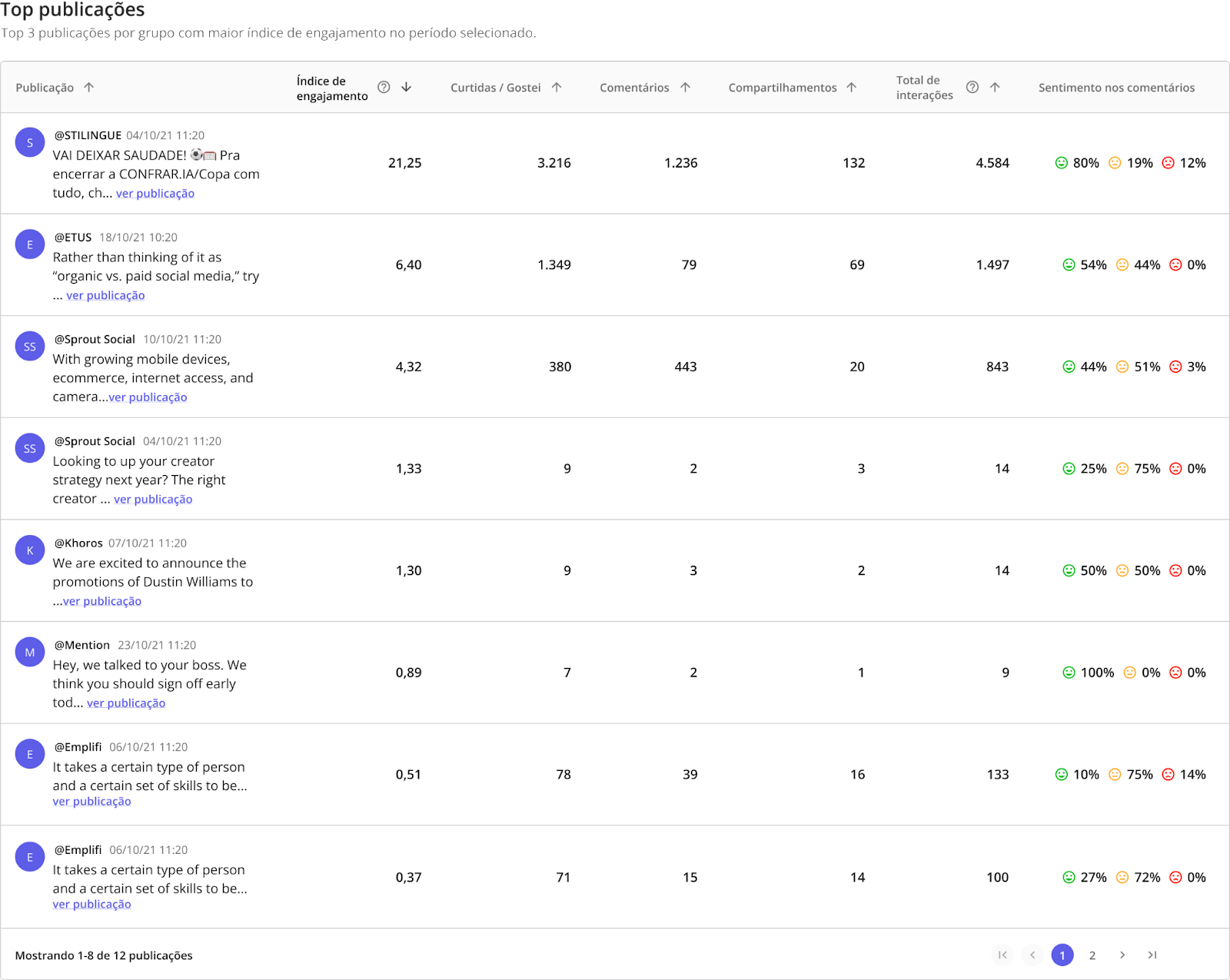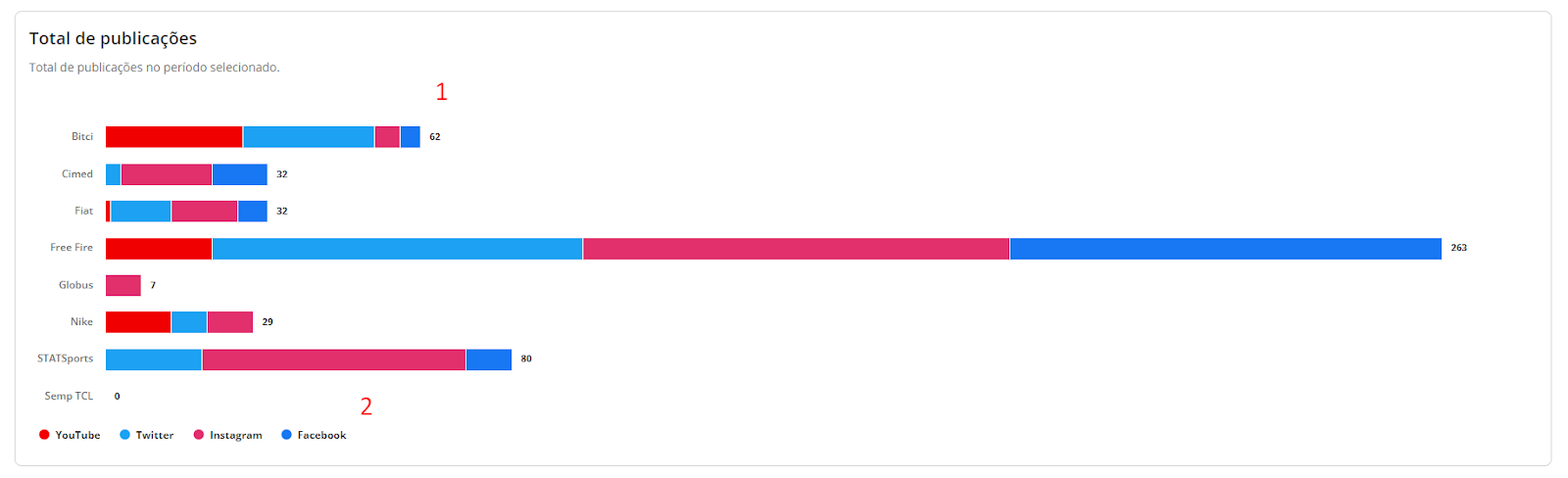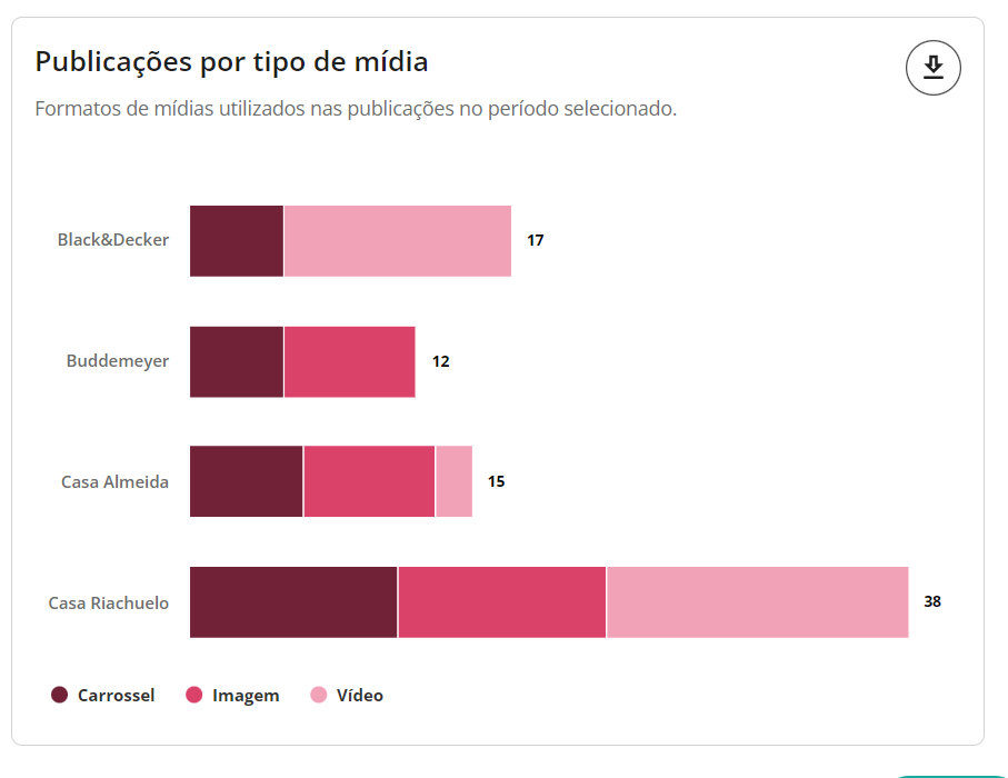 Publicações - Benchmarks STILINGUE 21 de janeiro de 2026 12:54 Atualizado Índice: Introdução Publicações Todas Por rede social IntroduçãoSaiba detalhes importantes sobre publicações das outras marcas e como elas estão distribuídas nas redes sociaisPor meio do Benchmarks é possível comparar dados entre grupos (da sua escolha) das seguintes redes sociais: Facebook, Twitter, Instagram e YouTube, tudo isso em um único lugar. Ao acessar o Benchmarks você consegue ver quantas publicações as marcas estão fazendo, saber o número de seguidores entre as redes sociais e visualizar informações sobre as interações publicadas. Veja quais são os gráficos disponíveis dentro das abas: Publicações Ao selecionar “todas” como rede social, você visualiza a comparação entre todas as redes sociais de uma vez. Se preferir visualizar gráficos específicos por rede, escolha as demais redes pela opção:Vamos analisar primeiros os gráficos selecionados em “Todas”: TodasRepresenta a quantidade de publicações feitas no período do filtro. 1. Total de Publicações Apresenta o total de publicações da timeline feitas nas redes sociais das páginas de cada grupo, dentro do período selecionado. 1.1 Soma das publicaçõesQuantidade de publicações somadas das redes sociais disponíveis. 1.2 Cores das redes sociaisDivisão das redes sociais no gráfico pela cor. Por rede socialAo selecionar as redes sociais abaixo (separadamente), você consegue observar as seguintes informações: Facebook Instagram Twitter YouTube 1. Total de publicaçõesO gráfico representa o total de publicações pela rede social selecionada, das páginas de cada grupo, no período escolhido. Como a visualização do gráfico se dá por rede social, cada rede será apresentada de uma cor. Atenção! A exibição das publicações é feita a partir do que apareça na timeline, não sendo possível identificar um dark post. Há casos em que publicações da timeline passam pelo impulsionamento, mas essa diferença não é apresentada nessa área. 2. Publicações por tipo de mídiaCategoriza as publicações por tipo de mídia. É importante destacar que nem todas as redes terão as mesmas mídias disponíveis. Acompanhe na tabela abaixo quais mídias estão sendo consideradas em cada rede. Tipos de mídia por cada rede social: Rede social Tipo de mídia Facebook Multimídia (imagem, texto ou vídeo na mesma publicação) Imagem Texto Vídeo Instagram Carrossel Imagem Vídeo (IGTV e Reels) Twitter Imagem Texto Vídeo YouTube Vídeo 3. Top publicaçõesSelecionando apenas uma rede social por vez, você consegue visualizar as três publicações com maior índice de engajamento dentro do período selecionado. É possível ordenar os dados de forma crescente ou decrescente, basta clicar na setinha ao lado de cada coluna. 3.1 Índice de engajamentoO cálculo do índice de engajamento leva em consideração a seguinte fórmula por rede social: Facebook e Twitter((Curtidas + comentários *1,5 + compartilhamento * 2) / Número de fãs da página) * 1.000Instagram((Curtidas + comentários *1,5 + ) / Número de fãs) * 1.000YouTube((Curtidas + comentários *1,5) / Número de views) * 1000 3.2 Curtidas/GosteiQuantidade de curtidas na publicação indicada. 3.3 ComentáriosQuantidade de comentários na publicação indicada. 3.4 CompartilhamentosQuantidade de vezes em que a publicação foi compartilhada com outros usuários.3.5 Total de interaçõesSoma das interações por cada rede social: Rede social Soma das interações Facebook Total de interações é a soma de reações, comentários e compartilhamento. Instagram Total de interações é a soma de curtidas/gostei e comentários. Twitter Total de interações é a soma de curtidas e compartilhamentos. YouTube Total de interações é a soma de curtidas e comentários. 3.6 Sentimento nos comentáriosÍndice de sentimento da publicação. Para ter acesso ao cálculo utilizado, leia o guia. Observação: essa aba da tabela não está disponível para o Instagram, por uma limitação da API da rede social. É possível fazer a exportação dos dados em gráficos nos formatos: PNG, PDF, CSV e XLS, e exportação de tabelas nos formatos: CSV e XLS. Para mais informações, acesse a discussão sobre o assunto em nossa comunidade ou os vídeos no nosso canal. 😃 Artigos relacionados Sentimento ao longo do Tempo - Benchmarks STILINGUE Solicitação de Selo de Conta Comercial Oficial O que as pessoas estão falando - Benckmarks STILINGUE Gráficos - Benchmarks STILINGUE FAQ - Integrações