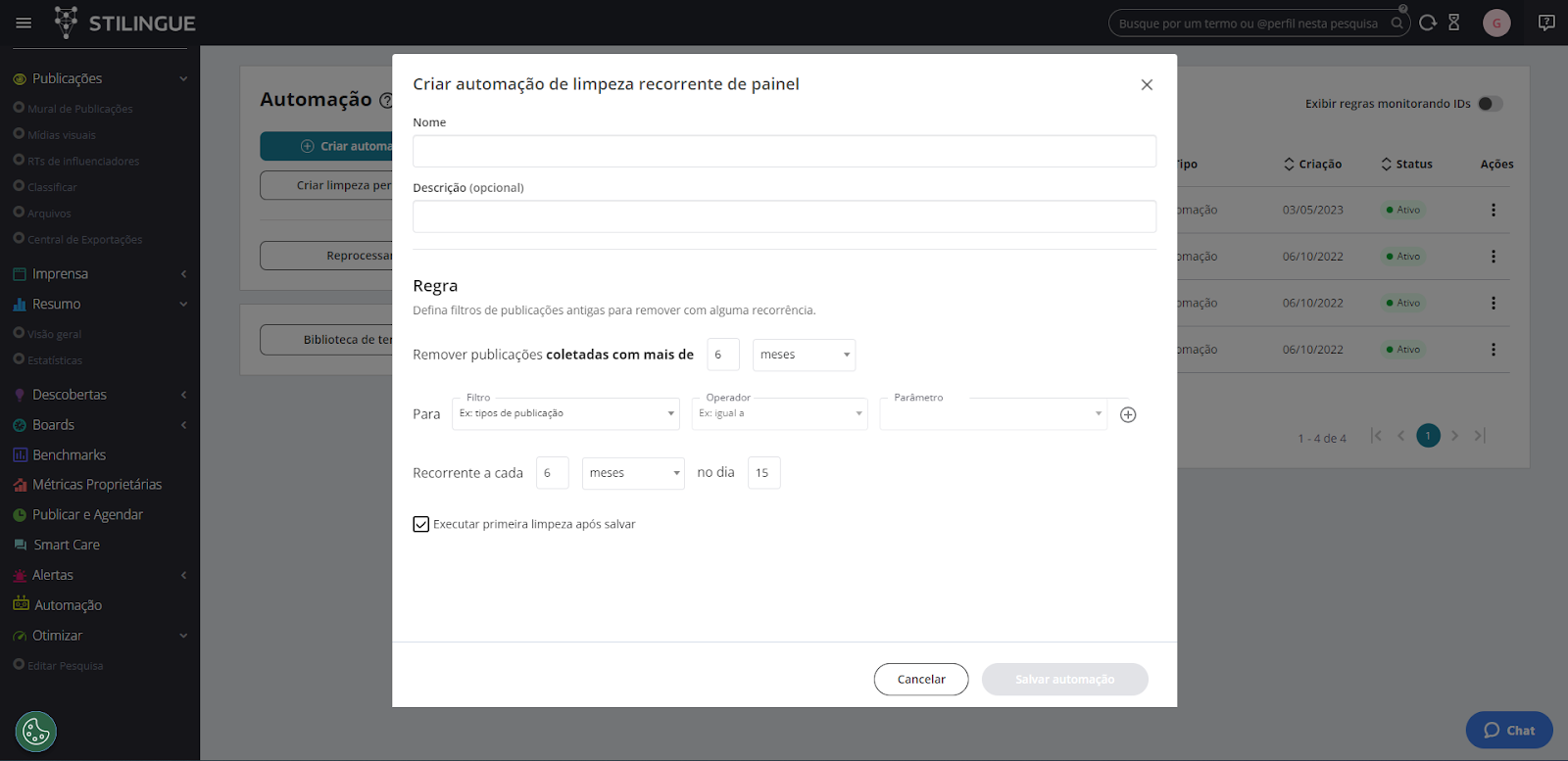 Limpeza de Painel 21 de janeiro de 2026 15:05 Atualizado Índice: Visão Geral Especificação de funcionalidade Visão GeralLançamos uma nova funcionalidade na tela de Automação, no Listening, chamada "Criar Limpeza Recorrente". Essa funcionalidade permite que os usuários criem automações para a limpeza do painel de forma recorrente, facilitando e agilizando o trabalho do usuário. Especificação de funcionalidadeSomente usuários que possuem permissão para criar automação poderão utilizar essa funcionalidade para criar uma regra de Limpeza de Painel. Campos obrigatórios: Nome campos referentes a “Remover publicações coletadas com mais de” Pelo menos 1 filtro campos referentes a “Recorrente a cada” Campos opcionais: A descrição da automação Checkbox “Executar primeira limpeza após salvar” - se selecionado, executa a limpeza de painel com a filtragem selecionado ao salvar. Esperamos que esta nova funcionalidade possa facilitar o dia a dia dos usuários que precisam realizar limpezas recorrentes em seus painéis.A remoção de publicações está limitada a um período retrospectivo de até 12 meses, com recorrência permitida no mesmo intervalo de tempo. Para mais informações, acesse a discussão sobre o assunto em nossa comunidade ou os vídeos no nosso canal. 😃 Artigos relacionados Libere espaço no seu painel Remover e Restaurar - Edição Múltipla Atendente inativo Texto rotativo com spintax Mensagens Ativas - Códigos de erro