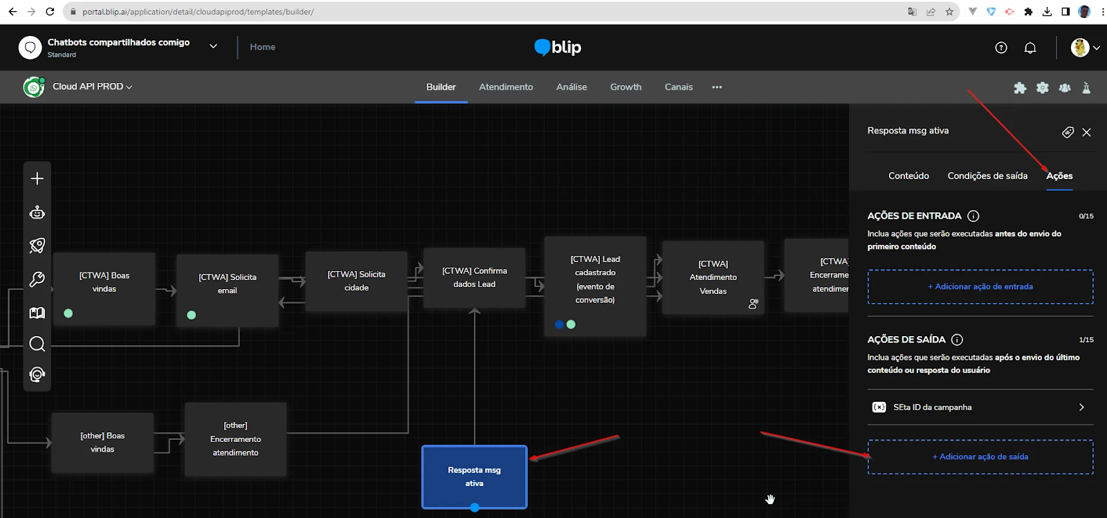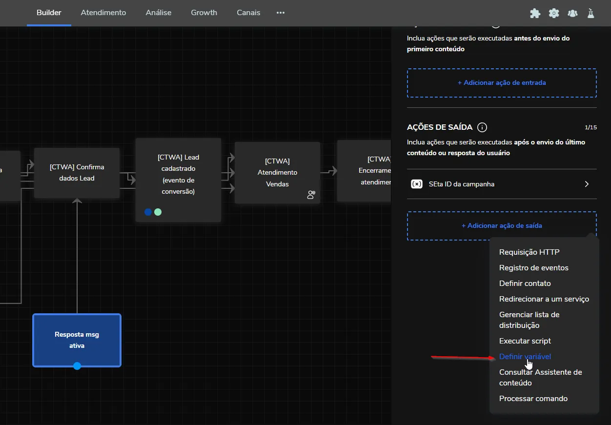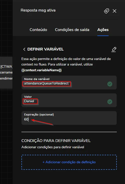 Como direcionar a mensagem ativa para uma fila específica 4 de março de 2026 18:19 Atualizado Índice:Como funcionaComo funcionaNo fluxo do bot, escolha uma caixa para definir uma variável de contexto como ação da saída dessa caixa, recomendamos que seja feito na caixa antes do transbordo, mas pode ser qualquer caixa.Selecione a opção: Definir variável Nome da variável: attendanceQueueToRedirect Valor: o valor dela é o nome da fila que forçaremos na criação do ticket, assim desprezemos outras regras de transbordo e já criará o ticket nessa fila Expiração: Deve-se definir a expiração dessa variável, pois por padrão ela deve ficar zerada quando o ticket for fechado, mas se por algum motivo a conversa não atingir o transbordo, o ticket continuará existindo, então em outro contato com o bot, se o cliente precisar transbordar, o ticket cairá nessa fila (e pode ser que não era desejado cair nessa fila numa conversa posterior). Em resumo, é necessário definir a variável de contexto "attendanceQueueToRedirect" em algum momento antes do transbordo, e quando cair na etapa de transbordo já vai gerar o ticket na fila indicada na variável. Veja mais informações no artigo: Como enviar Mensagens Ativas no WhatsApp Para mais informações, acesse a discussão sobre o assunto em nossa comunidade ou os vídeos no nosso canal. 😃 Artigos relacionados Como configurar o direcionamento de resposta de uma mensagem ativa, para um atendente no Blip Desk(Beta) Como enviar imagens, vídeos e documentos em notificações ativas do WhatsApp Configuração do arquivo de audiência - Envio de notificações em massa Envio de Mensagens Ativas do WhatsApp no Blip Desk Como criar e aprovar um Message Template no WhatsApp