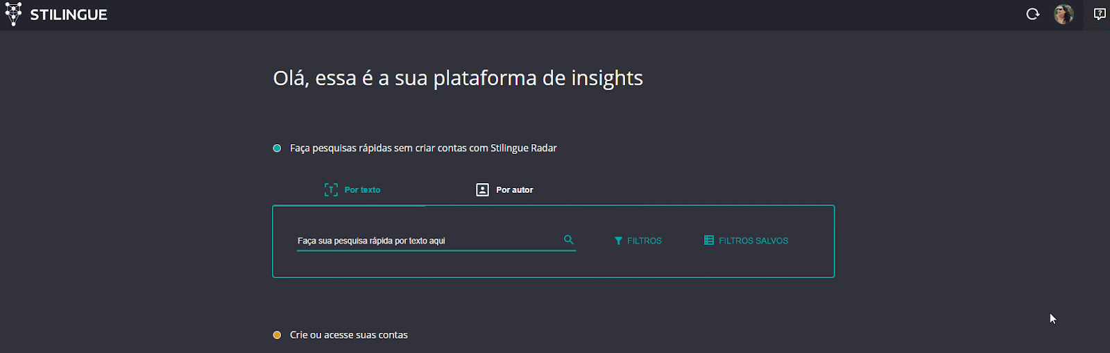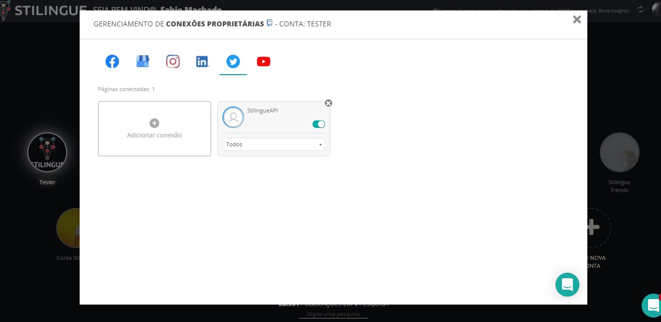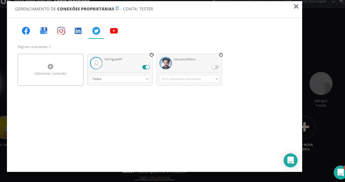 Twitter - Minhas Conexões 21 de janeiro de 2026 14:51 Atualizado Índice: Introdução Requisitos iniciais Conectando o perfil IntroduçãoAprenda a conectar os perfis da sua empresa no TwitterA conexão das suas páginas proprietárias é feita em Minhas Conexões. Acesse o guia inicial para mais informações sobre como acessar essa área e as opções de conexão para diferentes redes sociais. Neste guia, falaremos especificamente sobre o Twitter.Primeiro, vá ao Menu localizado no canto superior direito, clique em “Minhas Conexões” aguarde a tela do Gerenciamento de Conexões Proprietárias. Requisitos iniciaisPara conectar o perfil da sua empresa no Twitter, é necessário que você (ou o usuário responsável pela conexão) esteja "logado" ao perfil no momento em que entra na área de Minhas Conexões. Importante: antes de iniciar o procedimento, verifique se o pop-up no seu navegador está bloqueado, pois essa função pode impedir que o perfil seja conectado. Para saber como configurar o pop-up no Google Chrome, clique neste link. Conectando o perfil Ao acessar o Gerenciamento de Conexões, você irá visualizar todos os canais proprietários que podem ser integrados à ferramenta. As páginas já conectadas também ficam disponíveis nessa área, caso existam. Para conectar o perfil, clique no ícone do Twitter e vá na caixa Adicionar Conexão. Uma nova janela será aberta solicitando a autorização de uso pela STILINGUE. Após a confirmação, o perfil será conectado e aparecerá como um card dentro do Gerenciamento de Conexões Proprietárias. Após concluir essa etapa, é necessário vincular o perfil à uma pesquisa já existente e ativar o card para que os dados possam ser acessados. Na parte interna do card, selecione a pesquisa desejada, clique em OK e ative o botão no canto direito (a cor irá mudar de cinza para verde). Seguindo esses passos, você garante que a coleta dos dados do perfil seja feita corretamente. Observação: Fique atento(a) às notificações em verde no canto inferior da tela. Elas indicam que as ações foram realizadas com sucesso. Para mais informações, acesse a discussão sobre o assunto em nossa comunidade ou os vídeos no nosso canal. 😃 Artigos relacionados Respostas em Stories (Story Reply) no Instagram Publicações - Instagram Engaje usuários a iniciar conversas utilizando Ice Breakers no Instagram Youtube - Minhas Conexões Pausas Personalizadas