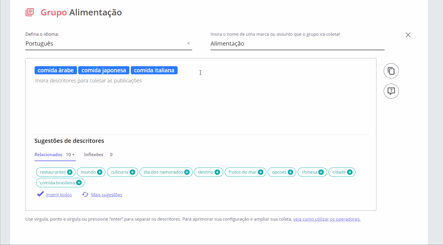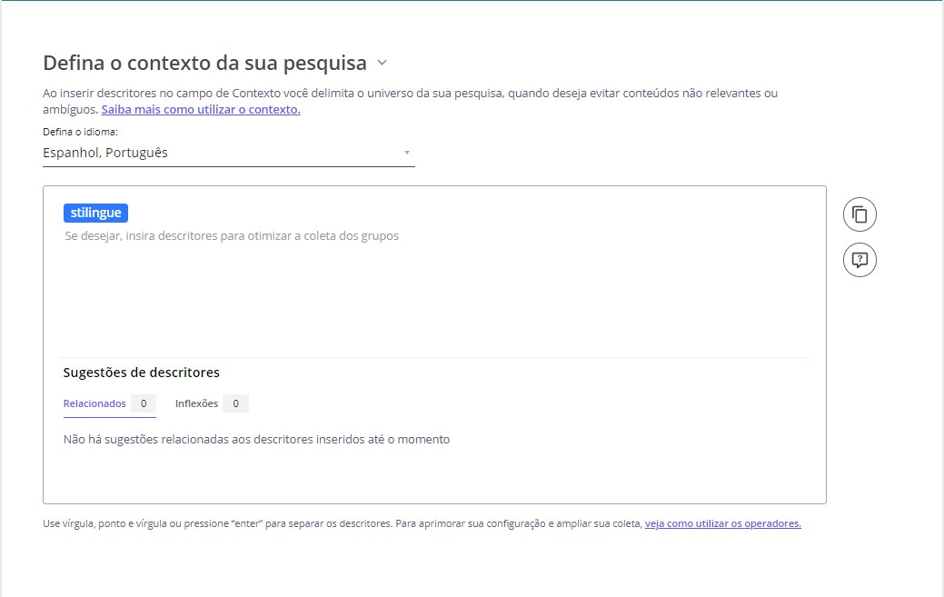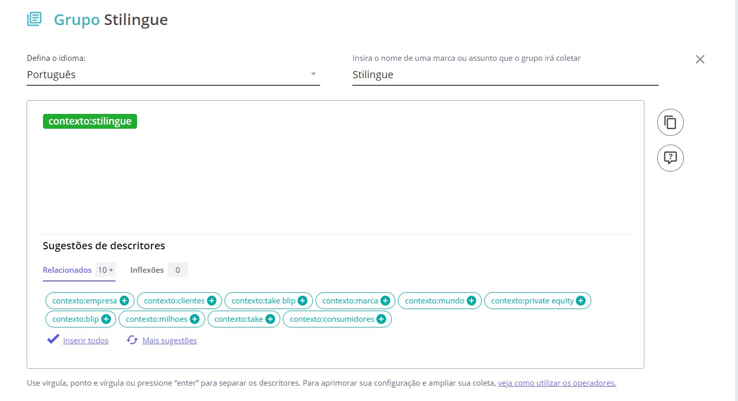 Operadores - Contexto 21 de janeiro de 2026 12:27 Atualizado Índice: Introdução Como acessar Operador de contexto IntroduçãoComo aprimorar a sua configuração para ampliar possibilidades na coleta de termosNo processo de configuração de pesquisa, os operadores permitem que ações específicas sejam aplicadas aos termos do seu monitoramento. Você pode optar por não coletar determinados termos, especificar palavras que devem ser coletadas juntas, além de outras funcionalidades descritas nos guias relacionados. Como acessarAcesse a área de Configuração pelo menu lateral ou pelo card: Operador de contextoAo ativar esse operador, o Grupo passa a se submeter aos termos cadastrados previamente no Contexto. Ou seja, quando uma publicação tiver um termo associado a esse operador, ela será coletada apenas se também tiver um ou mais termos contidos no campo do contexto.Veja os exemplos dentro do Contexto temos o seguinte termo: E no Grupo: Ao aplicarmos o operador de contexto, o Grupo irá coletar apenas as publicações que apresentarem as palavras “stilingue” e “inteligência artificial” no texto. Itens que tenham apenas um dos termos citados não serão considerados pela busca. Você também pode aplicar o operador de contexto clicando em cima do termo desejado e selecionando a alternativa “aplicar filtro de contexto?” disponível no box de Opções: Para mais informações, acesse a discussão sobre o assunto em nossa comunidade ou os vídeos no nosso canal. 😃 Artigos relacionados Operadores - Exatamente Operadores - “E” comercial (&&) Variáveis do Builder Extensão Hubspot (Lanum) Como criar lista de contatos no RCS
