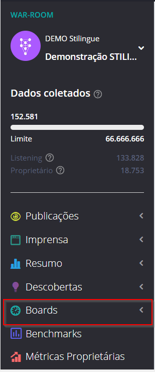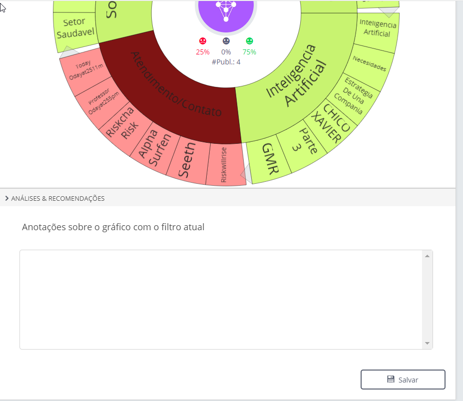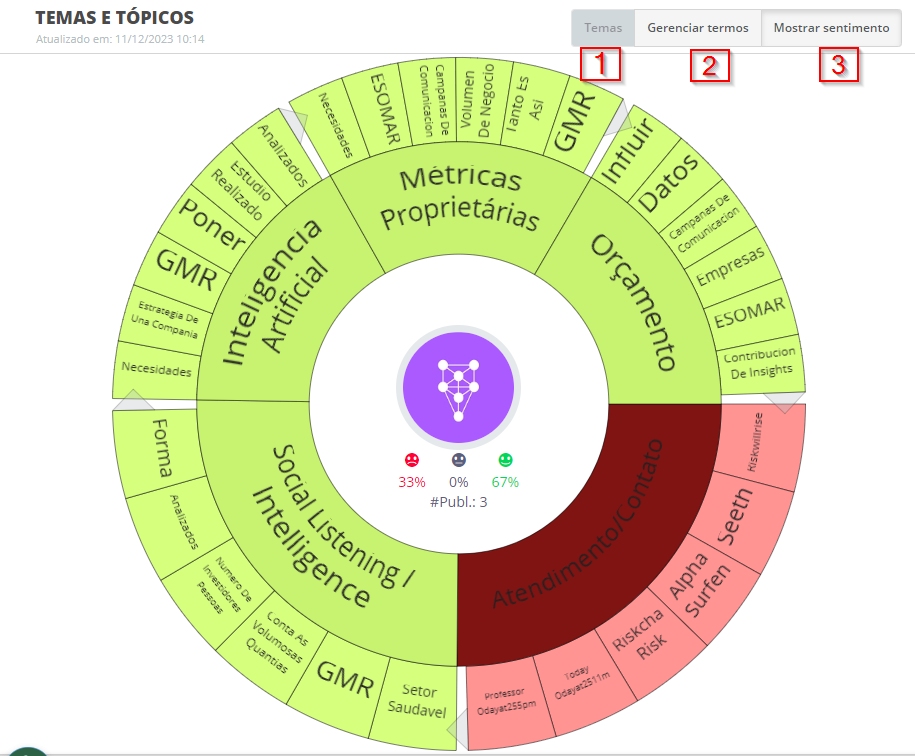 Temas e Tópicos - Listening 21 de maio de 2024 15:35 Atualizado Índice: Temas e tópicos - Boards Temas e tópicos - Edição Boards Os Boards da STILINGUE foram desenvolvidos para apresentar os dados coletados por sua pesquisa de forma didática e visual, com atualizações em tempo real e a possibilidade de apresentação em TV’s e monitores. Você pode utilizá-los em conjunto com a sua equipe como um recurso analítico e visual para monitorar crises, campanhas e eventos onde a repercussão ao vivo faz diferença. O módulo completo de Boards fica localizado no menu lateral do Listening: Ao clicar em “Temas e Tópicos” uma nova página se abrirá, apresentando o gráfico em destaque. Aqui é possível visualizar os termos mais citados entre as publicações coletadas em sua pesquisa: 1. Temas/Grupos Use esse botão para alterar a apresentação do gráfico conforme os Grupos ou Temas estabelecidos em sua pesquisa. 2. Gerenciar termos Edite os termos apresentados para remover palavras que não deseja apresentar no gráfico. 3. Mostrar sentimento Escolha essa opção se deseja que as cores do gráfico de termos representem o sentimento das publicações. 4. Análises & Recomendações Para adicionar textos e imagens à apresentação do gráfico, utilize a área de Análises & Recomendações. Edição Escolha parâmetros para visualizar dados em tempo real na sua pesquisa. O guia Temas e Tópicos - Boards apresenta o funcionamento do gráfico principal da área. Na primeira parte desse material, foi mostrado como funciona o gráfico principal do Board Temas e Tópicos. Agora, vamos conhecer outras funcionalidades para que você possa extrair informações completas dessa área. Outras opções de edição Você consegue alterar a cor do gráfico conforme o sentimento, isso facilita para que uma cor específica indique um termo relevante, por exemplo. Além disso, é possível usar as setas que estão nas extremidades de cada “fatia” dos termos para alterar a visualização, podendo expandir ou ocultar Grupos, Temas ou termos. Anotações por Grupos e Temas Ao lado do gráfico principal de Temas e Tópicos, é possível visualizar o percentual de sentimento e incluir informações sobre os Grupos e Temas apresentados no gráfico. Para mais informações, acesse a discussão sobre o assunto em nossa comunidade ou os vídeos no nosso canal. 😃 Artigos relacionados Quando estão falando? - Listening Temas Transferência de conversas por administrador Gerenciando permissões de acesso Temas pré-configurados para sua pesquisa