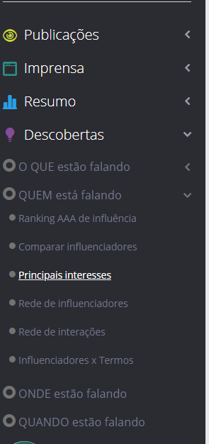 Principais Interesses - Listening 21 de maio de 2024 13:53 Atualizado Índice: Usuários Publicações Confira quais são os maiores interesses dos usuários e publicações presentes na sua pesquisa. Principais Interesses é um gráfico que exibe os interesses e o volume em que estão presentes nos resultados da sua pesquisa. Assim, você poderá identificar o que buscam e com o que se importam os usuários que falam sobre a sua marca. A funcionalidade pode ser encontrada no Menu lateral na área de Descobertas - QUEM Está Falando: Você pode escolher visualizar o gráfico de interesse baseado em uma das duas categorias como foram classificados: Usuários ou Publicação. Usuários Aqui aparecerão os interesses que foram classificados os usuários. Ao clicar em um dos círculos, um card aparecerá: 1. Zoom no interesse Mostra publicações e informações referentes ao interesse selecionado. 2. Zoom no perfil Abre o Dossiê do Influenciador com dados sobre o usuário vinculado ao interesse selecionado. Publicação Aqui os interesses exibidos serão os interesses classificados por publicações. Por exemplo, um usuário pode fazer várias publicações com interesses distintos, aqui você terá um gráfico que levou estas classificações individuais em consideração. Neste formato, ao invés do card ao clicar no interesse você analisa as publicações diretamente no Zoom. Observação: você pode também, na ordem respectiva dos ícones abaixo, baixar a imagem do gráfico, exportar o relatório ou recarregar o gráfico com a formação original do filtro. Os ícones podem ser encontrados no canto superior direito do gráfico: Para mais informações, acesse a discussão sobre o assunto em nossa comunidade ou os vídeos no nosso canal. 😃 Artigos relacionados Envio de Mensagens Ativas do WhatsApp no Blip Desk Como definir um tempo limite (timeout) para ações do Builder Ações no Card de Publicação Quando estão falando? - Listening Criando mensagens interativas no WhatsApp