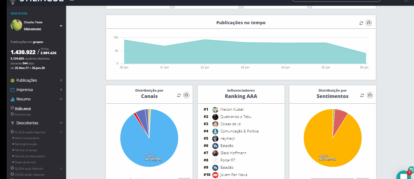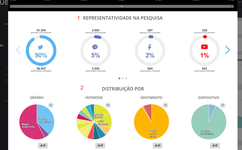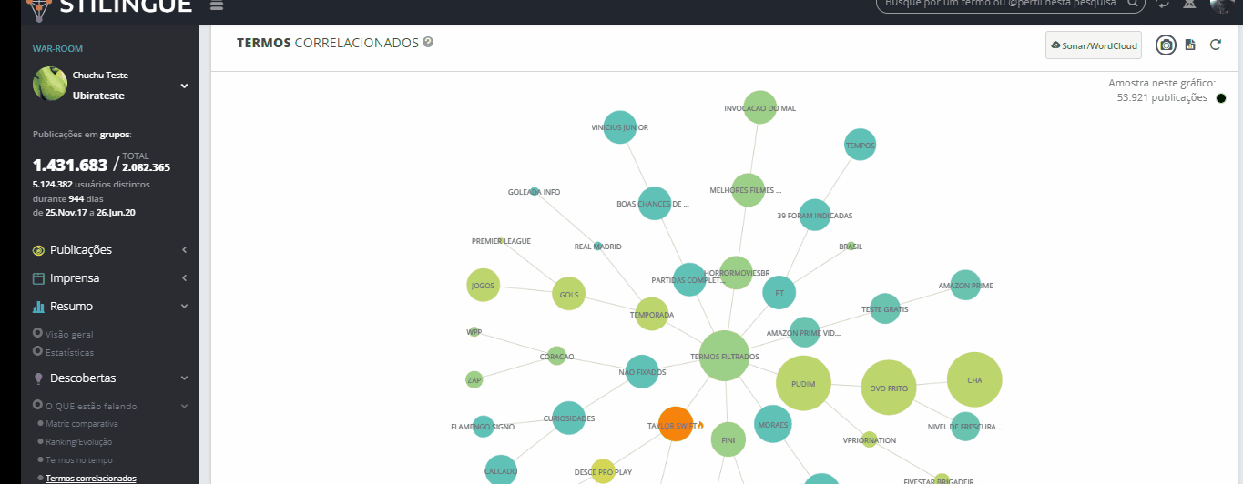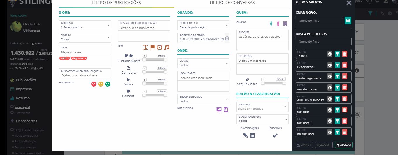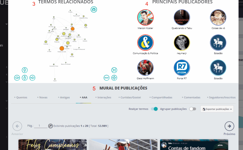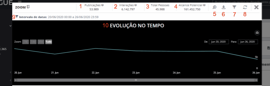 Zoom - Listening 10 de maio de 2024 13:38 Atualizado Índice: Como acessar Exemplos práticos Elementos do Zoom - Listening Divisão e distribuição Veja como aprofundar suas análises ao clicar nos gráficos do Listening. O zoom é um recurso que está disponível em vários módulos da plataforma STILINGUE, e permite que você explore de forma mais detalhada um segmento específico do Listening para encontrar dados relevantes na análise de publicações. Como acessar Ao clicar em um dos gráficos do sistema, você pode visualizar informações diversas, como: canais com o maior número de publicações, termos relacionados, principais publicadores, divisão por sentimento, entre outros. Enquanto os gráficos de áreas como Visão Geral e Descobertas mostram uma visão do todo (de acordo com o filtro escolhido), o zoom oferece um recorte mais aprofundado deste gráfico, reunindo os principais dados relacionados a um Grupo ou sentimento específico, por exemplo. Exemplos práticos Ao acessar o Visão Geral dentro do Módulo Resumo, é possível clicar em segmentos dos gráficos para abrir o zoom com mais informações sobre aquele recorte: O Termos correlacionados, dentro de Descobertas, também permite aplicar o zoom para analisar os termos dispostos no gráfico: Você também pode acessar essa opção no Filtro de Publicações, presente no Mural e outras áreas do Listening. Ao definir os parâmetros do filtro (ou optar pelos filtros salvos), clique no botão Zoom localizado no canto inferior, ao lado de Aplicar: Elementos do Zoom Agora, vamos olhar os detalhes sobre os elementos que compõem esta funcionalidade. Dentro da tela do Zoom, podemos dividir as informações da seguinte forma: Análise inicial 1. Publicações Total de publicações de acordo com a seleção do Zoom. Passe o cursor sobre o número para visualizar mais detalhes sobre o volume analisado. 2. Interações Soma de interações verificadas na seleção do Zoom. Ao passar o cursor sobre o número, você consegue visualizar a distribuição por interação (curtidas, comentários e compartilhamentos). 3. Total Pessoas Contagem dos usuários que fizeram publicações. 4. Alcance Potencial Essa métrica equivale a 20% da somatória de seguidores dos perfis de redes sociais da amostra. 5. Classificar com filtro atual Essa funcionalidade abre uma nova página na área Classificar com base nas definições do filtro atual do zoom. Dependendo do gráfico, não será possível abrir o Classificar. 6. Exportar relatório Permite baixar o relatório do zoom como um arquivo em formato PDF. 7. Filtros instantâneos Clique no ícone para criar um novo parâmetro de filtro, que será exibido dentro do zoom. 8. Retornar ao zoom inicial Dentro do zoom, a qualquer momento você pode clicar nos gráficos para uma análise ainda mais específica. Para voltar ao zoom inicial, basta clicar neste ícone. 9. Intervalo de datas Indica o intervalo de tempo do recorte analisado no zoom. 10. Evolução no tempo Mostra a movimentação das publicações ao longo do tempo, conforme as datas selecionadas no filtro. Clique no ícone no canto superior direito para exportar o gráfico como um arquivo nas opções: PNG, JPEG, PDF, SVG, CSV ou XLS. Divisão e distribuição 1. Representatividade na pesquisa Mostra a divisão das publicações por canal dentro do Zoom. Para cada canal, é exibido o número de usuários únicos (pessoas mencionando) e o número total de publicações dentro do filtro. Ao clicar em uma das redes sociais listadas, o zoom irá mostrar informações apenas sobre esta rede. Observação: o número de pessoas mencionando é o total de usuários que tiveram publicações coletadas dentro da busca/filtro feito, em cada rede social. Já o total de publicações é o número de publicações individuais. Esse número de publicações é maior justamente porque cada usuário pode publicar mais de uma vez sobre um determinado assunto. 2. Distribuição por Esta série de gráficos mostra a divisão das publicações por: Gênero Interesse sentimento dispositivo 3. Termos relacionados Exibe as conexões entre os termos que se destacam nas publicações. Use as setas para navegar pelo gráfico, que também pode ser exportado em formato JPG. 4. Principais publicadores Exibe os principais usuários (com base no Ranking AAA STILINGUE) que realizaram publicações no intervalo analisado. 5. Mural Essa área funciona de forma semelhante ao Mural de Publicações que faz parte do Listening. Dessa forma, é possível ordenar as publicações de acordo com diferentes parâmetros, realizar anotações, acessar o Dossiê de Influenciador do usuário e outras ações. Consulte os guias sobre o Mural de Publicações para mais detalhes. Para mais informações, acesse a discussão sobre o assunto em nossa comunidade ou os vídeos no nosso canal. 😃 Artigos relacionados Zoom - Métricas Proprietárias Adequação das URLs Criar Novo Alerta Zoom Insights - Listening Análise inicial do LinkedIn - Todos os comentários