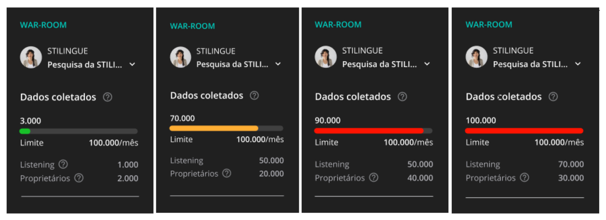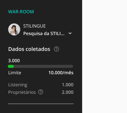 Contagem de Publicações - Listening 8 de maio de 2024 14:49 Atualizado Índice: Acesso Exibição Desbloqueio da pesquisa Como posso visualizar? Acompanhe o status das publicações trazidas em sua pesquisa pelo menu lateral na área de Listening e faça a gestão do seu limite de maneira rápida. A STILINGUE trouxe uma oportunidade para que você possa ter mais visibilidade sobre os dados coletados e limites da sua pesquisa. Pensando em melhorar sua autonomia na gestão das publicações coletadas, algumas informações relevantes estão disponíveis na plataforma para trazer em primeira mão os resultados de coleta. Isso significa mais facilidade para você e sua equipe. Acesso As informações ficam no menu lateral na área do Mural de Publicações, do Listening: Exibição 1. Dados coletados Listening É importante ressaltar que o cálculo em Listening corresponde às publicações de mar aberto (orgânicas). Nesse espaço também pode ser coletadas publicações de páginas proprietárias, se as publicações (mar aberto e proprietárias) estiverem relacionadas com os termos inseridos nos Grupos - dentro da Configuração de Pesquisa. Proprietários Já para dados Proprietários, é a coleta geral das publicações das páginas presentes no módulo de Métricas Proprietárias, incluindo os comentários. Observação: a coleta é contabilizada individualmente, ou seja, uma publicação de Listening não será contada duas vezes se corresponder a uma coleta feita em Métricas Proprietárias. 2. Limite Aqui o limite do painel é exibido conforme o detalhado no contrato do seu plano para a pesquisa analisada, seja pelo volume total de publicações ou pela quantidade mensal estabelecida. A barra indica o volume de publicações coletadas até o momento em relação ao número total desse limite. Um ponto importante é a cor da barra, que destaca o quanto resta do espaço total para as publicações serem coletadas: Quando a pesquisa ainda possui espaço para a coleta, a barra fica na cor verde; Quando a barra atingir 70% da coleta, ela ficará amarela; Quando atingir 90%, ficará vermelha; Quando chegar a 100%, ela se mantém vermelha. Atenção! Ao atingir 100% da coleta em Listening, a pesquisa será pausada. Caso a pesquisa atinja 100% da coleta em Métricas Proprietárias, a barra de progresso ficará vermelha, mas a pesquisa não será pausada. Para os dois casos, você será notificado com mensagens de alerta na página inicial do Mural de Publicações (ao atingir 70%, 90% e 100%). Além disso, caso a pesquisa atinja 100% da coleta, um e-mail será enviado comunicando sobre o bloqueio da pesquisa. Desbloqueio da pesquisa Para que sua pesquisa volte a coletar publicações, você tem a opção de entrar em contato com seu Gerente de Contas e rever os limites dos painéis, ou enviar uma mensagem ao time de atendimento pelo chat da plataforma para tirar dúvidas. Além disso, a Central de Ajuda conta com um material que mostra algumas opções para liberar espaço na pesquisa. Observação: após excluir as publicações da pesquisa, o menu será atualizado em até 4h. Como posso visualizar? Esse guia retrata uma funcionalidade em fase de desenvolvimento e está disponível inicialmente para um número limitado de clientes. Se deseja ter mais informações e obter acesso, entre em contato com o seu Gerente de Contas. Para mais informações, acesse a discussão sobre o assunto em nossa comunidade ou os vídeos no nosso canal. 😃 Artigos relacionados Como realizar o reset de usuários pelo Beholder? O WhatsApp Business API do Blip Go! RCS- Tipos de conteúdos Como adicionar push notification no BLiP Chat Android Tratamento de dados de Mar Aberto - Youtube