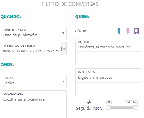 Quem - Filtro de Publicações 7 de maio de 2024 14:53 Atualizado Saiba como cruzar dados para localizar publicações orgânicas dentro da sua pesquisa. O Filtro de Publicações é uma funcionalidade disponível no Listening que permite que você escolha por quais parâmetros gostaria de visualizar suas publicações. Você pode unir informações como: data de publicação, tipo de interações, publicações anotadas, entre muitos outros. Localize o ícone do filtro à direita da página: 1. Gênero Você pode especificar se deseja buscar por publicações feitas por mulheres, homens ou organizações. Assim como nos filtros de sentimento e tipo de mídia, basta selecionar o ícone desejado para desativar a busca. 2. Autores Caso queira filtrar por publicações de autores específicos, escreva o nome (username) do autor nas redes sociais disponíveis na plataforma, ou o nome de algum portal ou blog. Para que o autor seja encontrado, é preciso que pelo menos uma publicação dele tenha sido coletada, de acordo com os parâmetros do filtro. Depois que carregar o nome, clique para selecionar e aplicar o filtro. Observação: letras em maiúsculo no username não interferem na busca. 3. Interesses Encontre os interesses que foram atribuídos aos usuários da sua pesquisa (autores) de acordo com o que eles publicam na internet. Para saber mais sobre essa categoria, acesse o guia. Assim como as tags, para negativar um interesse, escreva o sinal de negativo “-” na frente do interesse. 4. Seguidores Defina o número mínimo ou máximo de seguidores de determinado autor da publicação. Caso você selecione 1000 seguidores, apenas as publicações feitas por autores que tenham mais de 1000 seguidores na rede social (que foi coletada a publicação) serão retornadas pelo filtro. Para mais informações, acesse a discussão sobre o assunto em nossa comunidade ou os vídeos no nosso canal. 😃 Artigos relacionados NPS – Pesquisa de Satisfação Texto rotativo com spintax Como enviar notificações com o Google Assistant Quando - Filtro de Publicações Mensagens Ativas - Códigos de erro