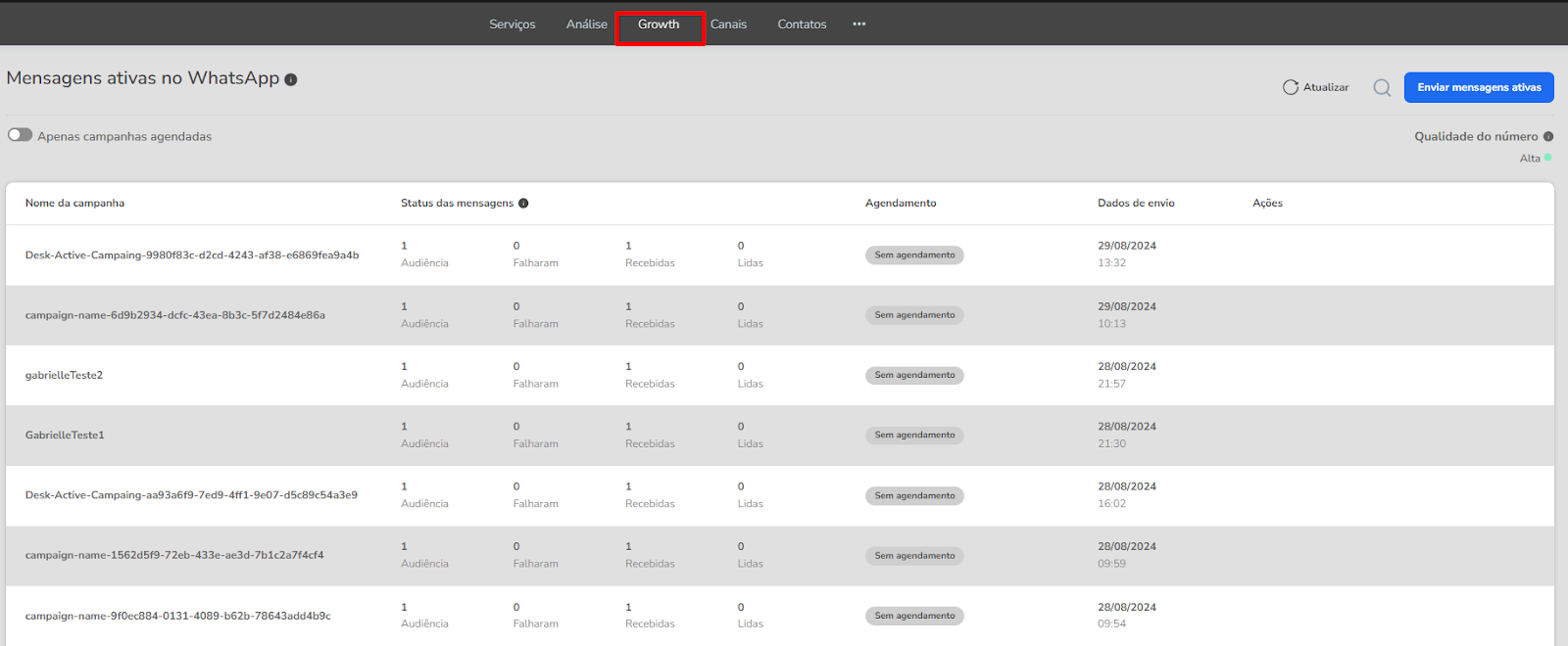 Como enviar notificações via API Active Campaign (Growth) 8 de janeiro de 2026 14:33 Atualizado Índice: Introdução Resumo das requisições Entidades Enviando uma campanha Campos da entidade da campanha Campanha individual Campanha em massa com disparo único Campanha em massa com audiência dinâmica (Beta) Criação da campanha Inclusão de audiência Envio da campanha Resumo da campanha Obter o resumo de uma campanha específica Audiência da campanha Obter audiência da campanha Relatório da campanha Perguntas frequentes IntroduçãoA API do Active Campaign permite a integração e automação de suas campanhas de marketing, gerenciamento de contatos, rastreamento de atividades e muito mais. Com nossa API, você pode acessar e manipular dados em tempo real, personalizar fluxos de trabalho automatizados e otimizar suas estratégias de marketing digital.Neste guia, você encontrará documentação completa sobre todos os endpoints, parâmetros de solicitação, exemplos de requisição e respostas esperadas. Aprenda a explorar recursos e aproveite todas as funcionalidades disponíveis.Resumo das requisiçõesCriar nova campanha: /campaign/full /campaign/v2 /audiences/v2/{CAMPAIGN_ID} /audiences/v2/{CAMPAIGN_ID}/file /dispatch/v2 Resumo da campanha /campaigns/summaries /campaigns/{CAMPAIGN_ID}/summaries Público da campanha/audiences/{CAMPAIGN_ID} Mensagens da campanha/messages/{CAMPAIGN_ID} Relatório da campanha/campaigns/{CAMPAIGN_ID}/reportsEntidadesCampanhaUma campanha refere-se a uma ação de envio de mensagens de forma individual ou em massa (CampaignType) para um grupo específico de usuários. É uma forma de alcançar e se comunicar com um grande número de usuários de forma automatizada e eficiente. Através da plataforma BLiP, os desenvolvedores e profissionais de marketing podem criar campanhas que enviam mensagens para o WhatsApp e configurar o redirecionamento do cliente para uma etapa (StateId) do fluxo do bot (FlowId) ao responder uma mensagem. As campanhas podem ser configuradas para enviar mensagens em tempo real ou agendadas (scheduled) para um horário específico. AudiênciaA audiência é o público-alvo específico da campanha de marketing. Ela é composta por uma lista de indivíduos que receberão a mensagem.Cada item contém um número de telefone (recipient) e os parâmetros referentes a ele que serão adicionados à mensagem (messageParams). MensagemA entidade "message" representa a mensagem que será enviada na campanha de marketing. Possui o nome do template (messageTemplate) que contém o conteúdo da mensagem e uma lista de parâmetros que serão utilizados para personalizar a mensagem com os valores específicos de cada destinatário (messageParams). Enviando uma campanhaA API do Active Campaign permite a criação de campanhas para envio individual ou em lote. Campos da entidade da campanha Campo Descrição Obrigatório Id Identificador único da campanha. Name O nome da campanha. * CampaignType O tipo de estratégia de envio da campanha. Individual ou em massa. * Scheduled A data para agendamento da campanha. O padrão de formato de data esperado é UTF MasterState Estado do roteador filho para fluxo de redirecionamento. FlowId Identificação do fluxo do bot. É único por bot e pode ser recuperado dentro das configurações do builder. * StateId O StateId é o identificador do estado específico em que o bot se encontra dentro do fluxo de conversa. * ChannelType É a definição do canal que será utilizado no disparo. Se não for informado, então utilizará o canal WhatsApp como padrão. WhatsApp ou GoogleRcs SourceApplication Identificador de ferramenta de origem da campanha. Caso as campanhas tem múltiplas origens, esse campo pode ajudar a marcar onde cada uma foi criada. WhatsApp ou GoogleRcs Tags Elementos personalizados que permitem agrupamentos das campanhas. Conteúdo deve ser passado como um array. WhatsApp ou GoogleRcs As informações da audiência são: Campo Descrição Obrigatório Recipient Quem irá receber a campanha. Deve ter DDI + DDD + número de telefone. O formato MSISDN será aplicado ao número, caso contrário. * MessageParams Parâmetros que fazem parte da personalização da mensagem. Se houver, adicione como dicionário. No campo MessageParams da entidade Audiência, todos os valores, exceto o número de telefone, serão salvos nos extras do contato. Isso significa que você pode incluir parâmetros adicionais e personalizados no campo MessageParams, e esses valores serão armazenados em contact.extras. Os "dados extras dos contatos" se referem a informações adicionais armazenadas sobre cada contato em um sistema de gerenciamento de contatos. Esses dados extras podem incluir campos personalizados que capturam informações específicas sobre cada contato, para permitir segmentação, personalização e análise mais eficazes das campanhas de marketing. Por exemplo, além dos dados comuns como nome e e-mail, você pode adicionar campos extras para armazenar informações como idade, localização geográfica, preferências de produto, histórico de compras, entre outros.As informações da mensagem são: Campo Descrição Obrigatório MessageTemplate Nome do template da mensagem Não existe template caso seja o canal RCS MessageParams Parâmetros que fazem parte da personalização da mensagem. Obs: O número de parâmetros precisa ser a quantidade exata de parâmetros do seu modelo de mensagem escolhido. Total de caracteres: 250 Listada em formato de array MessageContent Campo que possui o conteúdo da mensagem caso seja o canal RCS ChannelType É a definição do canal que será utilizado no disparo. Se não for informado, então utilizará o canal WhatsApp como padrão. WhatsApp ou GoogleRcs Campos de resposta da requisição preenchidos automaticamente Campo Descrição Status O status de envio da campanha. Created A data e hora de criação da campanha. FailedReason Motivo em caso de falha no envio. Campa