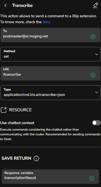 Blip Speech 29 de outubro de 2024 12:37 Atualizado Índice: Introdução Como funciona? Ativação Implementação Validação do tipo Obter a URL do json do áudio Transcrição Introdução O Blip Speech é o nosso provedor de voz, e permite que você adicione a capacidade de entendimento de voz ao seu Contato Inteligente através da transcrição de áudios. Por exemplo: Você possui um contato inteligente com uma cascata pronta para interagir com o cliente de forma autônoma, mas quando recebe um áudio no Whatsapp precisa informar ao cliente que ele precisa interagir por texto. O Blip Speech possibilita que você adicione ao seu fluxo um bloco para transcrever os áudios recebidos pelo cliente e assim possa interagir com ele somente pela voz! Como funciona? O Blip Speech é um comando do Blip, facilitando, assim, a integração da tecnologia proprietária de transcrição da Blip ao Contato Inteligente. A integração permite: A fácil integração da tecnologia ao fluxo conversacional; A transcrição automática de áudios em português brasileiro; Possibilidade de transcrever áudios em inglês, espanhol e francês. Ativação Ao ativar e conectar a integração na tela de Provedores de IA, ela deverá ser configurada no fluxo bot. Esteja ciente de que ao confirmar o uso do Blip Speech, você poderá receber uma cobrança. Consulte a tabela de preços no link do modal, e entenda os custos. Estamos desenvolvendo uma tela que irá mostrar informações sobre o consumo, ela estará disponível em breve. Implementação Antes de implementar o Blip Speech no fluxo conversacional, é necessário realizar algumas etapas no fluxo conversacional. Validação do tipo A primeira etapa é a validação do tipo da mensagem recebida pelo bot. Ou seja, permitir que a mensagem seja transcrita apenas se o tipo dela for um áudio. Obter a URL do json do áudio Em uma ação de entrada no bloco que a transcrição será realizada, basta colocar a variável de entrada referente a variável da mensagem de áudio enviada pelo usuário, como na imagem abaixo: Ainda nessa ação, clicando em SCRIPT, obtenha a URL usando o código em javascript abaixo: function run(input){ input = JSON.parse(input) return input['uri']} E por último, colocar uma variável de retorno que terá o valor da URL pronta para ser transcrita no passo a seguir. Transcrição Para realizar a transcrição, é necessário processar um comando como ação de entrada. O comando deve ser preenchido conforme a imagem abaixo. A variável de resposta pode ter o nome da sua escolha. No exemplo abaixo, a variável que será retornada com a transcrição é a transcriptionResult. Clicando em Recursos, você irá colocar o json que contém as informações necessárias para se comunicar corretamente com o Blip Speech. São elas: url: Variável que corresponde a url do áudio enviado; guid: Variável com identificador alfa numérico único; contactId: Variável com a identidade da aplicação do bot (igual a 'identifier@domain'); maxDuration: Máximo de um áudio que será transcrito, em segundos. Caso não seja fornecido um valor de maxDuration, será definido por default como 600 segundos. language: O idioma dos áudios que serão transcritos. . Caso não seja fornecido, seu valor será por default “auto”, que faz o sistema de transcrição detectar automaticamente a língua do áudio enviado antes de realizar a transcrição. Como resultado, você terá um json dessa forma: { "url":"{{urlAudio}}", "guid":"{{random.guid}}", "contactId":"{{contact.identity}}",, "maxDuration":240, "language":"pt"} Seguindo os passos acima, ao final desse fluxo você terá uma variável que contém a transcrição do áudio enviado, para poder seguir as tratativas do seu fluxo conversacional. Ou se preferir, pode fazer download deste fluxo clicando aqui, e importar no builder do seu contato inteligente. Para mais informações, acesse a discussão sobre o assunto em nossa comunidade ou os vídeos no nosso canal. 😃 Artigos relacionados Carrossel Templates Mensagens Ativas - Códigos de erro Gravação e envio de áudio Envio de Mensagens Ativas do WhatsApp no Blip Desk Como enviar email pelo bot através do Builder