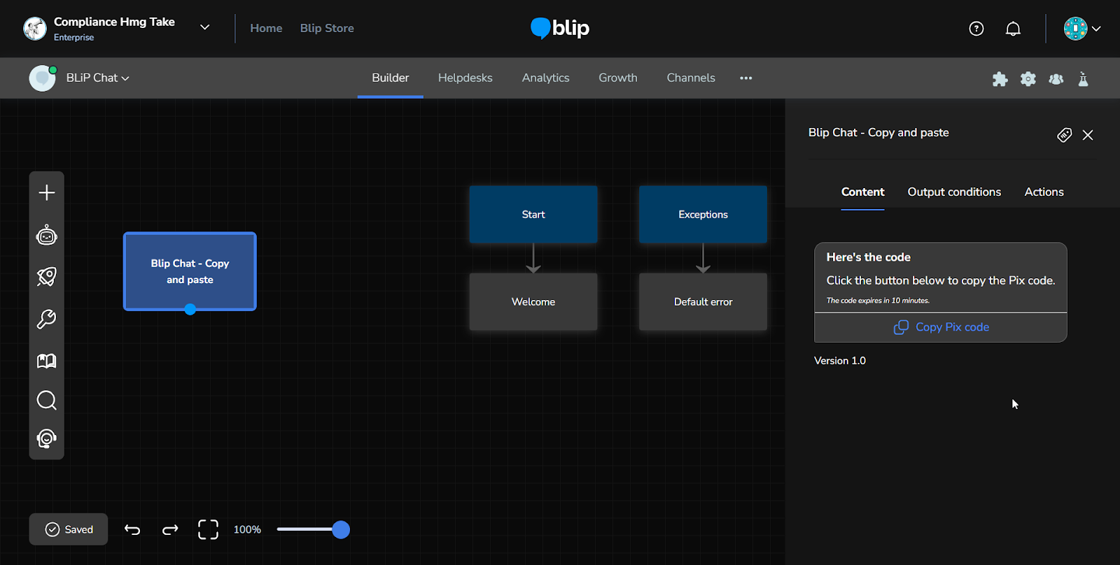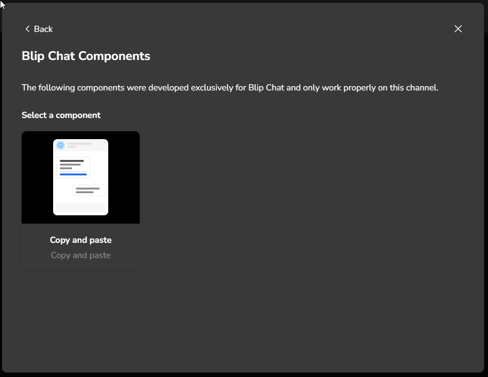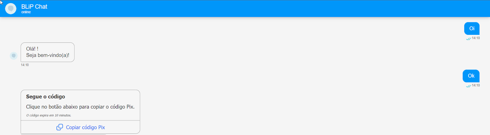 Como enviar Copia e Cola pelo BLiP Chat? 9 de outubro de 2024 17:48 Atualizado Índice: Pré-requisitos Configurando o Copia e Cola no Builder Componente Lime do Copia e Cola Copia e Cola no BLiP Chat Este é um componente exclusivo para o BLiP Chat, seu conteúdo não será renderizado por outros canais nas conversas com os usuários. Com esse componente você pode configurar dados para serem exibidos com título, corpo, rodapé e o botão para ação de copiar o valor que é definido na configuração do componente. Pré-requisitos A seguir temos os pré-requisitos para o uso do Copia e Cola no BLiP Chat para algumas das formas de integração. Caso a sua integração inclua o uso de um iframe que englobe o BLiP Chat de alguma forma, mesmo que não seja recomendado para todos os casos (usando nossos métodos que já possuem um iframe, como o uso do blip-chat-widget ou nossos pacotes mobile nativos), por garantia você pode liberar o uso do clipboard adicionando a propriedade ‘allow’ com pelo menos o valor ‘clipboard-read; clipboard-write’ como nos exemplos abaixo: iframe.setAttribute('allow', 'clipboard-read; clipboard-write') ou <iframe allow="clipboard-read; clipboard-write"></iframe> Url e chave do bot Uma integração direta com a url e chave do bot, seu próprio website deve permitir o uso do microfone. Se o uso inclui algum iframe, conferir os pré-requisitos gerais. Pacote blip-chat-widget Caso a sua integração com o BLiP Chat se deu através da instalação do pacote node do blip-chat-widget (blip-chat-widget - npm), deve se usar a versão mínima 1.10.1. Script do blip-chat-widget Se sua integração ocorreu através da injeção do script como na documentação: Como adicionar um bot em um site utilizando o Blip Chat?. Se a rota para o seu script já estiver como https://unpkg.com/blip-chat-widget não é necessário nenhuma ação, ele já está sempre com a versão mais atualizada. Porém se foi especificado uma versão na sua url deve ser pelo menos a 1.10.1 como a seguir: https://unpkg.com/blip-chat-widget@1.10.1. Android Nativo Para a integração com Android Nativo (Como adicionar um bot em um aplicativo Android utilizando o BLiP Chat?), seu aplicativo deve estar preparado para requisitar a permissão de uso do clipboard. Documentação de desenvolvedor do Android explicando o que são e como requisitar as permissões: Permissões no Android. iOS Nativo Para a integração com iOS Nativo (Como adicionar um bot em um aplicativo iOS utilizando o BLiP Chat?), seu aplicativo deve estar preparado para requisitar a permissão de uso do clipboard. Documentação de desenvolvedor do iOS explicando o que são e como requisitar as permissões: Requesting authorization to capture and save media | Apple Developer Documentation. Configurando o Copia e Cola no Builder Na tela do builder de seu bot que vai ser usado somente para o BLiP Chat você começará adicionando um componente novo. Selecione a opção 'Adicionar bloco’. Então você pode selecionar a opção ‘Componentes exclusivos’. Um modal aparecerá com as opções de canais disponíveis. Após selecionar ‘Blip Chat’ a tela do modal irá exibir os componentes exclusivos disponíveis para aquele canal. Ao selecionar o componente do ‘Copia e cola’ um novo bloco será adicionado ao builder. Ao clicar em editar o componente na aba que abriu à direita, as primeiras opções de edição aparecerão. Nessa tela é possível alterar o título, corpo e rodapé. Para editar o texto do botão e o valor que será copiado para a área de transferência do usuário deve-se clicar no botão que fará a ação. Assim uma nova janela de edição será aberta. Caso seja necessário somente alterar o valor do botão, deve-se clicar em ‘Salvar’ e posteriormente clicar no ícone de salvar o componente como um todo. Você pode deixar um valor fixo ou configurar um valor através das variáveis disponíveis no builder igual qualquer outro componente. Componente Lime do Copia e Cola Para configurar o componente de forma dinâmica ou enviar por conta própria a message, ele tem o seguinte padrão Lime: { to: 'to@msging.net', from: 'from@msging.net', type: 'application/vnd.lime.copy-and-paste+json', content: { header: 'Segue o código', body: 'Clique no botão abaixo para copiar o código Pix.', footer: 'O código expira em 10 minutos.', button: { text: 'Copiar código Pix', value: 'Value' } } } Copia e Cola no BLiP Chat Com seu componente corretamente preenchido e o fluxo funcionando, ele aparecerá da seguinte forma no BLiP Chat Se o usuário clicar no botão ‘Copiar código Pix’ do exemplo, o conteúdo do valor definido no componente será copiado para a sua área de transferência. Para mais informações, acesse a discussão sobre o assunto em nossa comunidade ou os vídeos no nosso canal. 😃 Artigos relacionados Como realizar o reset de usuários pelo Beholder? Como utilizar o Agente de IA? Criando mensagens interativas no WhatsApp Como adicionar o Blip Chat em um site Wix Como adicionar push notification no BLiP Chat Android