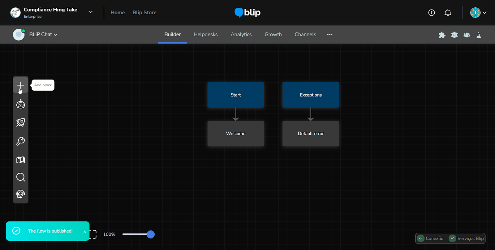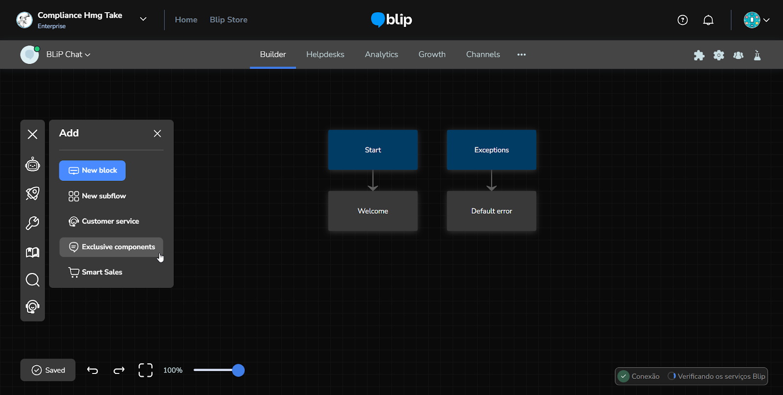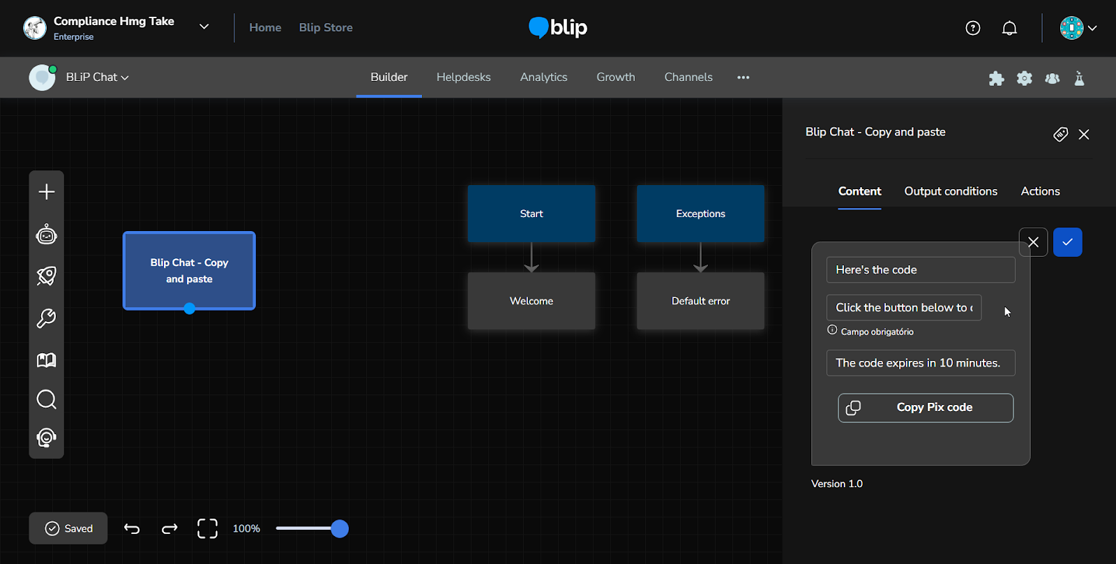 Como enviar Copia e Cola pelo BLiP Chat? 9 de outubro de 2024 17:48 Atualizado Índice: Pré-requisitos Configurando o Copia e Cola no Builder Componente Lime do Copia e Cola Copia e Cola no BLiP Chat Este é um componente exclusivo para o BLiP Chat, seu conteúdo não será renderizado por outros canais nas conversas com os usuários. Com esse componente você pode configurar dados para serem exibidos com título, corpo, rodapé e o botão para ação de copiar o valor que é definido na configuração do componente. Pré-requisitos A seguir temos os pré-requisitos para o uso do Copia e Cola no BLiP Chat para algumas das formas de integração. Caso a sua integração inclua o uso de um iframe que englobe o BLiP Chat de alguma forma, mesmo que não seja recomendado para todos os casos (usando nossos métodos que já possuem um iframe, como o uso do blip-chat-widget ou nossos pacotes mobile nativos), por garantia você pode liberar o uso do clipboard adicionando a propriedade ‘allow’ com pelo menos o valor ‘clipboard-read; clipboard-write’ como nos exemplos abaixo: iframe.setAttribute('allow', 'clipboard-read; clipboard-write') ou <iframe allow="clipboard-read; clipboard-write"></iframe> Url e chave do bot Uma integração direta com a url e chave do bot, seu próprio website deve permitir o uso do microfone. Se o uso inclui algum iframe, conferir os pré-requisitos gerais. Pacote blip-chat-widget Caso a sua integração com o BLiP Chat se deu através da instalação do pacote node do blip-chat-widget (blip-chat-widget - npm), deve se usar a versão mínima 1.10.1. Script do blip-chat-widget Se sua integração ocorreu através da injeção do script como na documentação: Como adicionar um bot em um site utilizando o Blip Chat?. Se a rota para o seu script já estiver como https://unpkg.com/blip-chat-widget não é necessário nenhuma ação, ele já está sempre com a versão mais atualizada. Porém se foi especificado uma versão na sua url deve ser pelo menos a 1.10.1 como a seguir: https://unpkg.com/blip-chat-widget@1.10.1. Android Nativo Para a integração com Android Nativo (Como adicionar um bot em um aplicativo Android utilizando o BLiP Chat?), seu aplicativo deve estar preparado para requisitar a permissão de uso do clipboard. Documentação de desenvolvedor do Android explicando o que são e como requisitar as permissões: Permissões no Android. iOS Nativo Para a integração com iOS Nativo (Como adicionar um bot em um aplicativo iOS utilizando o BLiP Chat?), seu aplicativo deve estar preparado para requisitar a permissão de uso do clipboard. Documentação de desenvolvedor do iOS explicando o que são e como requisitar as permissões: Requesting authorization to capture and save media | Apple Developer Documentation. Configurando o Copia e Cola no Builder Na tela do builder de seu bot que vai ser usado somente para o BLiP Chat você começará adicionando um componente novo. Selecione a opção 'Adicionar bloco’. Então você pode selecionar a opção ‘Componentes exclusivos’. Um modal aparecerá com as opções de canais disponíveis. Após selecionar ‘Blip Chat’ a tela do modal irá exibir os componentes exclusivos disponíveis para aquele canal. Ao selecionar o componente do ‘Copia e cola’ um novo bloco será adicionado ao builder. Ao clicar em editar o componente na aba que abriu à direita, as primeiras opções de edição aparecerão. Nessa tela é possível alterar o título, corpo e rodapé. Para editar o texto do botão e o valor que será copiado para a área de transferência do usuário deve-se clicar no botão que fará a ação. Assim uma nova janela de edição será aberta. Caso seja necessário somente alterar o valor do botão, deve-se clicar em ‘Salvar’ e posteriormente clicar no ícone de salvar o componente como um todo. Você pode deixar um valor fixo ou configurar um valor através das variáveis disponíveis no builder igual qualquer outro componente. Componente Lime do Copia e Cola Para configurar o componente de forma dinâmica ou enviar por conta própria a message, ele tem o seguinte padrão Lime: { to: 'to@msging.net', from: 'from@msging.net', type: 'application/vnd.lime.copy-and-paste+json', content: { header: 'Segue o código', body: 'Clique no botão abaixo para copiar o código Pix.', footer: 'O código expira em 10 minutos.', button: { text: 'Copiar código Pix', value: 'Value' } } } Copia e Cola no BLiP Chat Com seu componente corretamente preenchido e o fluxo funcionando, ele aparecerá da seguinte forma no BLiP Chat Se o usuário clicar no botão ‘Copiar código Pix’ do exemplo, o conteúdo do valor definido no componente será copiado para a sua área de transferência. Para mais informações, acesse a discussão sobre o assunto em nossa comunidade ou os vídeos no nosso canal. 😃 Artigos relacionados Como realizar o reset de usuários pelo Beholder? Como utilizar o Agente de IA? Criando mensagens interativas no WhatsApp Como adicionar o Blip Chat em um site Wix Como adicionar push notification no BLiP Chat Android