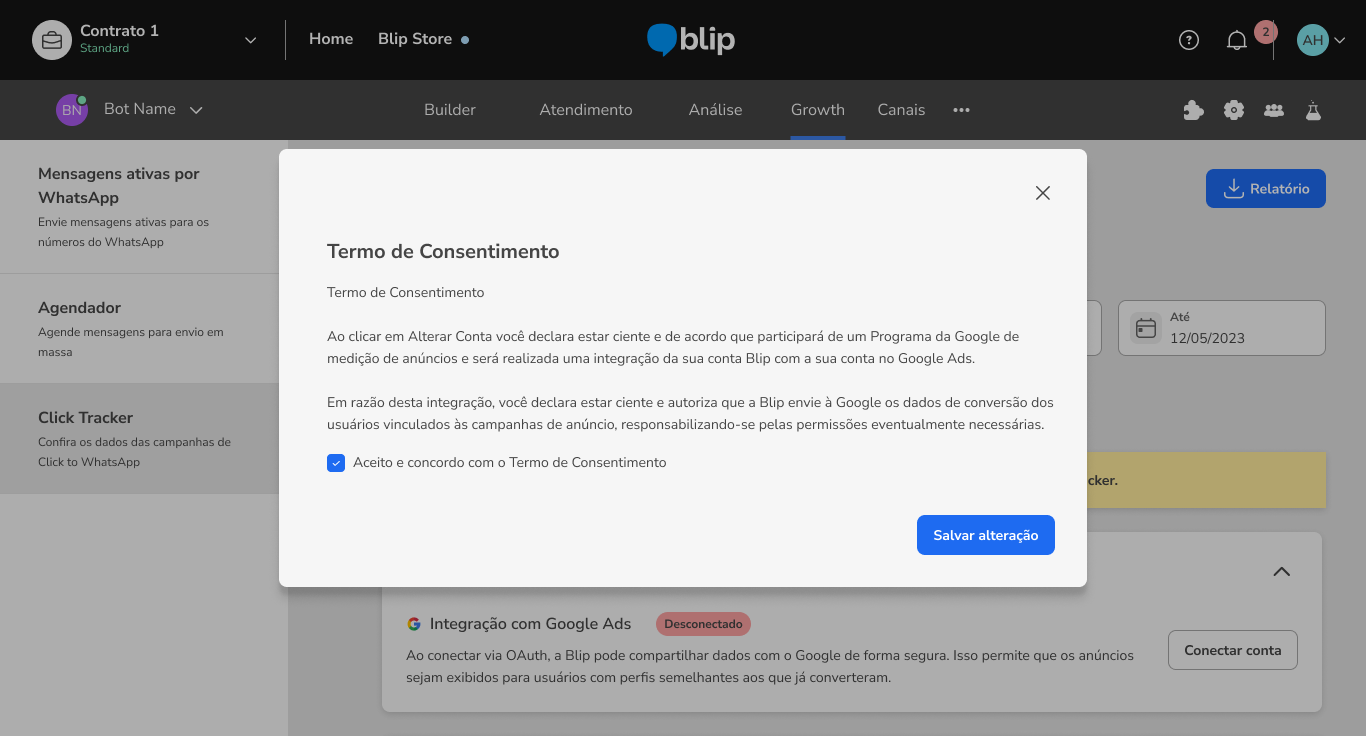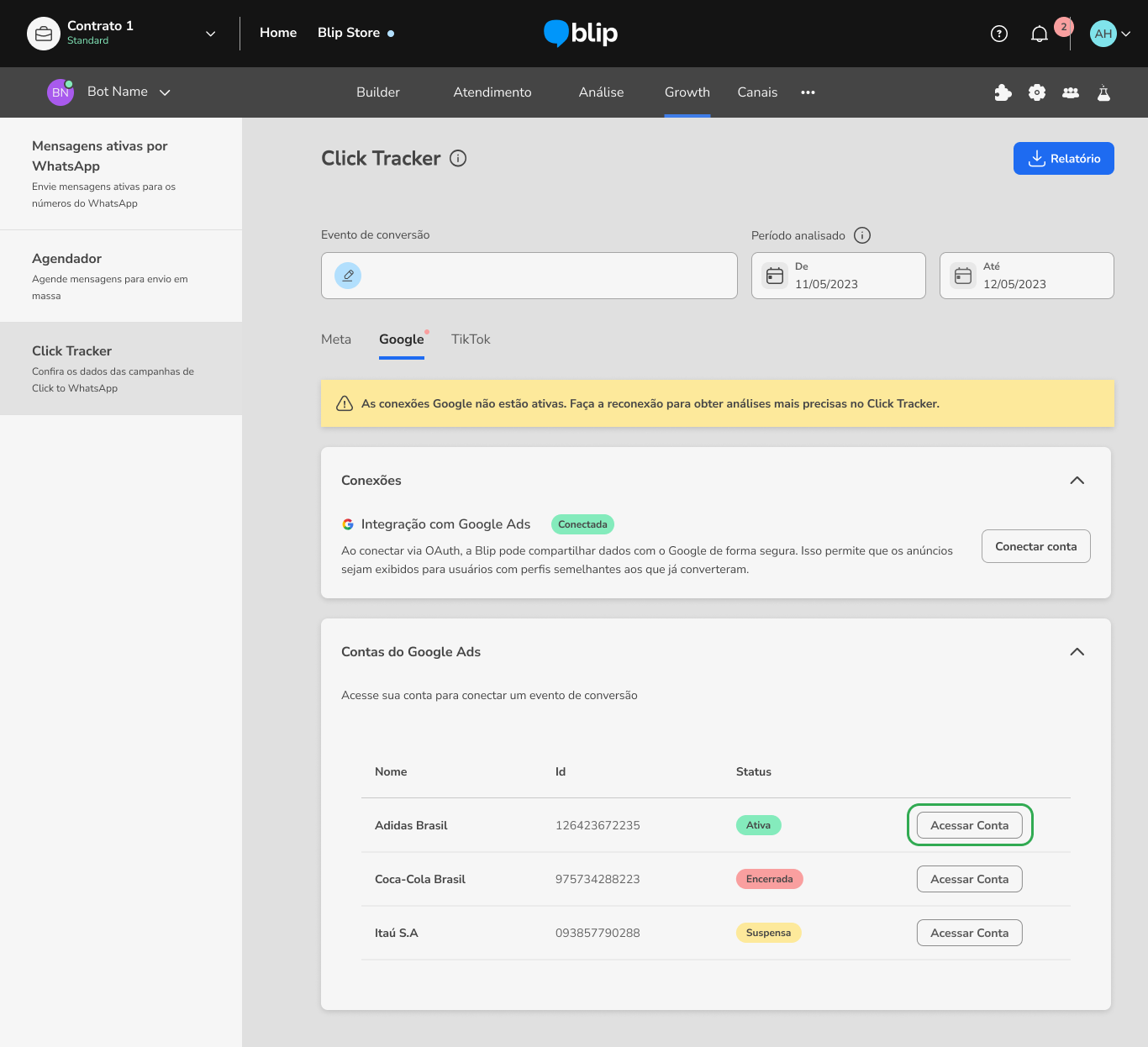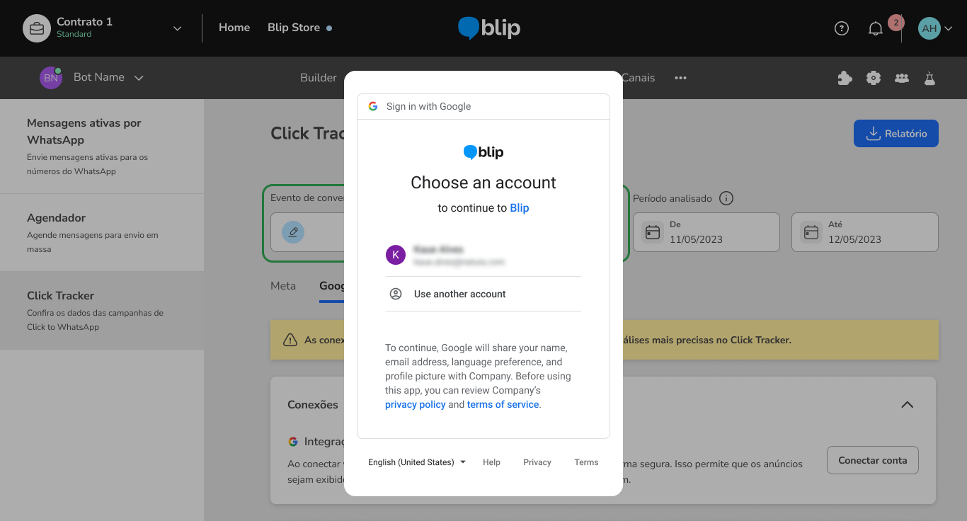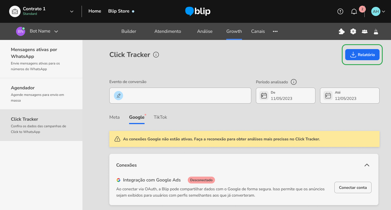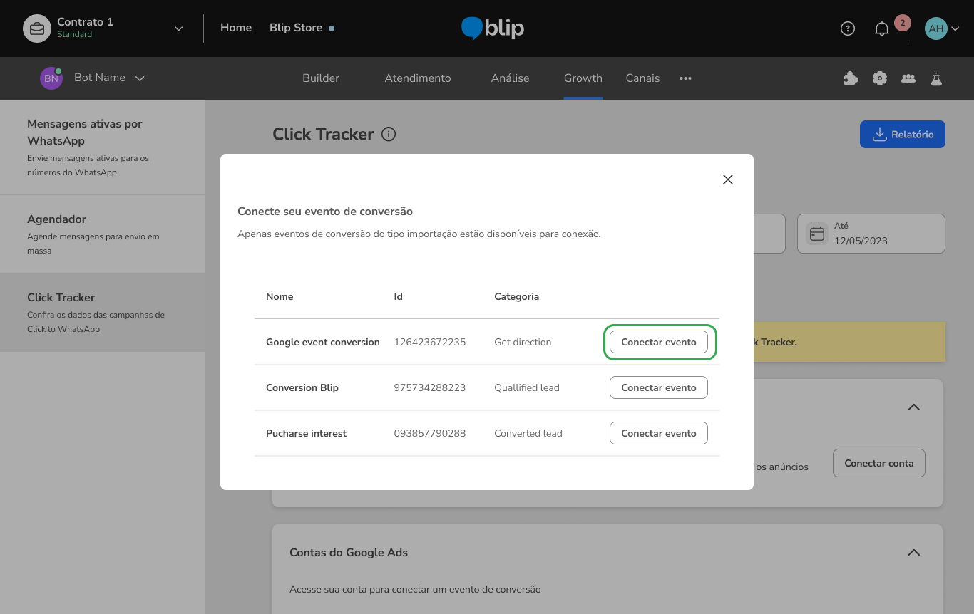 Como conectar o Click Tracker as suas campanhas Google CTWA 11 de março de 2026 19:15 Atualizado Índice: Por que integrar com Click Tracker? Criando a campanha de Google Message Ads Criando um evento no Builder Configurando um evento de conversão Como realizar a integração com Google Ads API via Google OAuth Visualizando o relatório de Google Ads FAQ Por que integrar com Click Tracker?Com Click Tracker as marcas têm mais visibilidade sobre a performance dos seus Click To WhatsApp no fluxo conversacional, podendo comparar o alcance de cada anúncio, quantas conversas foram geradas por cada um, e também quantas conversões aconteceram no fluxo conversacional.A integração entre Click Tracker e o Google Ads tem como objetivo permitir o acompanhamento de todas as conversas iniciadas no WhatsApp através de anúncios do Google, definir ponto de conversão na jornada e devolver os sinais de conversão para o Google (via API do Google Ads), o que permite melhorar a performance das campanhas de CTWA e otimizar o desempenho dos criativos.Para ativar a integração de forma completa, é necessário: Criar e configurar a campanha no Google Ads Manager conforme as orientações do Google Em seguida, crie um evento no Builder (event track) e utilize o mesmo como um evento de conversão no Click Tracker. Conecte a conta Google utilizada na gestão das campanhas na aba correspondente do Click Tracker, aceite o Termo de Consentimento e selecione o evento de conversão desejado para a campanha configurada. Por fim, entre em contato com o CSM responsável pela conta da sua empresa na blip e informe o ID de cliente do Google Ads. Para obter esse ID basta acessar o Google Ads, clicar na foto do seu perfil e o ID estará disponível em informações da conta. Criando a campanha de Google Message Ads:O primeiro passo é criar a campanha no Google Ads, definindo o objetivo de acordo com a sua estratégia, o público que deseja alcançar e o orçamento disponível. Essas configurações são importantes porque determinam como, quando e para quem seus anúncios serão exibidos. Saiba como Criar uma campanha.Após ter a campanha criada, adicione um Recurso de Mensagem (message asset), funcionalidade do Google Ads que permite incluir a opção de iniciar uma conversa diretamente pelo anúncio. Esse recurso pode direcionar o usuário para um aplicativo de mensagens configurado, como o WhatsApp, possibilitando o contato imediato com sua empresa. Para entender mais sobre esse recurso acesse: Recurso de mensagens. Criando um evento no BuilderCaso você ainda não utilize o Click Tracker e não tenha nenhum evento cadastrado no fluxo do seu Bot, é só seguir os passos abaixo e logo poderá analisar suas campanhas de CTWA com muito mais dados, para tomar decisões ainda mais inteligentes.Para criar um evento dentro do Builder, é necessário acessar a caixa de diálogo que representa o momento exato em que seu cliente realizará a ação que caracteriza a conversão desejada. Ao clicar na caixa, abrirá uma aba no lado direito da tela, com diversas opções de configurações extras.Nesta caixa lateral, é só ir em ações e criar uma nova ação de entrada ou de saída, do tipo Registro de Eventos. Esse tipo de registro exige a definição de uma Categoria e uma Ação. Como o Click Tracker utiliza o nome cadastrado em “Categoria”, é importante se atentar na escolha deste nome, de forma que faça sentido para o evento mapeado e facilite as análises futuras na ferramenta e nos relatórios. Não tem qualquer problema repetir em Ação o mesmo nome cadastrado em Categoria.Uma mesma Categoria pode ser cadastrada em diversos blocos do Builder. Caso o usuário final possa converter em vários pontos diferentes da conversa, é possível mapear todos os eventos com o mesmo nome, de forma a analisar este conjunto de pessoas no Click Tracker posteriormente,Documentação de apoio disponível no Blip Help:Ação: Registro de eventos Configurando um evento de conversãoFeita a criação do evento no Builder, o próximo passo para utilizar o Click Tracker é configurar o evento de conversão. Para isso, é só clicar no ícone de lápis no campo “Evento de Conversão” e abrirá um pop-up para escolher um entre todos os eventos cadastrados anteriormente no Builder. OBS: Para que o evento seja exibido nesta listagem é preciso que exista ao menos um registro realizado pela plataforma, ou seja, é necessário que um lead já tenha sido convertido pelo menos uma vez para que a plataforma crie o evento e habilite a localização deste evento na listagem desta tela. Como realizar a integração com Google Ads API via Google OAuthPara realizar a integração do Click Tracker com o Google Ads API usando OAuth, para permitir que a Blip devolva os sinais de conversões que aconteceram nas conversas iniciadas através de anúncios, clique em “Conectar Conta”:Faça o aceite dos termos Blip:Realize o login com a sua conta Google Ads:Pronto você está conectado. Agora o próximo passo é entrar em na sua conta de Ads e conectar o Evento de conversão do tipo importação.Para isso, clique em "Acessar Conta":Em seguida, será exibido um modal onde você poderá conectar um evento de conversão. Para isso, selecione o evento desejado e clique em “Conectar evento”.Os eventos exibidos nesse modal são aqueles criados previamente na sua conta do Google Ads manager. Caso ainda não tenha criado eventos, esse modal aparecerá vazio. Nesse caso, será necessário criar os eventos diretamente no seu Google Ads Manager. Visualizando o relatório de Google AdsTenha acesso às principais informações sobre os seus anúncios publicados através do Google Ads. Para isso, selecione a aba “Google” no Click Tracker e clique no botão “Relatório de conversões”. Será então realizado o download de um arquivo em .csv contendo os seguintes dados: Número do telefone do contato; Data e hora do início da conversa; Data e hora