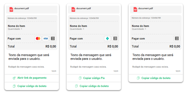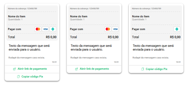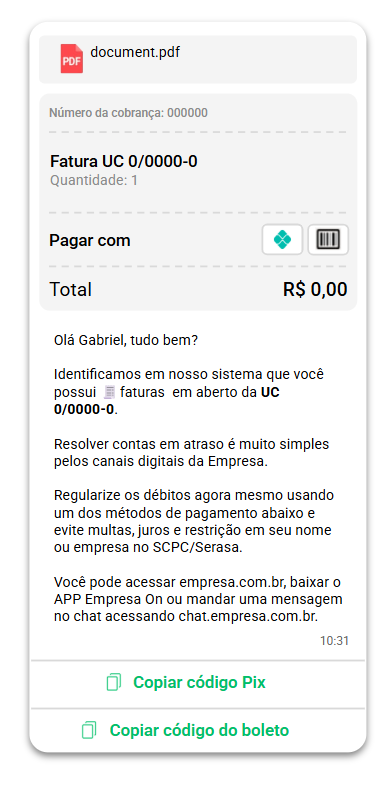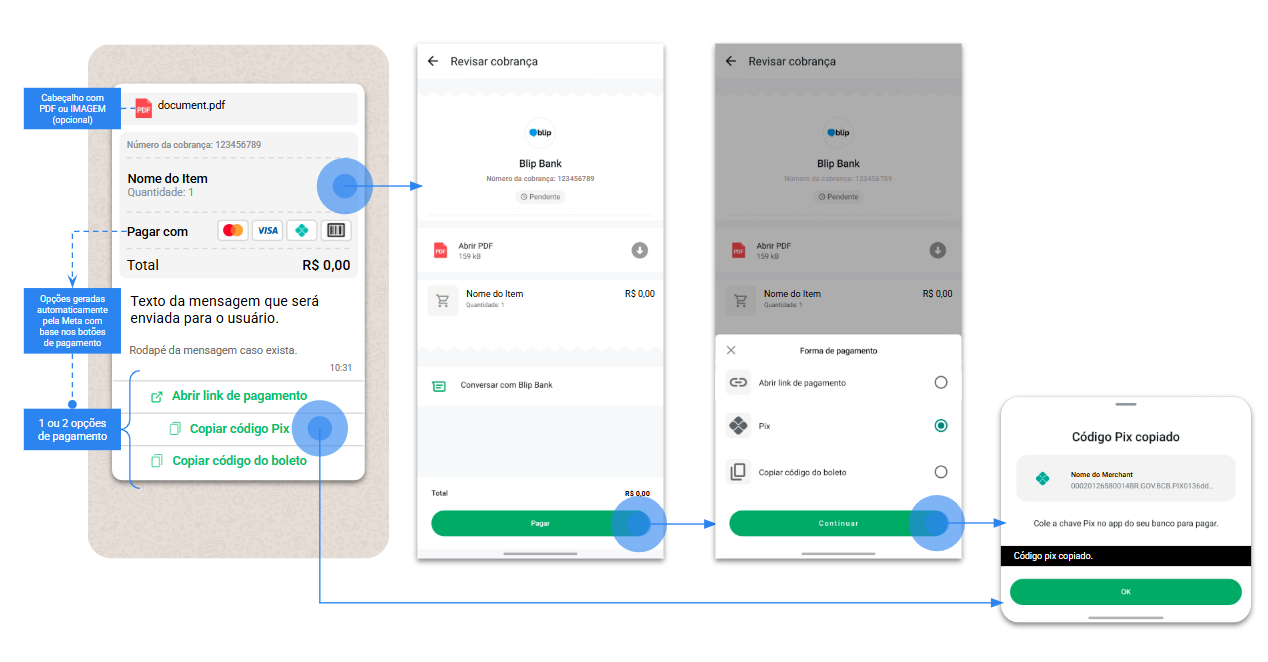 Mensagem Ativa de Pagamento no WhatsApp 17 de novembro de 2025 14:57 Atualizado Contexto• O componente "order_details" é um novo tipo de funcionalidade de pagamento disponibilizado pela Meta para o WhatsApp.• Ele permite que sua empresa envie aos clientes mensagens interativas, ativas ou durante o fluxo, com detalhes de pedidos e opções de pagamento diretamente no aplicativo.• Já é possível realizar o envio deste componente de forma ativa por meio da API Active Campaign da Blip.Benefícios para sua empresa🔹Nova fonte de receita: Abre potencial para novas fontes de receita aplicadas a diversos casos de uso como vendas e cobrança.🔹Jornada facilitada: Simplifica a experiência de pagamentos para seus clientes e com mais credibilidade.🔹Experiência aprimorada: Oferece uma nova e rica experiência para vendas e cobranças, com informações detalhadas de transações (produtos, valores, status) de forma interativa. Casos de usoO componente order_details é ideal para otimizar diversos fluxos de comunicação e transação no WhatsApp:🔹Cobranças e lembretes de pagamento: Envie cobranças diretas com opções de pagamento (Pix, link ou boleto) e anexo de fatura em PDF.🔹Confirmação de pedidos: Envie um resumo do pedido com valor total e detalhes dos itens após uma compra para pagamento.🔹Carrinho abandonado: Informe ao cliente sobre o status do pedido (ex: "pendente") e inclua detalhes de pagamento com este template.🔹Renovação de assinaturas/serviços: Facilite o pagamento de renovações com todas as informações necessárias.🔹Vendas diretas no atendimento: Permita que seus atendentes ou bots apresentem uma "cesta" de produtos e opções de pagamento de forma clara e interativa. Recursos suportadosEste componente oferece flexibilidade para a inclusão de diferentes métodos de pagamento e informações adicionais:🔹Métodos de pagamento Pix dinâmico: Envie um código Pix Copia e Cola que o cliente pode copiar para realizar o pagamento instantaneamente. Link de pagamento: Direcione o cliente para uma URL segura para finalizar o pagamento, como no caso de pagamentos com cartão de crédito e wallets. Boleto bancário: Forneça o código de barras do boleto para que o cliente possa efetuar o pagamento. 🔹Anexo de Documentos (Opcional): Você pode incluir um arquivo PDF (como um boleto, fatura ou comprovante) no cabeçalho da mensagem do template.🔹Flexibilidade de Conteúdo: A API Blip permite o envio do componente desde que pelo menos um dos itens de pagamento (Pix, Link, Boleto) e no máximo 2 itens, estejam presentes.🔹Ícones de Pagamento: Os ícones correspondentes aos métodos de pagamento (ícone do Pix, bandeiras de cartões, etc.) são exibidos conforme os métodos configurados. Guia de ImplementaçãoA funcionalidade de envio de mensagens com o template order_details é realizada através da API de Active Campaign da Blip, permitindo que estas mensagens sejam enviadas como Notificações Ativas. 🔹Tipos de envio suportados Individual: Para enviar o componente de pedido para um único destinatário. Em Lote (Batch/Massa): Para enviar o componente de pedido para múltiplos destinatários de uma vez. 🔹Estrutura da mensagem (Payload) Para enviar o order_details como um template, você deve fazer uma chamada POST para o endpoint de mensagens do WhatsApp e anexar um objeto de mensagem com type=template. Variável #payment#: Mesmo que seu template order_details não possua outras variáveis, é obrigatório passar a variável #payment# no objeto audience.messageParams. Esta variável contém diretamente o JSON completo do objeto order_details. Estrutura básica do JSON #payment# (Order Details): reference_id: Um ID único para o pedido (obrigatório). type: "digital-goods" (produtos digitais) ou "physical-goods" (produtos físicos) (obrigatório). payment_type: "br" (para pagamentos no Brasil) (obrigatório). currency: "BRL" (Moeda) (obrigatório). total_amount: Objeto contendo o value (valor total em centavos) e offset (normalmente 100 para 2 casas decimais, ex: R$ 150,00 = value: 15000, offset: 100) (obrigatório). payment_settings: Uma lista de objetos com as configurações dos métodos de pagamento. order: (obrigatório) Objeto com detalhes do pedido como status, subtotal, tax, shipping, discount e items. Configurações específicas para payment_settings: Pix dinâmico Link de pagamento Boleto: Estrutura de Itens do Pedido (Dentro do objeto order) 🔹Anexo PDF no cabeçalhoPara incluir um PDF, use type=document no objeto parameter do componente header da mensagem do template. A API Blip permite o envio de PDF de boleto/fatura. 🔹Validações importantes Todas as URLs de pagamento devem usar HTTPS. Códigos de boleto e Pix devem seguir os formatos válidos (linha digitável e padrão BR Code, respectivamente). Todos os campos obrigatórios na estrutura do JSON devem ser fornecidos. O template order_details deve estar previamente aprovado no WhatsApp Business Manager. 🔹Campos message.messageParams e audience.messageParams O campo message.messageParams (na configuração geral da mensagem) deve conter apenas os nomes das variáveis que o template espera (ex: "cliente_nome", "pedido_numero", "valor_total", "#payment#"). Os valores dessas variáveis, incluindo o JSON completo do order_details para #payment#, devem ser preenchidos no audience.messageParams (para cada destinatário ou audiência). 🔹Método para envioO envio é realizado através do método CreateAndDispatchFullCampaignAsync, acessível via o endpoint POST /campaigns/full-campaign na API da Blip. Pontos de atenção🔹É necessário configurar pelo menos um método de pagamento.🔹É possível configurar até 2 métodos de pagamento diferentes no mesmo template.🔹É necessário criar os templates no WhatsApp Business Manager e que eles estejam aprovados.🔹A seguir, exemplos de combinações de métodos de pagamento: Referências e Suporte🔹Documentação Of