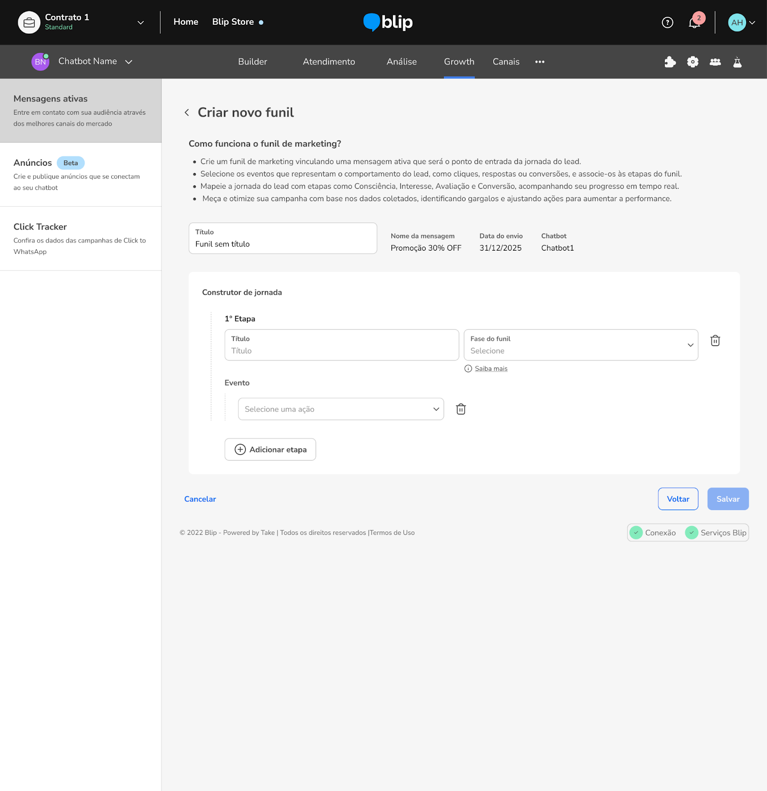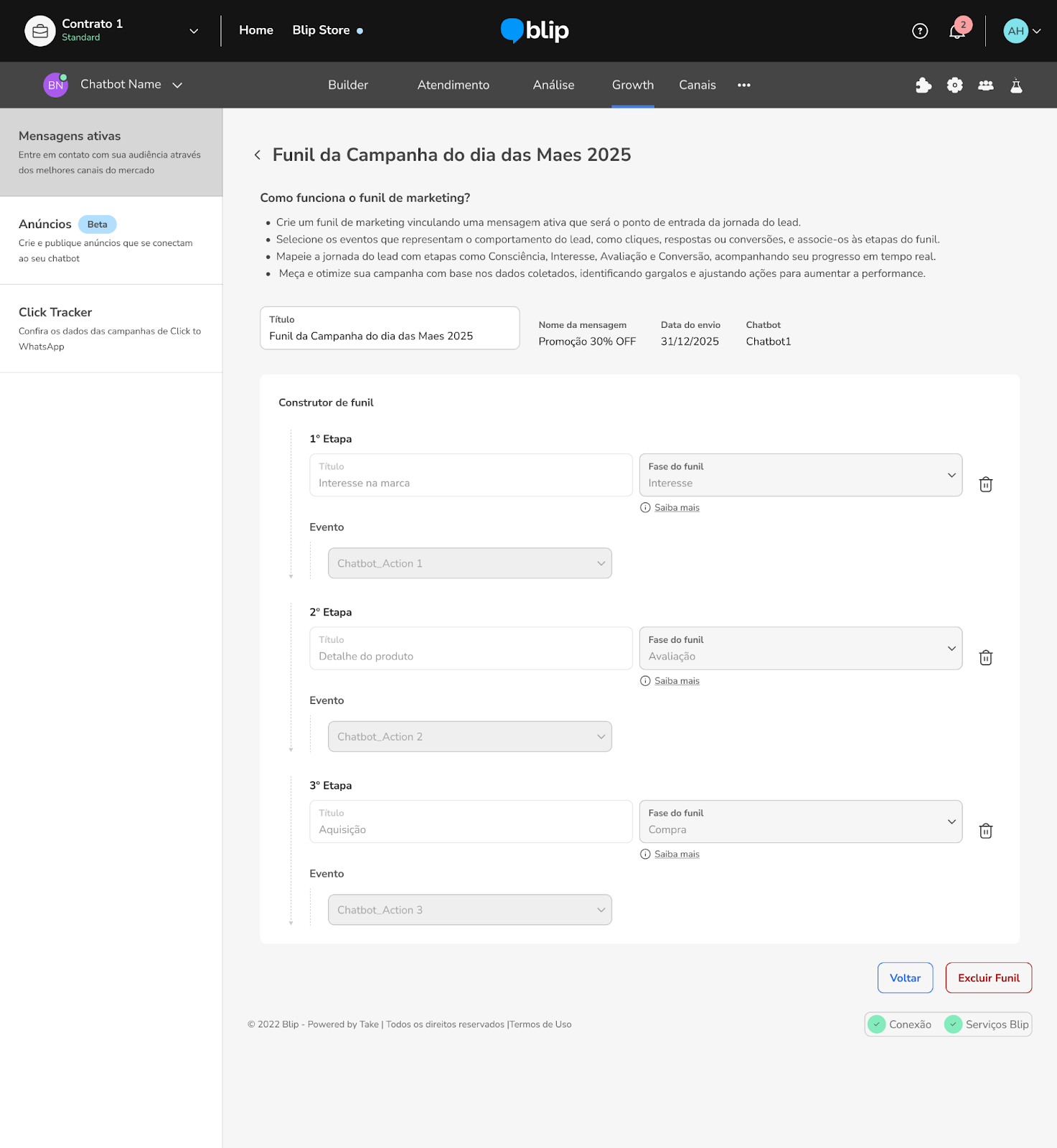 [Funcionalidade em Alpha] Como criar Funis de Marketing e analisar a performance de Mensagens Ativas 21 de agosto de 2025 14:27 Atualizado Índice: O que é um Funil de Marketing? Criando um Funil de Marketing Visualizando um Funil de Marketing Analisando a Performance de Mensagens Ativas FAQ O que é um Funil de Marketing?Um funil de marketing é uma representação visual das etapas pelas quais um potencial cliente (lead) passa até se tornar um cliente efetivo. Cada fase do funil corresponde a um momento específico da jornada do consumidor, permitindo à equipe de marketing e vendas identificar oportunidades de melhoria e aumentar a eficiência das campanhas.As fases do funil são:Consciência: É a primeira etapa, onde o lead descobre sua marca ou produto.Interesse: Nesta fase, o lead demonstra interesse em saber mais sobre o produto ou serviço.Avaliação: O lead compara e avalia as opções disponíveis para decidir qual atende melhor às suas necessidades.Compra: O lead realiza a compra, tornando-se um cliente efetivo.Recompra: O cliente volta a comprar ou contratar novamente, demonstrando satisfação e fidelidade à marca.Criando um Funil de MarketingPara criar um novo funil de marketing, siga os passos:Vá até a aba Mensagens Ativas.Localize a mensagem ativa para a qual deseja criar um funil e clique em Mais opções (ícone de três pontos).Escolha a opção Criar Funil de Marketing. Na tela de criação do funil, siga os passos:Dê um título para o seu funil.Confira as informações básicas, como o nome da mensagem ativa associada, data de visualização e o chatbot vinculado.Dê um nome à etapa do funil que está criando e selecione a fase do funil correspondente (consciência, interesse, avaliação, compra, recompra).Escolha qual evento do chatbot será acionado para identificar o lead nesta etapa do funil.Após preencher todas as informações, conclua o processo para salvar seu funil. Visualizando um Funil de MarketingPara visualizar um funil de marketing já criado:Retorne à aba Mensagens Ativas.Localize a mensagem ativa vinculada ao funil desejado.Clique em Mais opções e selecione Ver Funil de Marketing.Neste primeiro momento, não é possível editar o funil, apenas excluí-lo e criar um novo. A gestão completa estará disponível em breve. Analisando a Performance de Mensagens AtivasPara analisar a performance das suas campanhas, siga os passos:Vá até Mensagens Ativas.Clique em Mais opções na mensagem ativa que deseja analisar.Selecione Análise da Campanha para acessar o dashboard de performance. Aba PerformanceAqui você verá:Dados gerais: enviados, recebidos, lidos, respondidos e falhas.Funil de conversão, taxas de conversão e taxa de falhas.Picos de resposta e falhas de envio.Aba JornadaNesta aba, você encontrará um gráfico mostrando a jornada do lead pelo funil criado:Gráfico de barras exibindo cada etapa do funil.Informações detalhadas: taxa de conversão, número total de leads e comparação com períodos anteriores.Você pode acessar o funil diretamente por esta aba clicando em Ver Funil de Marketing.Aba AudiênciaAqui você pode identificar os leads específicos da campanha:Nome ou telefone do lead.Última interação com a campanha.Etapa atual do funil. FAQPosso editar o funil após criado?Neste primeiro momento não é possível editar, apenas excluir e criar novamente. A funcionalidade completa estará disponível em breve.O que acontece se eu excluir um funil já criado?O funil será permanentemente removido. Caso precise, crie novamente o funil e configure suas etapas.Como saber se a etapa do funil está registrando corretamente o lead?Certifique-se de associar corretamente o evento do chatbot durante a criação do funil. Verifique os dados na aba Jornada para confirmar o registro dos leads.Comunidade BlipYouTube BlipPara mais informações, acesse nossa comunidade ou os vídeos no nosso canal. 😃 Artigos relacionados NPS – Pesquisa de Satisfação Origem dos Likes - Facebook Gerenciar conta ativa Envio de Mensagens Ativas do WhatsApp no Blip Desk Zoom - Métricas Proprietárias