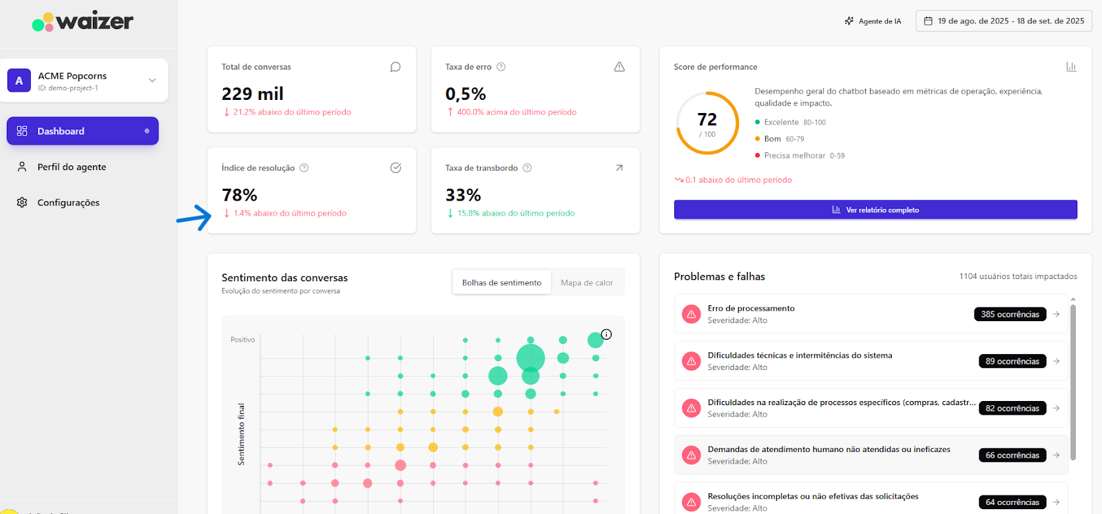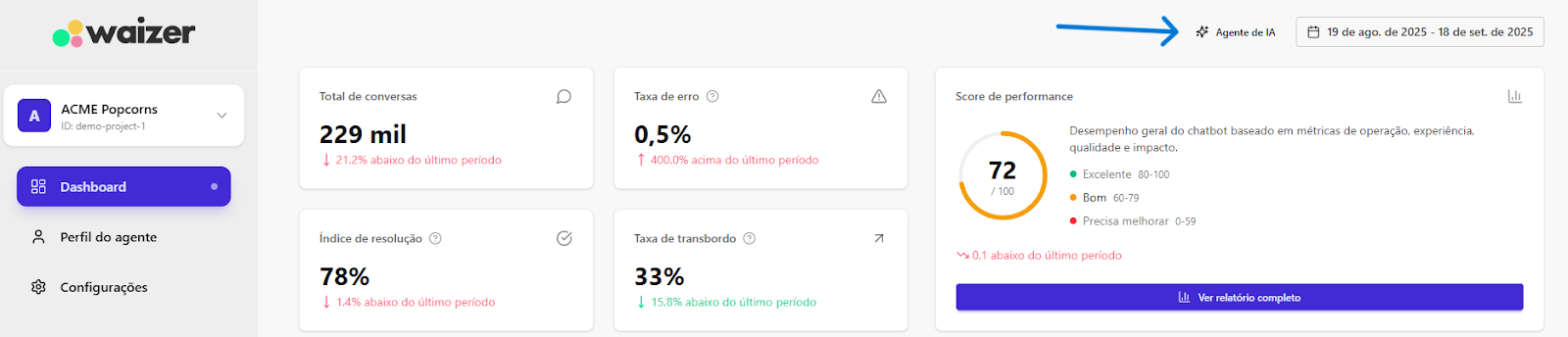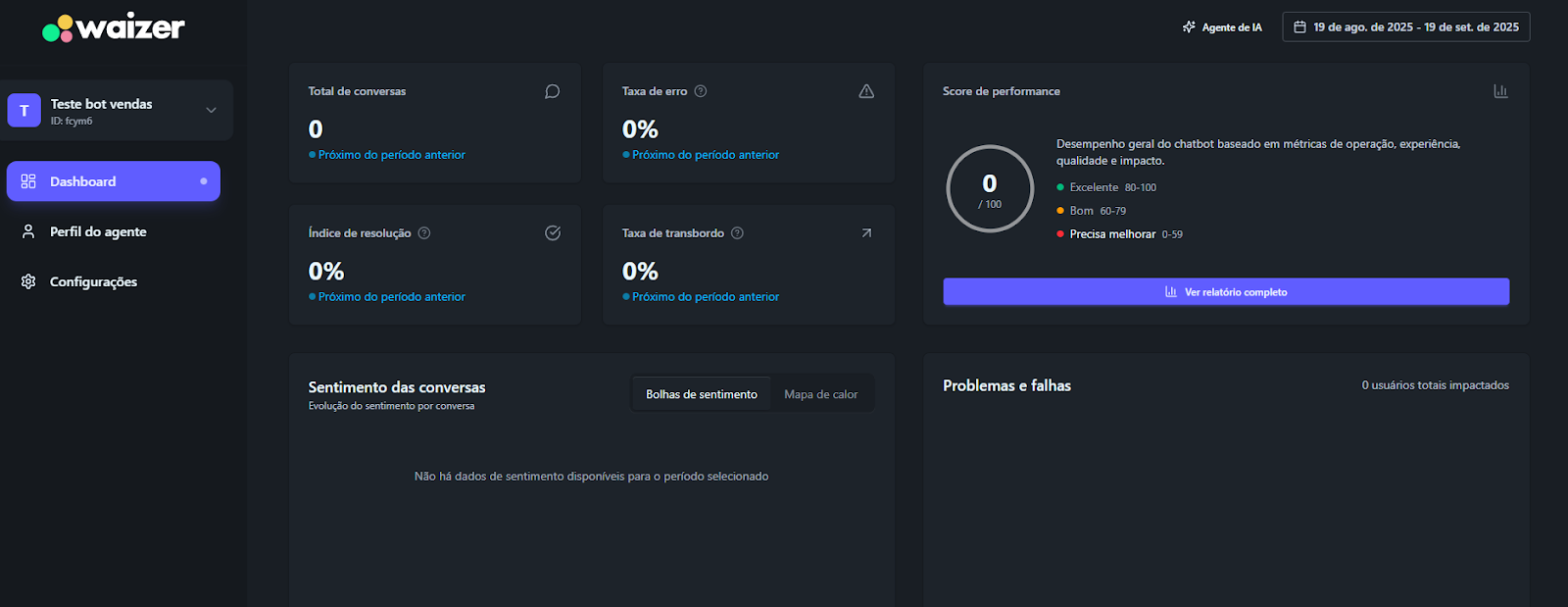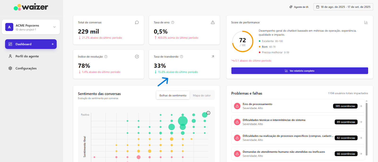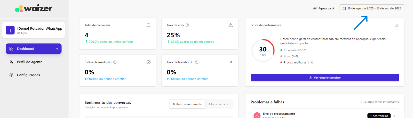 [Extensão] Documentação Waizer 23 de setembro de 2025 21:24 Atualizado Índice: Introdução Principais funcionalidades Casos de uso Instalação e configuração Aba Dashboard Agente de IA no Waizer Total de conversas Taxa de erro Taxa de transbordo Índice de resolução Score de performance Sentimento das conversas Quadrante de sentimentos Mapa de calor Problemas e falhas Tópicos mais discutidos Insights e sugestões Nuvens de palavras Aba - Perfil do agente KPIs Integrações Integração MCP (Model Context Protocol) Aba - Configurações Ajuste de cor do painel Suporte IntroduçãoUm atendimento de qualidade vai muito além da velocidade.O verdadeiro diferencial está na capacidade de entregar soluções completas já na primeira interação. Seja por meio da automação ou do atendimento humano, o objetivo é claro: garantir processos ágeis e proporcionar uma experiência satisfatória desde o primeiro contato.Cada negócio possui sua própria dinâmica, desafios e metas. Por isso, acompanhar métricas em tempo real é essencial para identificar oportunidades, ajustar estratégias rapidamente e alcançar resultados consistentes e mensuráveis.Apesar dos avanços tecnológicos, muitos atendimentos ainda enfrentam problemas comuns: Processos lentos. Loops de conversação. Respostas repetitivas. Falhas na compreensão da intenção do cliente. Esses erros frustram o usuário e impactam diretamente a percepção da sua marca.A experiência do cliente é um dos pilares mais importantes para qualquer negócio. É preciso refletir: O cliente está satisfeito? Conseguiu resolver o problema com rapidez? O bot compreendeu sua intenção com clareza? Foi com esse propósito que nasceu o Waizer: uma solução desenvolvida para traduzir e interpretar as interações do seu chatbot ou agente, garantindo conversas mais eficientes e resultados concretos para o seu negócio. Principais funcionalidadesMonitoramento de emoçõesAcompanhe em tempo real como os clientes se sentem ao interagir com o seu chatbot ou agente, oferecendo uma experiência mais humanizada e eficaz.Relatórios personalizadosAcesse análises detalhadas com informações estratégicas, incluindo: Volume total de interações. Principais problemas e tópicos levantados. Erros recorrentes. Taxas de transbordo para atendimento humano. Sugestões e insights estratégicosReceba insights práticos e acionáveis, baseado totalmente nos KPIs da sua empresa, como: Nuvem de palavras com os termos mais citados. Tópicos de maior recorrência. Recomendações para otimizar a jornada do cliente. Dicas para aumentar retenção e satisfação. Agente de IA da WaizerO Agente de IA da Waizer amplia a eficiência da análise e execução de ações. Busca rápida de dadosEncontre informações específicas em segundos, sem necessidade de navegar por relatórios complexos. Compreensão avançadaAnálise de dados em profundidade, compreendendo padrões ocultos, gargalos de atendimento e oportunidades de melhoria. Casos de uso Suporte ao cliente: redução do tempo médio de atendimento e identificação de gargalos. Vendas: mapeamento de objeções e otimização de scripts comerciais. Pesquisa de mercado: identificação de tendências com base nas interações. Qualidade de serviço: monitoramento do sentimento e da satisfação dos clientes. Instalação e configuração Acesse a Blip Store. Localize a extensão Waizer. Clique em Instalar no bot desejado (Router ou Sub-bot). Após a instalação, a tela que importará os dados estará disponível. Ao clicar em iniciar, a importação começa, podendo ter a duração de até 1 hora para a conclusão.Assim que completar, será indicada no painel.Clique em Ir para Dashboard.O dashboard já retorna todos os dados disponíveis para o bot.Atenção: Quando o projeto é criado na Blip, também é criado na plataforma https://app.waizer.ai onde também pode ser acessado.Aba DashboardNeste campo é possível filtrar os dados. Por padrão, vem filtrado nos últimos 30 dias. Para efeito comparativo de todos os gráficos, recomendamos que o filtro seja determinado em um tempo específico. A análise será realizada a partir do último período. Agente de IA no Waizer Busca de dados específicos de forma rápida. Compreensão dos dados e análises de forma mais aprofundada. Direcionamento de ações e comandos para a plataforma Blip e outras ferramentas que estejam integradas ao dashboard. É possível conversar em tempo real. Total de conversasO total de conversas indica a quantidade de interações registradas pelo bot em um determinado período.Como interpretar Esse número mostra o volume de atendimentos realizados, incluindo todas as mensagens trocadas entre clientes e o bot. O card apresenta também a variação em relação ao período anterior (aumento ou redução no número de conversas). Por que é importante? Permite acompanhar a demanda geral do canal de atendimento. Ajuda a identificar picos de uso em campanhas, lançamentos de produtos ou períodos sazonais. Serve como base de comparação para outros KPIs, como Taxa de erro, Índice de resolução e Taxa de transbordo. Taxa de erroA taxa de erro mostra o percentual de conversas que tiveram falhas durante a interação com o bot. Esses erros podem estar relacionados a: Problemas de processamento no fluxo. Falhas em integrações externas. Mensagens que não foram compreendidas pelo bot. Como interpretar Taxa baixa (ideal) → indica que o bot está funcionando de forma estável e compreendendo a maioria das interações. Taxa alta → sinaliza que há muitos erros técnicos ou de configuração, afetando a experiência do usuário Por que é importante? Reflete a saúde operacional do bot. Impacta diretamente na satisfação do cliente e no Índice de Resolução. Ajuda a identificar rapidamente se há instabilidades técnicas ou falhas no design do fluxo Taxa de transbordoA taxa de transbordo representa o percentual de conversas que prec