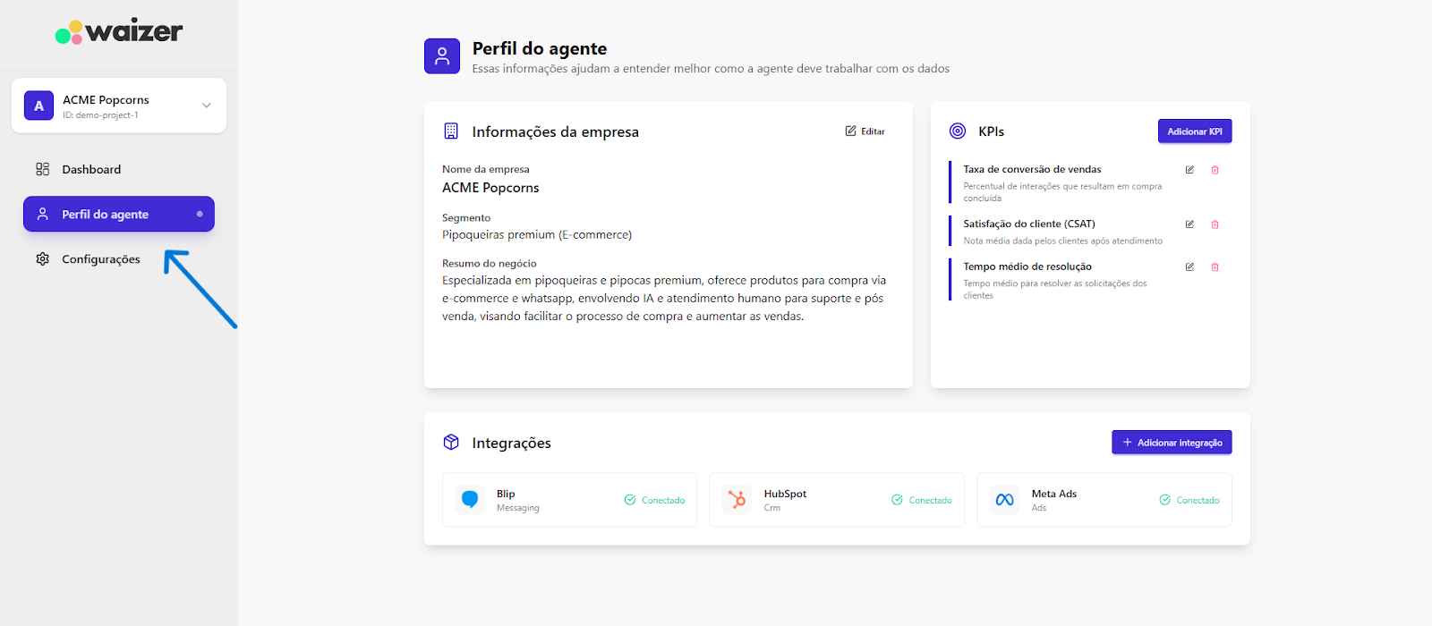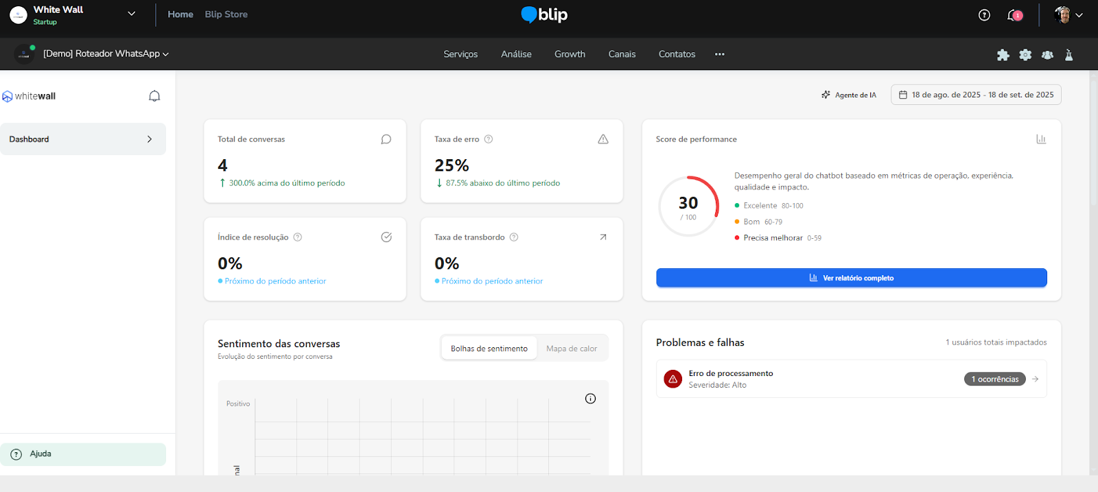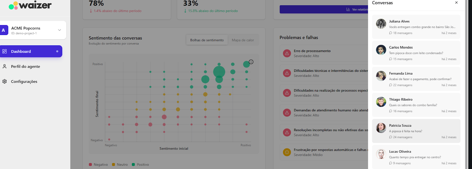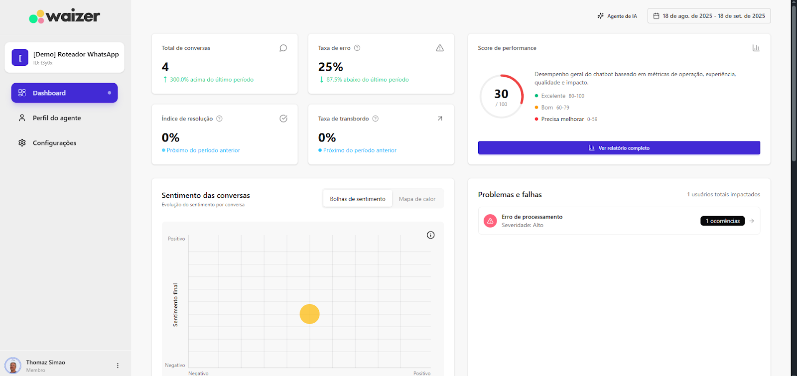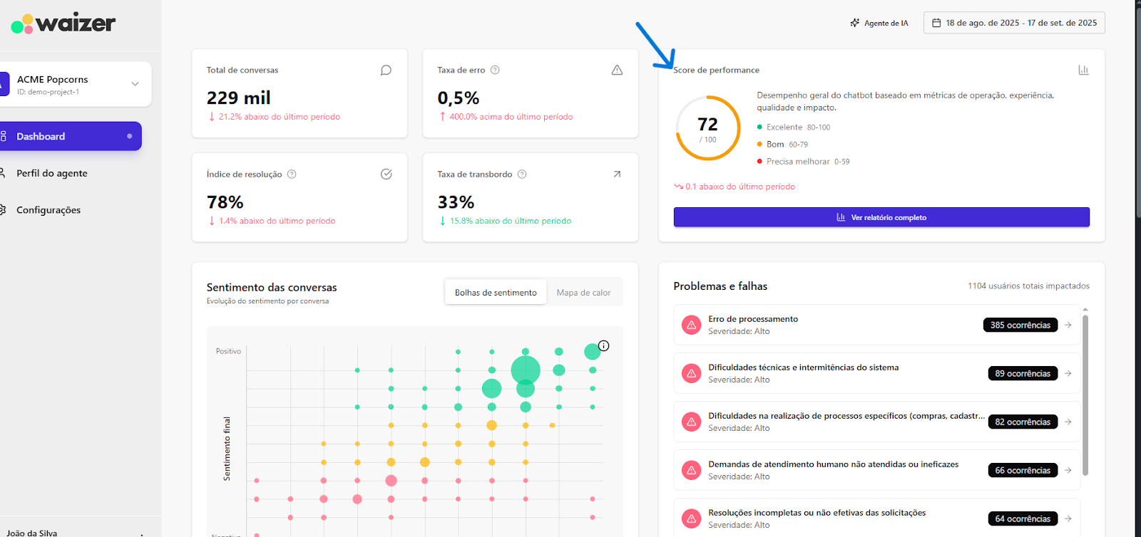 [Extensão] Documentação Waizer 23 de setembro de 2025 21:24 Atualizado Índice: Introdução Principais funcionalidades Casos de uso Instalação e configuração Aba Dashboard Agente de IA no Waizer Total de conversas Taxa de erro Taxa de transbordo Índice de resolução Score de performance Sentimento das conversas Quadrante de sentimentos Mapa de calor Problemas e falhas Tópicos mais discutidos Insights e sugestões Nuvens de palavras Aba - Perfil do agente KPIs Integrações Integração MCP (Model Context Protocol) Aba - Configurações Ajuste de cor do painel Suporte IntroduçãoUm atendimento de qualidade vai muito além da velocidade.O verdadeiro diferencial está na capacidade de entregar soluções completas já na primeira interação. Seja por meio da automação ou do atendimento humano, o objetivo é claro: garantir processos ágeis e proporcionar uma experiência satisfatória desde o primeiro contato.Cada negócio possui sua própria dinâmica, desafios e metas. Por isso, acompanhar métricas em tempo real é essencial para identificar oportunidades, ajustar estratégias rapidamente e alcançar resultados consistentes e mensuráveis.Apesar dos avanços tecnológicos, muitos atendimentos ainda enfrentam problemas comuns: Processos lentos. Loops de conversação. Respostas repetitivas. Falhas na compreensão da intenção do cliente. Esses erros frustram o usuário e impactam diretamente a percepção da sua marca.A experiência do cliente é um dos pilares mais importantes para qualquer negócio. É preciso refletir: O cliente está satisfeito? Conseguiu resolver o problema com rapidez? O bot compreendeu sua intenção com clareza? Foi com esse propósito que nasceu o Waizer: uma solução desenvolvida para traduzir e interpretar as interações do seu chatbot ou agente, garantindo conversas mais eficientes e resultados concretos para o seu negócio. Principais funcionalidadesMonitoramento de emoçõesAcompanhe em tempo real como os clientes se sentem ao interagir com o seu chatbot ou agente, oferecendo uma experiência mais humanizada e eficaz.Relatórios personalizadosAcesse análises detalhadas com informações estratégicas, incluindo: Volume total de interações. Principais problemas e tópicos levantados. Erros recorrentes. Taxas de transbordo para atendimento humano. Sugestões e insights estratégicosReceba insights práticos e acionáveis, baseado totalmente nos KPIs da sua empresa, como: Nuvem de palavras com os termos mais citados. Tópicos de maior recorrência. Recomendações para otimizar a jornada do cliente. Dicas para aumentar retenção e satisfação. Agente de IA da WaizerO Agente de IA da Waizer amplia a eficiência da análise e execução de ações. Busca rápida de dadosEncontre informações específicas em segundos, sem necessidade de navegar por relatórios complexos. Compreensão avançadaAnálise de dados em profundidade, compreendendo padrões ocultos, gargalos de atendimento e oportunidades de melhoria. Casos de uso Suporte ao cliente: redução do tempo médio de atendimento e identificação de gargalos. Vendas: mapeamento de objeções e otimização de scripts comerciais. Pesquisa de mercado: identificação de tendências com base nas interações. Qualidade de serviço: monitoramento do sentimento e da satisfação dos clientes. Instalação e configuração Acesse a Blip Store. Localize a extensão Waizer. Clique em Instalar no bot desejado (Router ou Sub-bot). Após a instalação, a tela que importará os dados estará disponível. Ao clicar em iniciar, a importação começa, podendo ter a duração de até 1 hora para a conclusão.Assim que completar, será indicada no painel.Clique em Ir para Dashboard.O dashboard já retorna todos os dados disponíveis para o bot.Atenção: Quando o projeto é criado na Blip, também é criado na plataforma https://app.waizer.ai onde também pode ser acessado.Aba DashboardNeste campo é possível filtrar os dados. Por padrão, vem filtrado nos últimos 30 dias. Para efeito comparativo de todos os gráficos, recomendamos que o filtro seja determinado em um tempo específico. A análise será realizada a partir do último período. Agente de IA no Waizer Busca de dados específicos de forma rápida. Compreensão dos dados e análises de forma mais aprofundada. Direcionamento de ações e comandos para a plataforma Blip e outras ferramentas que estejam integradas ao dashboard. É possível conversar em tempo real. Total de conversasO total de conversas indica a quantidade de interações registradas pelo bot em um determinado período.Como interpretar Esse número mostra o volume de atendimentos realizados, incluindo todas as mensagens trocadas entre clientes e o bot. O card apresenta também a variação em relação ao período anterior (aumento ou redução no número de conversas). Por que é importante? Permite acompanhar a demanda geral do canal de atendimento. Ajuda a identificar picos de uso em campanhas, lançamentos de produtos ou períodos sazonais. Serve como base de comparação para outros KPIs, como Taxa de erro, Índice de resolução e Taxa de transbordo. Taxa de erroA taxa de erro mostra o percentual de conversas que tiveram falhas durante a interação com o bot. Esses erros podem estar relacionados a: Problemas de processamento no fluxo. Falhas em integrações externas. Mensagens que não foram compreendidas pelo bot. Como interpretar Taxa baixa (ideal) → indica que o bot está funcionando de forma estável e compreendendo a maioria das interações. Taxa alta → sinaliza que há muitos erros técnicos ou de configuração, afetando a experiência do usuário Por que é importante? Reflete a saúde operacional do bot. Impacta diretamente na satisfação do cliente e no Índice de Resolução. Ajuda a identificar rapidamente se há instabilidades técnicas ou falhas no design do fluxo Taxa de transbordoA taxa de transbordo representa o percentual de conversas que prec