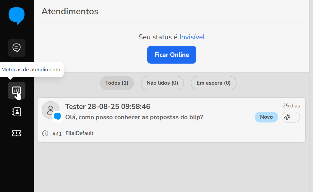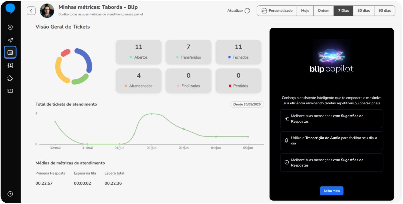 Desk - Minhas Métricas 6 de outubro de 2025 12:46 Atualizado Visão geralO atendimento dentro do desk ganha agora uma nova ferramenta. A partir do histórico de atendimento, estamos fornecendo indicadores para os atendentes, para que eles possam saber como anda sua performance de atendimento. Com o Minhas Métricas, o atendente terá acesso em tempo real a:Métricas gerais de tickets: abertos, finalizados, transferidos, fechados, abandonados e perdidos.Médias de métricas de atendimento: primeira resposta, espera na fila e espera total.A solução é uma implementação nativa no desk para a extensão Desk Addons, que teve muito sucesso fornecendo indicadores aos atendentes.O acesso é geral, todos os atendentes do Blip desk possuem acesso. Como acessarUm novo menu na barra lateral esquerda, “Métricas de atendimento” trás não apenas as métricas mencionadas, mas também alguns recursos do Blip Copilot, caso esteja ativo neste contato inteligente. O histórico pode ser pesquisado até nos últimos 90 dias, assim os atendentes podem consultar o histórico de seus indicados em outros períodos. Artigos relacionados Como conectar a um canal de atendimento personalizado Novo Histórico de Atendimentos Blip Copilot Comece por aqui: Como ativar a extensão QnA Maker Encerramento automático por inatividade do cliente