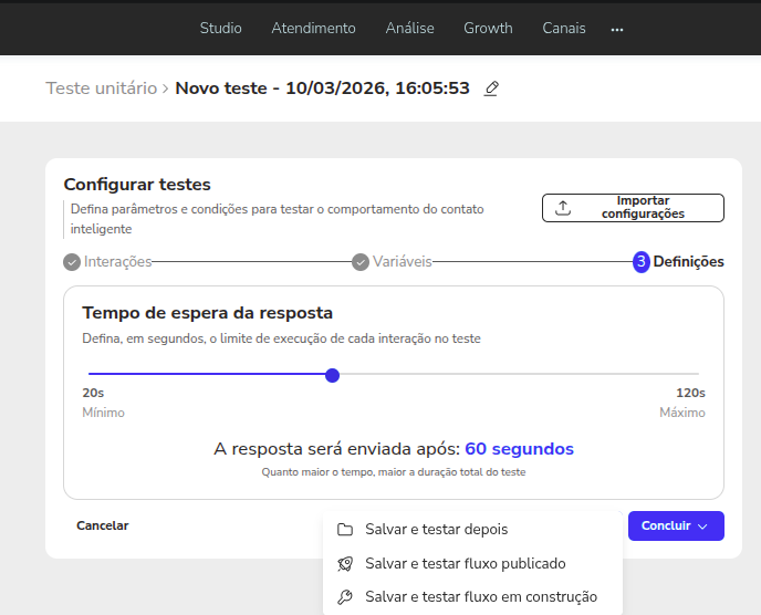 Testes Unitários 11 de março de 2026 12:24 Atualizado Índice Introdução Como acessar os Testes unitários Gerenciando Testes Unitários Configurando um Teste Unitário Executando e Analisando os Testes IntroduçãoA funcionalidade de Testes Unitários permite validar a precisão das respostas do seu fluxo conversacional, seja ele determinístico ou baseado em um agente de IA.O teste funciona configurando pares de interação: você define a mensagem de entrada, que pode ser um texto ou uma URL pública, e a resposta esperada, que pode ser um texto e/ou a validação de arquivos. Durante a execução, o teste envia cada interação e para ao detectar a primeira falha.Este processo garante que o sistema responda corretamente e permite ajustes rápidos em caso de problemas, sendo uma ferramenta essencial para verificar se os comportamentos esperados estão corretos antes de serem implantados em produção. A funcionalidade facilita a manutenção e a evolução contínua do seu Contato Inteligente. Como acessar os Testes unitáriosNa tela Studio: No canto superior direito da tela, clique no ícone . No menu que abrir, selecione Testes unitários. A seguinte tela se abrirá:Gerenciando Testes UnitáriosA tela de gerenciamento de testes unitários é o ponto de partida para visualizar, criar e executar os testes do seu bot ou agente de IACriar testeClique no botão Criar teste no canto superior direito ou caso não haja testes criados clicar no botão centralizado na lista Criar novo teste. É possível preencher todos os parâmetros para o teste manualmente ou importar um arquivo de configurações clicando no botão: Importar configurações: carregar um arquivo no formato do Blip com testes já prontos.Outros recursos Pesquisar: Campo de busca para encontrar testes específicos pelo nome. Lista de testes: Exibe todos os testes unitários criados, com as seguintes informações: Nome do teste: Nome definido para o teste. Interações: Número total de interações configuradas para o teste. Última execução: Data e hora da última vez que o teste foi executado. Último status: Indica o resultado da última execução do teste, podendo ser: Aguardando execução: O teste foi criado, mas ainda não foi executado. Sucesso: Todas as interações do teste passaram com sucesso (ex: "Sucesso 18/18"). Falha na métrica: O teste foi executado, mas algumas interações falharam (ex: a mensagem "Falha na métrica 25/57" indica que 25 interações falharam de um total de 57 interações configuradas.). Erro ao iniciar: O teste não pôde ser executado devido a um erro no início (ex: "Erro ao iniciar 2/3"). Interrompido: O teste pode ser interrompido durante a execução. Excluir testes: remove um ou mais testes Executar testes: executa um ou mais testes selecionados. Configurando um Teste UnitárioAo criar ou editar um teste, você terá acesso a três abas de configuração: Definições, Variáveis e Interações.InteraçõesEstá a aba é onde você define a sequência de perguntas e respostas para validar o comportamento do seu bot ou agente de IA Ordem: A ordem em que as interações serão executadas. Você pode reordenar as interações arrastando os ícones de grade. Descrição: A entrada de texto que será enviada para o bot. Resultado: O status da interação após a execução do teste, podendo ser: Aguardando execução: A interação ainda não foi testada. Sucesso: A resposta do bot correspondeu ao esperado. Erro ao iniciar: A interação não pôde ser iniciada. Falha na métrica: A resposta do bot não correspondeu ao esperado. Interrompido: O teste foi interrompido pelo usuário durante a execução. Configurando uma Interação:Ao clicar em uma interação, você pode expandir a seção para configurá-la em detalhes. Tipo de entrada: Define o tipo de entrada que você está enviando. Mensagem de Entrada: A entrada do usuário pode ser um texto simples ou uma URL pública apontando para um arquivo. Resposta Esperada: Blocos de Texto: A resposta esperada pode ser um ou mais trechos de texto. Quando se trata de formatos estruturados, como menus em JSON, é aconselhável incluir o JSON diretamente, garantindo que o sistema compreenda e compare conforme esperado. Tipo de Arquivo: Além disso, a resposta pode requerer a presença de arquivos específicos, como documentos, imagens, áudios ou vídeos. A configuração deve especificar não apenas o tipo, mas também a quantidade esperada. Por exemplo, se a interação deve retornar dois documentos, a configuração deve refletir isso. O teste falhará se a resposta não corresponder exatamente ao número e tipo de arquivos esperados. Texto: O texto que o bot receberá (ex: "Qual horário de funcionamento?"). Métrica de Comparação Textual:Similaridade: A métrica de similaridade avalia o quanto uma resposta gerada se aproxima da resposta esperada em termos de conteúdo e estrutura. Ela permite variações enquanto ainda considera a resposta válida.Recomendação de Uso: Ideal para sistemas flexíveis, como agentes inteligentes, que podem gerar respostas com alguma variação. Defina o ponto limite de similaridade para estabelecer o grau de variação aceitável. Por exemplo, um limite de 6.5 indica que a resposta deve ter pelo menos 65% de similaridade com o esperado. Correspondência Exata:Esta métrica requer que a resposta gerada seja completamente idêntica à resposta esperada, sem qualquer desvio ou variação, incluindo pontuação e caracteres especiais.Recomendação de Uso: Ideal para sistemas determinísticos onde a precisão é crucial. Garante que a resposta seja exatamente como esperado, assegurando consistência e precisão. Considera diferenças de formatação, como quebras de linha dentro de um bloco ou separação em blocos distintos, indicando mensagens enviadas separadamente. VariáveisNesta aba, você pode gerenciar as variáveis de contexto que serão usadas no fluxo de teste. Adicione, edite ou remova as 