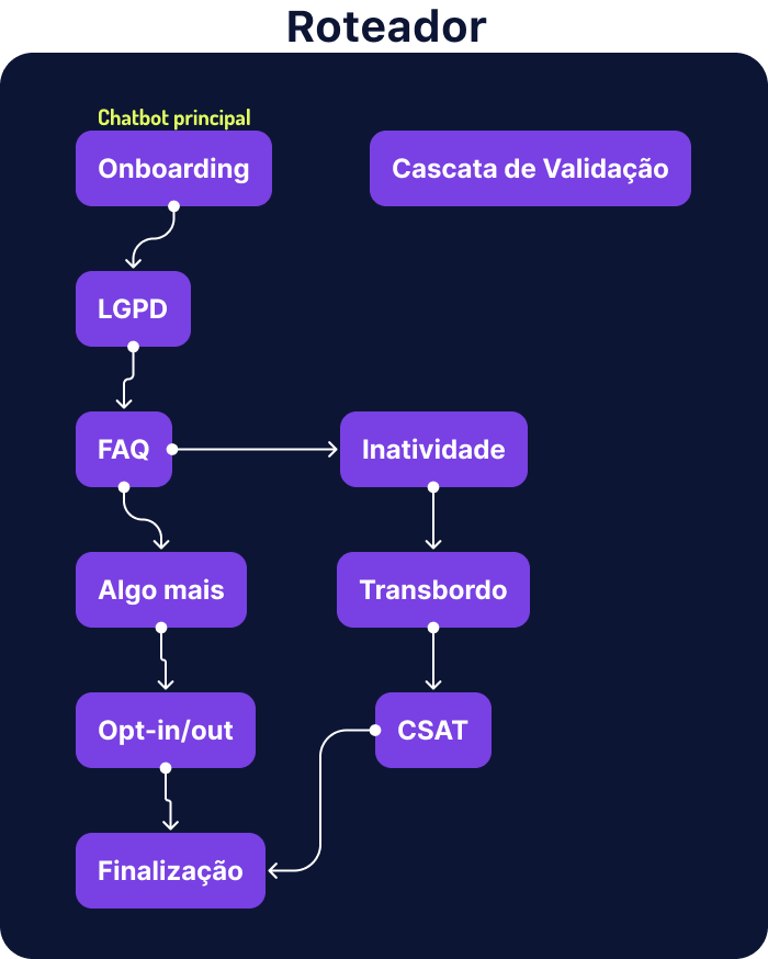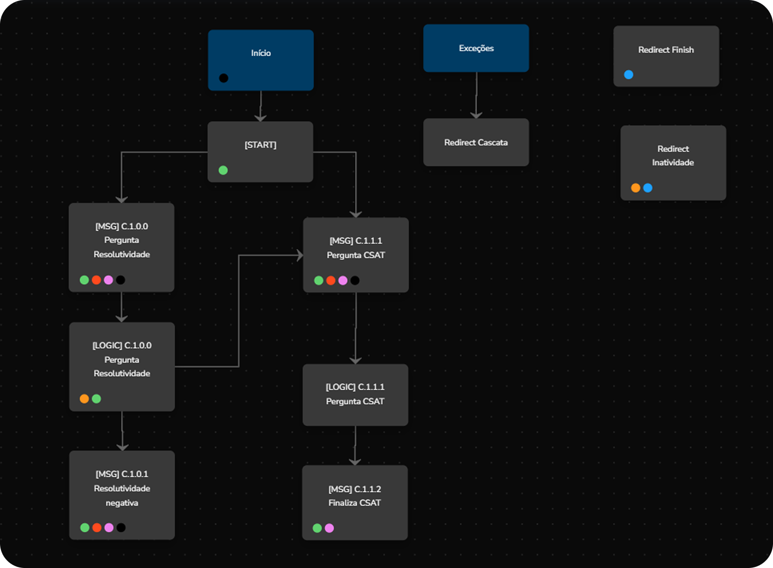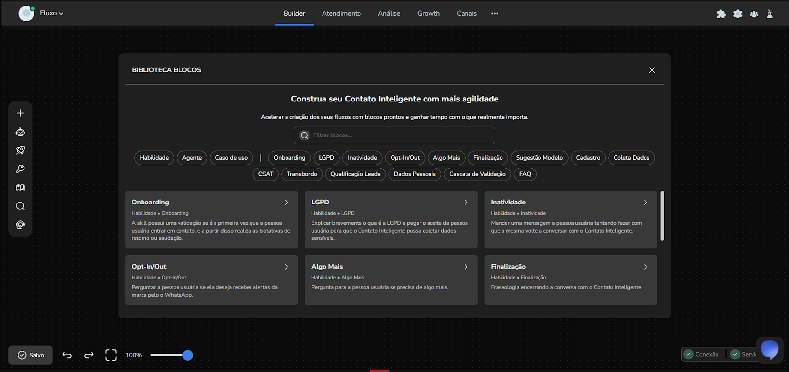 Bibliotecas blocos - Habilidades prontas 23 de janeiro de 2026 19:01 Atualizado Índice: Introdução Conceitos básicos Visão macro A biblioteca Habilidades Agente Cadastro Caso de uso IntroduçãoA biblioteca de blocos foi criada para facilitar o dia a dia de quem precisa construir um contato inteligente sem ter um profundo domínio técnico e precisa de velocidade para publicar. Com ela, será possível aplicar tanto habilidades determinísticas básicas como Onboarding, LGPD, Inatividade, Cascata de validação, Algo mais, Finalização e CSAT quanto estruturas utilizando os agentes builder. Conceitos básicosA estrutura para a utilização dos blocos prontos é pensada na arquitetura de roteador para o bom funcionamento em que cada conjunto de blocos prontos ficará dentro de um builder/Studio conectados a um roteador. Dessa forma o contato inteligente fica de fácil manutenção e evolução. É possível utilizar os blocos prontos dentro de um único builder/Studio? Sim é possível, mas existirá um desafio para fazer evoluções e manutenções devido a interconexão entres os blocos, que caso precise editar uma parte específica da estrutura será necessário entender quais outras partes que estão conectadas a parte que será editada ou evoluída assim causando um gasto de tempo elevado para configurar. Visão macroÉ importante antes de começar a utilizar a biblioteca ter bem definida a estrutura conversacional que será feita e como as partes dessa conversa vão interagir entre si. Normalmente uma conversa tem um início, meio e fim seguindo um objetivo principal. A visão macro é muito parecida com fluxogramas de BPMN. Nessa visão é importante visualizar os caminhos, os gatilhos de decisão e ter símbolos que representam os eventos dentro da estrutura da conversa. A bibliotecaA biblioteca de blocos está dividida em Habilidades, Agentes e Casos de uso. Habilidade é um conjunto de blocos padrão com um objetivo específico dentro da conversa do contato inteligente. Agente pode ser um bloco de agente ou um conjunto de blocos agentes e blocos padrão, sendo que os blocos de agente são fundamentais para o objetivo específico dentro do contato inteligente Caso de uso é um conjunto de habilidades e agentes para um objetivo específico dentro de uma jornada do contato inteligente. Cada opção dentro da biblioteca está com uma tag e pode ser buscada na barra de busca como representado na imagem abaixo: Os blocos prontos Habilidades: Onboarding LGPD Inatividade Opt-In/Out Algo Mais Finalização CSAT Transbordo Dados Pessoais Cascata de Validação Agente: Caso de uso: Cadastro Qualificação de Leads HabilidadesOnboardingOrienta e dá boas-vindas ao usuário, explicando como começar a usar o serviço e realiza as tratativas de saudação ou retorno e se a LGPD já foi respondida. Bloco | [LOGIC] A.1.0.0 Validação de entrada É utilizado a variável {isNewUser} dentro das condições de saída para entender se é a primeira vez que a pessoa está conversando com o contato e direcionar para o bloco correspondente. Ação registro de eventos de origem Bloco | [MSG] A.2.0.0 Sim validação Conteúdo de mensagem de primeiro acesso do usuário, ações de registro de eventos de origem e exibição e definição da variável {isNewUser} nas ações. A condição de saída é apenas se a resposta do usuário existe. Bloco | [MSG] A.3.0.0 Não validação Conteúdo de mensagem de retorno do usuário, ações de registro de eventos de origem e exibição. A condição de saída é apenas se a resposta do usuário existe. Bloco | [LOGIC]LP.1.0.0 - LGPD Validação Validação se a pessoa já respondeu os termos da LGPD. Através da validação se a variável {userAceptedPrivacyPolicy} existe e se é igual a resposta do usuário foi sim ou não o aceite. Ação de registro de eventos de origem, LGPD validação e LGPD não respondeu. Bloco | REDIRECT SERVICE Ação de redirecionamento de serviço para um outro serviço/habilidade dentro da ação de saída. LGPD:Explica brevemente o que é a LGPD e coleta o aceite da pessoa usuária para que o Contato Inteligente possa coletar dados sensíveis. Bloco | [START] Entrada da habilidade utilizando a condição de saída se a variável {input.content@redirectId} existe e direciona pelo ID do bloco. Bloco | [INPUT] LP.2.0.0 - LGPD Descrição sobre a LGPD com o link para ver com mais detalhes junto com as opções para a pessoa selecionar se aceita, não aceita e saber mais. Bloco | [LOGIC] LP.2.0.0 - [Não] Aceite LGPD Faz a validação através de um script da opção escolhida. Bloco | GOTO LP.2.0.0 - Service Name Redireciona para o serviço/habilidade caso a pessoa tenha aceitado os termos do acordo. Bloco | [INPUT] LP.3.0.0 - Não concorda com LGPD Se a pessoa não aceitar os termos é mostrado uma mensagem reforçando que é necessário o aceite para continuar com a conversa. Apresenta as mesmas opção e sim, não e saber mais Bloco | LP.4.0.0 - Saber Mais Detalhamento sobre a LGPD Bloco | [LOGIC] LP.3.0.0 - Não concorda com LGPD Faz a validação através de um script da opção escolhida. Bloco | GOTO LP.3.0.0 - Service Name Redireciona para o serviço/habilidade caso a pessoa tenha aceitado os termos do acordo. Bloco | REDIRECT SERVICE Ação de redirecionamento de serviço para um outro serviço/habilidade dentro da ação de saída. Bloco | Redirect Inatividade Redirecionamento para a habilidade de inatividade e retornar para o ponto onde está esperando um input do usuário. Inatividade: Manda uma mensagem para resgatar a conversa do usuário com o Contato Inteligente após período inativo. Bloco | [INPUT] I.1.0.0 - Inatividade Mostra a mensagem e solicita se a pessoa quer continuar na conversa Bloco | [LOGIC] I.1.0.0 - Inatividade Através da variável {setValidation} é feita a validação para entender se a pessoa irá continuar ou não no fluxo Bloco | [INPUT] I.1.2.0 Encerramento Conteúdo de Mensagem de finalizaç