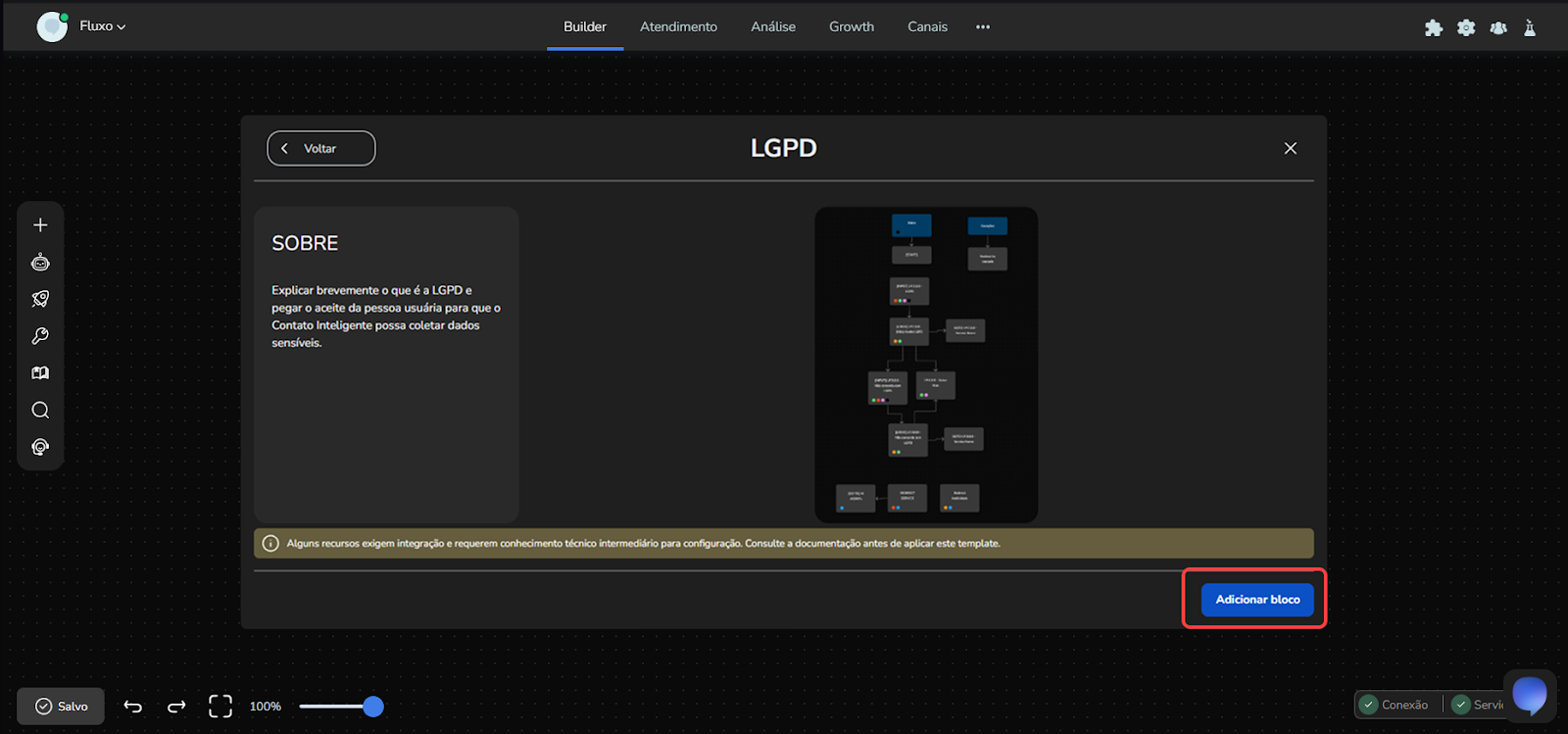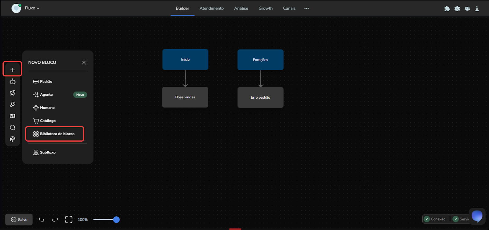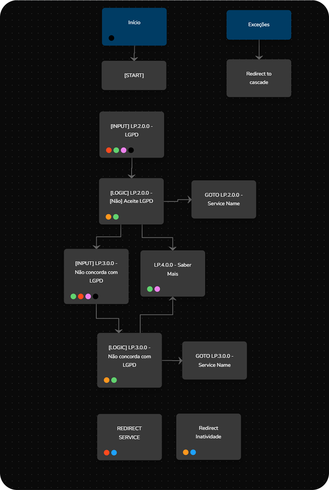 Bibliotecas blocos - Habilidades prontas 23 de janeiro de 2026 19:01 Atualizado Índice: Introdução Conceitos básicos Visão macro A biblioteca Habilidades Agente Cadastro Caso de uso IntroduçãoA biblioteca de blocos foi criada para facilitar o dia a dia de quem precisa construir um contato inteligente sem ter um profundo domínio técnico e precisa de velocidade para publicar. Com ela, será possível aplicar tanto habilidades determinísticas básicas como Onboarding, LGPD, Inatividade, Cascata de validação, Algo mais, Finalização e CSAT quanto estruturas utilizando os agentes builder. Conceitos básicosA estrutura para a utilização dos blocos prontos é pensada na arquitetura de roteador para o bom funcionamento em que cada conjunto de blocos prontos ficará dentro de um builder/Studio conectados a um roteador. Dessa forma o contato inteligente fica de fácil manutenção e evolução. É possível utilizar os blocos prontos dentro de um único builder/Studio? Sim é possível, mas existirá um desafio para fazer evoluções e manutenções devido a interconexão entres os blocos, que caso precise editar uma parte específica da estrutura será necessário entender quais outras partes que estão conectadas a parte que será editada ou evoluída assim causando um gasto de tempo elevado para configurar. Visão macroÉ importante antes de começar a utilizar a biblioteca ter bem definida a estrutura conversacional que será feita e como as partes dessa conversa vão interagir entre si. Normalmente uma conversa tem um início, meio e fim seguindo um objetivo principal. A visão macro é muito parecida com fluxogramas de BPMN. Nessa visão é importante visualizar os caminhos, os gatilhos de decisão e ter símbolos que representam os eventos dentro da estrutura da conversa. A bibliotecaA biblioteca de blocos está dividida em Habilidades, Agentes e Casos de uso. Habilidade é um conjunto de blocos padrão com um objetivo específico dentro da conversa do contato inteligente. Agente pode ser um bloco de agente ou um conjunto de blocos agentes e blocos padrão, sendo que os blocos de agente são fundamentais para o objetivo específico dentro do contato inteligente Caso de uso é um conjunto de habilidades e agentes para um objetivo específico dentro de uma jornada do contato inteligente. Cada opção dentro da biblioteca está com uma tag e pode ser buscada na barra de busca como representado na imagem abaixo: Os blocos prontos Habilidades: Onboarding LGPD Inatividade Opt-In/Out Algo Mais Finalização CSAT Transbordo Dados Pessoais Cascata de Validação Agente: Caso de uso: Cadastro Qualificação de Leads HabilidadesOnboardingOrienta e dá boas-vindas ao usuário, explicando como começar a usar o serviço e realiza as tratativas de saudação ou retorno e se a LGPD já foi respondida. Bloco | [LOGIC] A.1.0.0 Validação de entrada É utilizado a variável {isNewUser} dentro das condições de saída para entender se é a primeira vez que a pessoa está conversando com o contato e direcionar para o bloco correspondente. Ação registro de eventos de origem Bloco | [MSG] A.2.0.0 Sim validação Conteúdo de mensagem de primeiro acesso do usuário, ações de registro de eventos de origem e exibição e definição da variável {isNewUser} nas ações. A condição de saída é apenas se a resposta do usuário existe. Bloco | [MSG] A.3.0.0 Não validação Conteúdo de mensagem de retorno do usuário, ações de registro de eventos de origem e exibição. A condição de saída é apenas se a resposta do usuário existe. Bloco | [LOGIC]LP.1.0.0 - LGPD Validação Validação se a pessoa já respondeu os termos da LGPD. Através da validação se a variável {userAceptedPrivacyPolicy} existe e se é igual a resposta do usuário foi sim ou não o aceite. Ação de registro de eventos de origem, LGPD validação e LGPD não respondeu. Bloco | REDIRECT SERVICE Ação de redirecionamento de serviço para um outro serviço/habilidade dentro da ação de saída. LGPD:Explica brevemente o que é a LGPD e coleta o aceite da pessoa usuária para que o Contato Inteligente possa coletar dados sensíveis. Bloco | [START] Entrada da habilidade utilizando a condição de saída se a variável {input.content@redirectId} existe e direciona pelo ID do bloco. Bloco | [INPUT] LP.2.0.0 - LGPD Descrição sobre a LGPD com o link para ver com mais detalhes junto com as opções para a pessoa selecionar se aceita, não aceita e saber mais. Bloco | [LOGIC] LP.2.0.0 - [Não] Aceite LGPD Faz a validação através de um script da opção escolhida. Bloco | GOTO LP.2.0.0 - Service Name Redireciona para o serviço/habilidade caso a pessoa tenha aceitado os termos do acordo. Bloco | [INPUT] LP.3.0.0 - Não concorda com LGPD Se a pessoa não aceitar os termos é mostrado uma mensagem reforçando que é necessário o aceite para continuar com a conversa. Apresenta as mesmas opção e sim, não e saber mais Bloco | LP.4.0.0 - Saber Mais Detalhamento sobre a LGPD Bloco | [LOGIC] LP.3.0.0 - Não concorda com LGPD Faz a validação através de um script da opção escolhida. Bloco | GOTO LP.3.0.0 - Service Name Redireciona para o serviço/habilidade caso a pessoa tenha aceitado os termos do acordo. Bloco | REDIRECT SERVICE Ação de redirecionamento de serviço para um outro serviço/habilidade dentro da ação de saída. Bloco | Redirect Inatividade Redirecionamento para a habilidade de inatividade e retornar para o ponto onde está esperando um input do usuário. Inatividade: Manda uma mensagem para resgatar a conversa do usuário com o Contato Inteligente após período inativo. Bloco | [INPUT] I.1.0.0 - Inatividade Mostra a mensagem e solicita se a pessoa quer continuar na conversa Bloco | [LOGIC] I.1.0.0 - Inatividade Através da variável {setValidation} é feita a validação para entender se a pessoa irá continuar ou não no fluxo Bloco | [INPUT] I.1.2.0 Encerramento Conteúdo de Mensagem de finalizaç