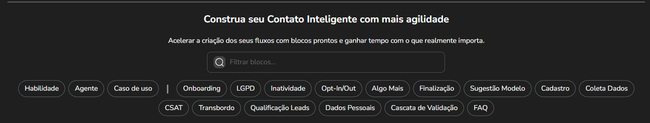 Bibliotecas blocos - Habilidades prontas 10 de março de 2026 12:02 Atualizado Índice: Introdução Conceitos básicos Visão macro A biblioteca Habilidades Agente Cadastro Caso de uso IntroduçãoA biblioteca de blocos foi criada para facilitar o dia a dia de quem precisa construir um contato inteligente sem ter um profundo domínio técnico e precisa de velocidade para publicar. Com ela, será possível aplicar tanto habilidades determinísticas básicas como Onboarding, LGPD, Inatividade, Cascata de validação, Algo mais, Finalização e CSAT quanto estruturas utilizando os agentes Studio. Conceitos básicosPara garantir o bom funcionamento, os blocos prontos são estruturados em uma arquitetura de roteador, com cada conjunto alocado em um Studio específico. Isso torna a manutenção e a evolução do fluxo muito mais fáceis.É possível utilizar os blocos prontos dentro de um único Studio? Sim, é possível, mas a alta interconexão entre os blocos torna a manutenção complexa. Editar uma parte específica exige entender e revisar toda a estrutura conectada, gerando um esforço e tempo alto para configuração. Visão macroAntes de utilizar a biblioteca, é importante definir a estrutura conversacional e a interação entre suas partes. Uma conversa deve ter início, meio e fim orientados a um objetivo principal. Na visão macro, muito semelhante aos fluxogramas BPMN, é necessário mapear os caminhos, os gatilhos de decisão e criar símbolos que representam cada evento do fluxo de conversa.A bibliotecaA biblioteca de blocos está organizada em Habilidades, Agentes e Casos de Uso: Habilidade: Conjunto de blocos padrão com uma finalidade específica dentro do fluxo do contato inteligente. Agente: Composto por um bloco de agente ou um conjunto de bloco de agente + blocos padrões. Os blocos de agente são fundamentais para atingir objetivos específicos no contato inteligente. Caso de Uso: Combinação de habilidades e agentes projetada para atender um objetivo especifico dentro da jornada do usuário. Cada recurso possui uma tag de identificação dentro da biblioteca e pode ser localizado rapidamente pela barra de busca, conforme ilustrado abaixo: Os blocos prontos Habilidades: Onboarding LGPD Inatividade Opt-In/Out Algo Mais Finalização CSAT Transbordo Dados Pessoais Cascata de Validação Agente: Caso de uso: Cadastro Qualificação de Leads HabilidadesOnboardingRecepciona o usuário com saudações de boas-vindas ou de retorno, verifica o status de consentimento da LGPD e orienta sobre como utilizar o serviço. Bloco | [LOGIC] A.1.0.0 Validação de entrada Utiliza-se a variável {isNewUser} nas condições de saída para identificar se é o primeiro contato do usuário, direcionando-o ao bloco correspondente. Há uma ação de registro de eventos para identificar a origem do usuário. Bloco | [MSG] A.2.0.0 Sim validação Exibe a mensagem de boas-vindas ao usuário e executa o registro de eventos (origem e exibição), além de definir a variável {isNewUser}. A condição de saída é ativada apenas se há resposta do usuário. Bloco | [MSG] A.3.0.0 Não validação Exibe mensagem de retorno para o usuário e executa o registro de eventos (origem e exibição). A condição de saída é ativada apenas se há resposta do usuário. Bloco | [LOGIC]LP.1.0.0 - LGPD Validação Verifica se o usuário já aceitou os termos da LGPD através da variável {userAceptedPrivacyPolicy}. O fluxo valida se a variável existe e se o valor corresponde ao aceite (Sim/Não). As ações incluem o registro de eventos de origem, o status da validação da LGPD. Bloco | REDIRECT SERVICE Executa o redirecionamento para outro serviço ou habilidade por meio de uma ação de saída. LGPD:Apresenta uma breve explicação sobre a LGPD e solicita o consentimento do usuário para o tratamento de dados sensíveis pelo Contato Inteligente. Bloco | [START] Gerencia a entrada na habilidade validando a variável {input.content@redirectId} e encaminhando o usuário ao bloco correspondente via ID. Bloco | [INPUT] LP.2.0.0 - LGPD Apresenta as informações sobre a LGPD, incluindo link para detalhes e um menu de opções para o usuário aceitar, recusar ou solicitar mais informações. Bloco | [LOGIC] LP.2.0.0 - [Não] Aceite LGPD Faz a validação através de um script da opção escolhida. Bloco | GOTO LP.2.0.0 - Service Name Executa o redirecionamento para outro serviço ou habilidade por meio de saída padrão caso o usuário tenha aceitado os termos. Bloco | [INPUT] LP.3.0.0 - Não concorda com LGPD Caso o usuário não aceite os termos, é exibida uma mensagem reforçando a necessidade do aceite para prosseguir. O bloco reapresenta as opções anteriores: "Aceitar", '"Não aceitar" e "Saber mais". Bloco | LP.4.0.0 - Saber Mais É exibido um detalhamento sobre a LGPD. Bloco | [LOGIC] LP.3.0.0 - Não concorda com LGPD Faz a validação através de um script da opção escolhida. Bloco | GOTO LP.3.0.0 - Service Name Executa o redirecionamento para outro serviço ou habilidade por meio de saída padrão caso o usuário tenha aceitado os termos. Bloco | REDIRECT SERVICE Executa o redirecionamento para outro serviço ou habilidade por meio de uma ação de saída. Bloco | Redirect Inatividade Realiza o redirecionamento para a habilidade de inatividade, garantindo o retorno ao ponto de espera de entrada do usuário. Inatividade: Manda uma mensagem para resgatar a conversa do usuário com o Contato Inteligente após período inativo. Bloco | [INPUT] I.1.0.0 - Inatividade Exibe uma mensagem para confirmar se o usuário deseja prosseguir com o atendimento. Bloco | [LOGIC] I.1.0.0 - Inatividade A variável {setValidation} é utilizada para validar a decisão do usuário e determinar a continuidade ou o encerramento do fluxo. Bloco | [INPUT] I.1.2.0 Encerramento Exibe o conteúdo da mensagem de finalização. Bloco | REDIRECT SERVICE Executa o redirecionamento para outro serviço ou habilidade por meio de uma aç